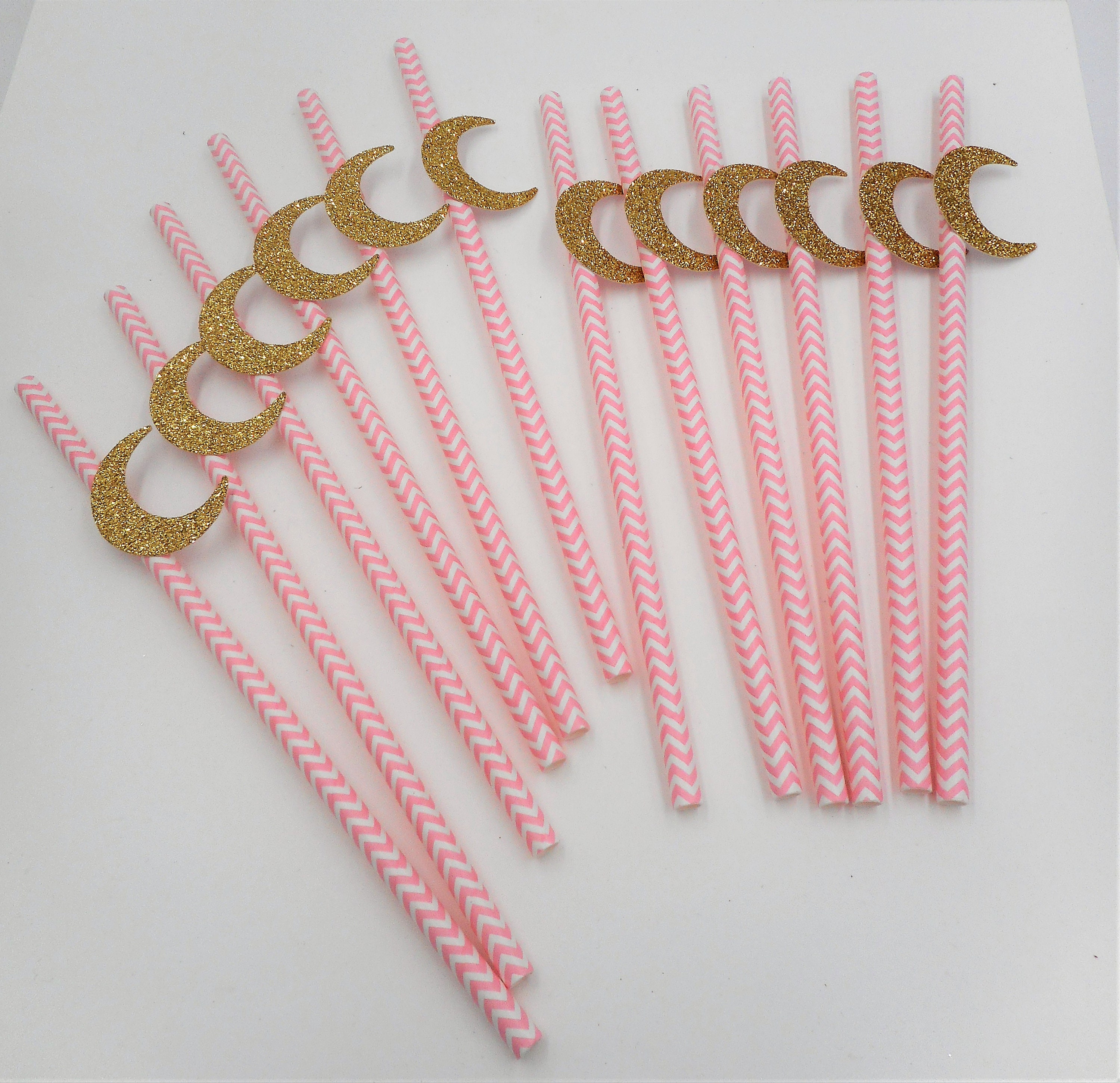 1 Dozen - 12 pc Pink Chevron Print Paper Straws with Gold Glittered Moon Embellishment