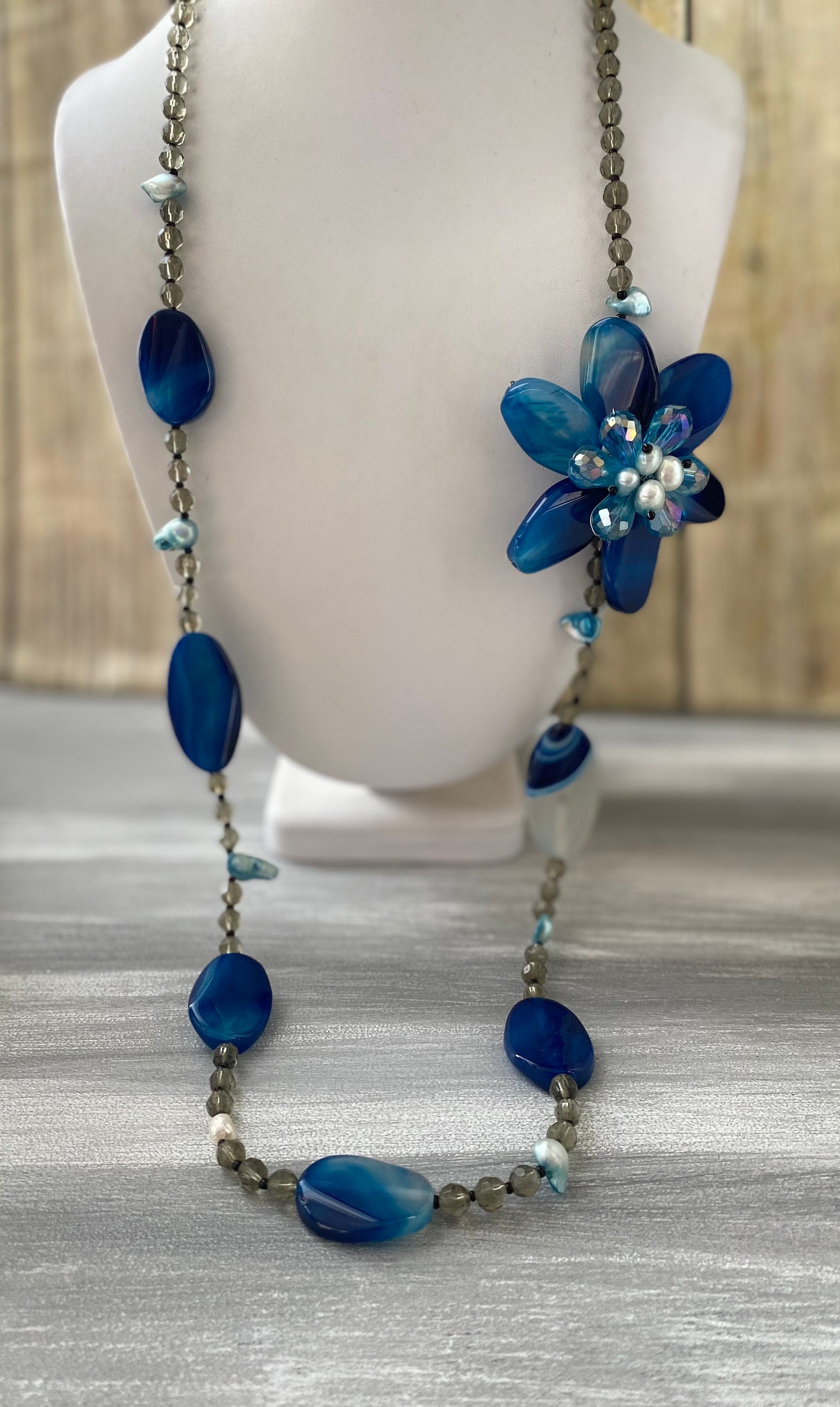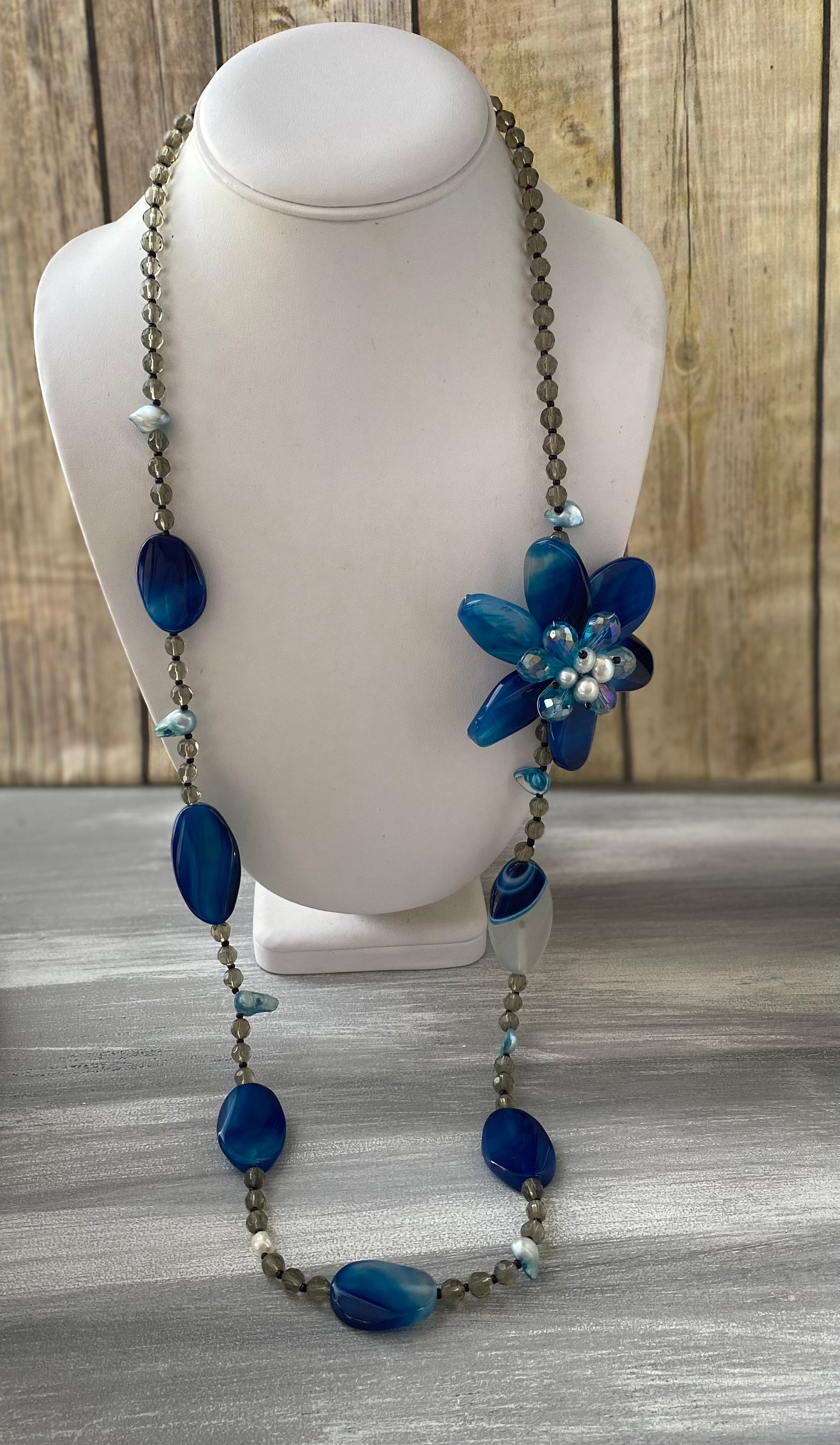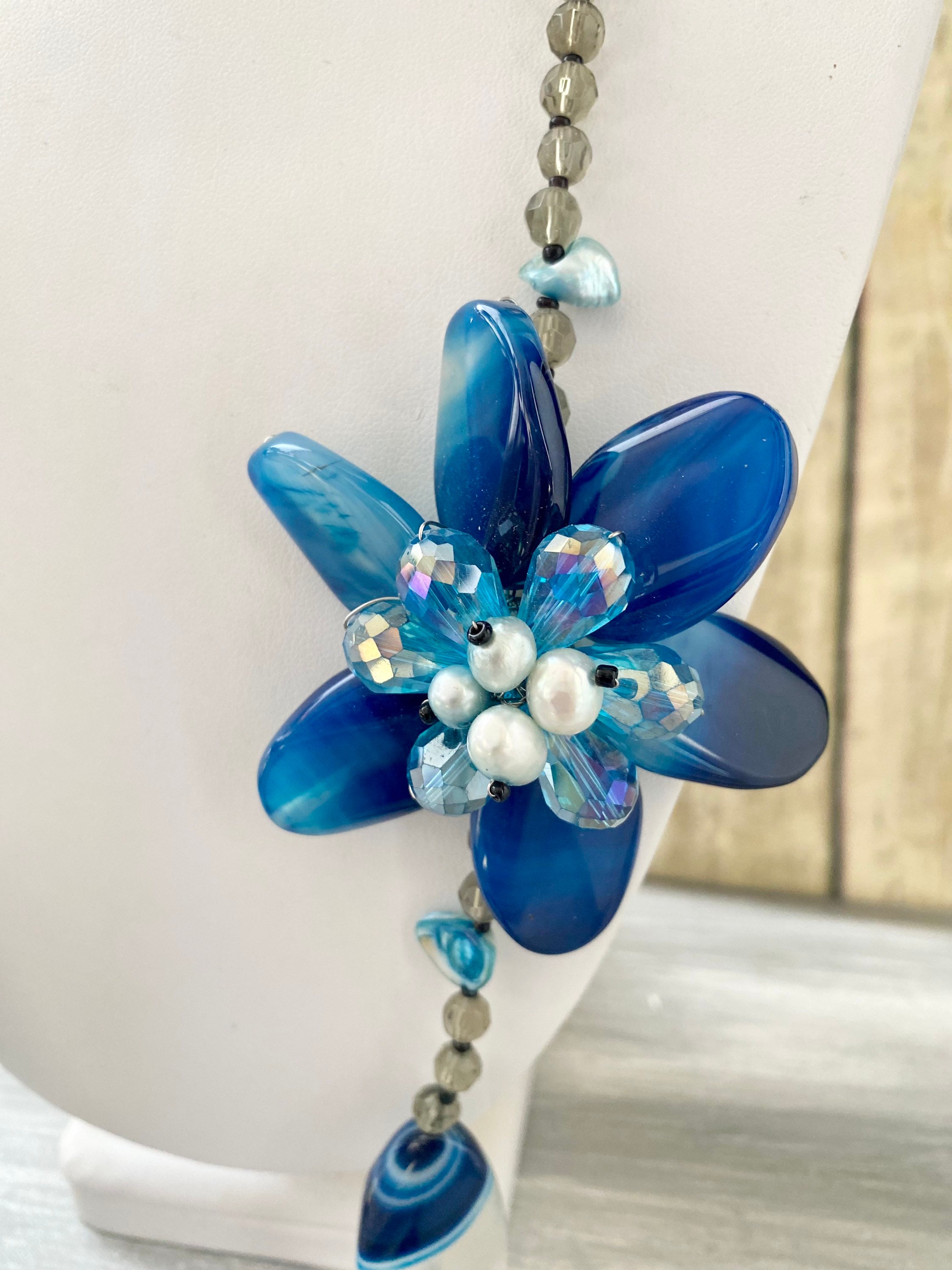 Floral Blue Agate Gemstone & Crystal Beaded Necklace, Chunky Stone Jewelry, Statement Necklace, Agate Necklace, Blue Stone Necklace, 33"
