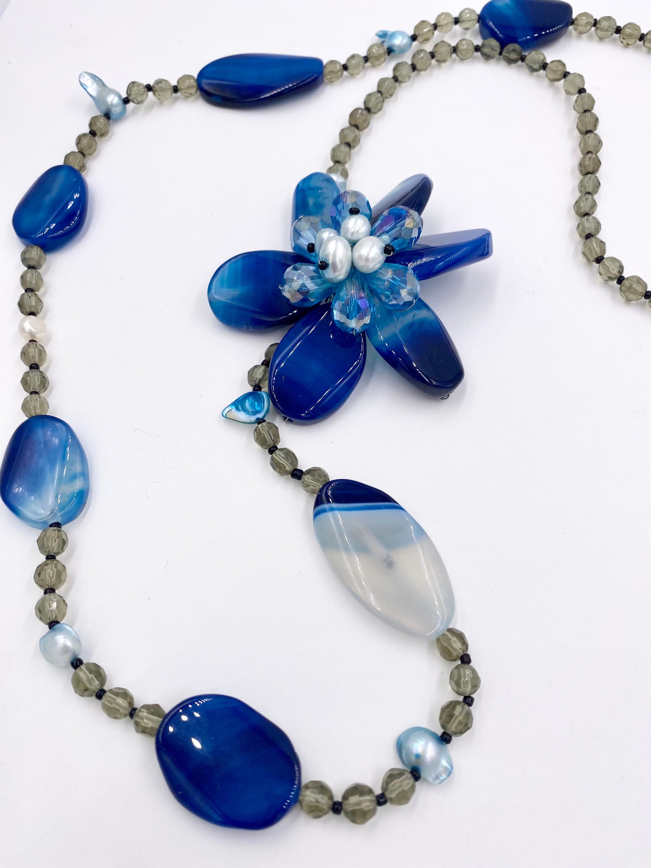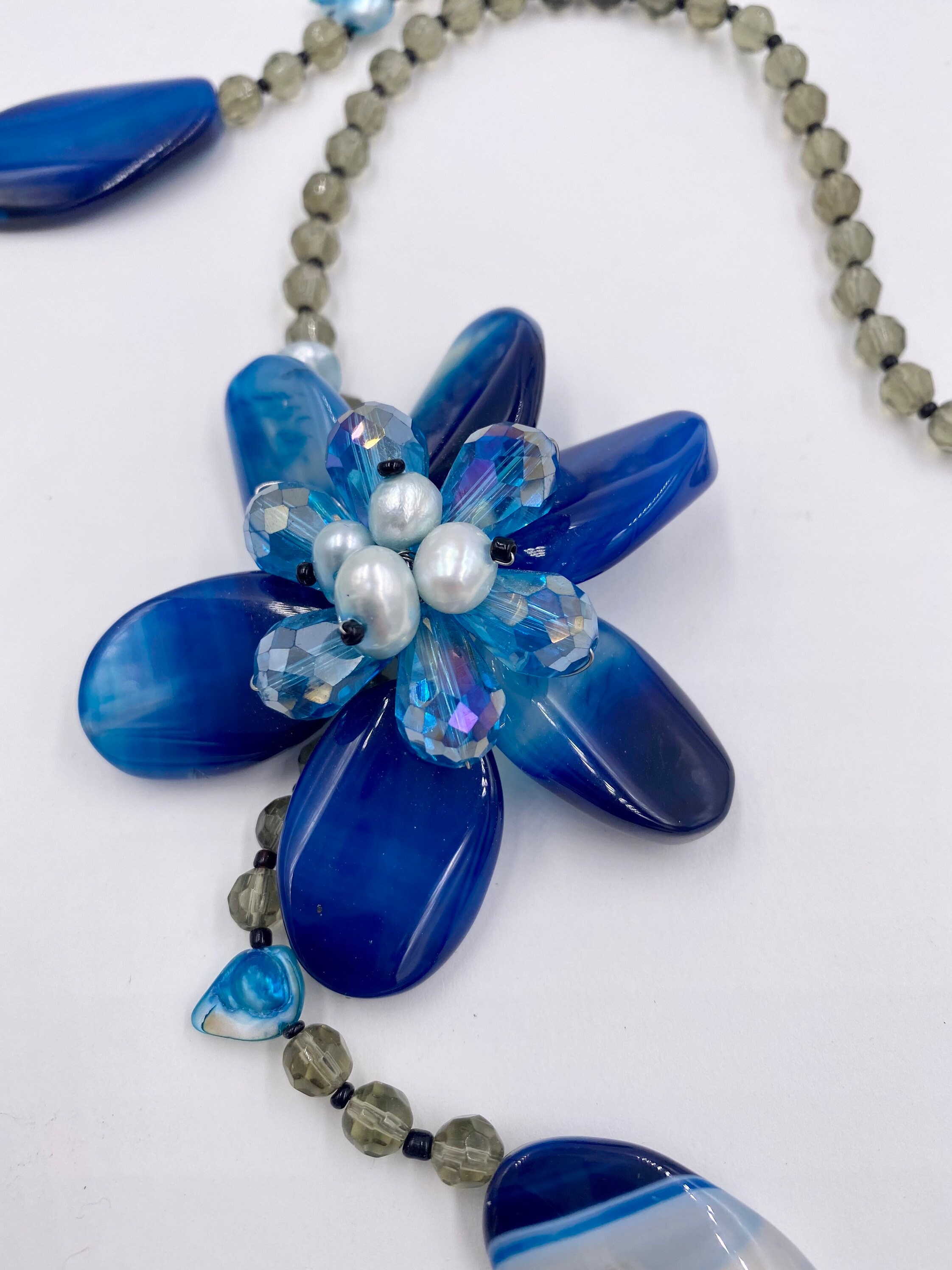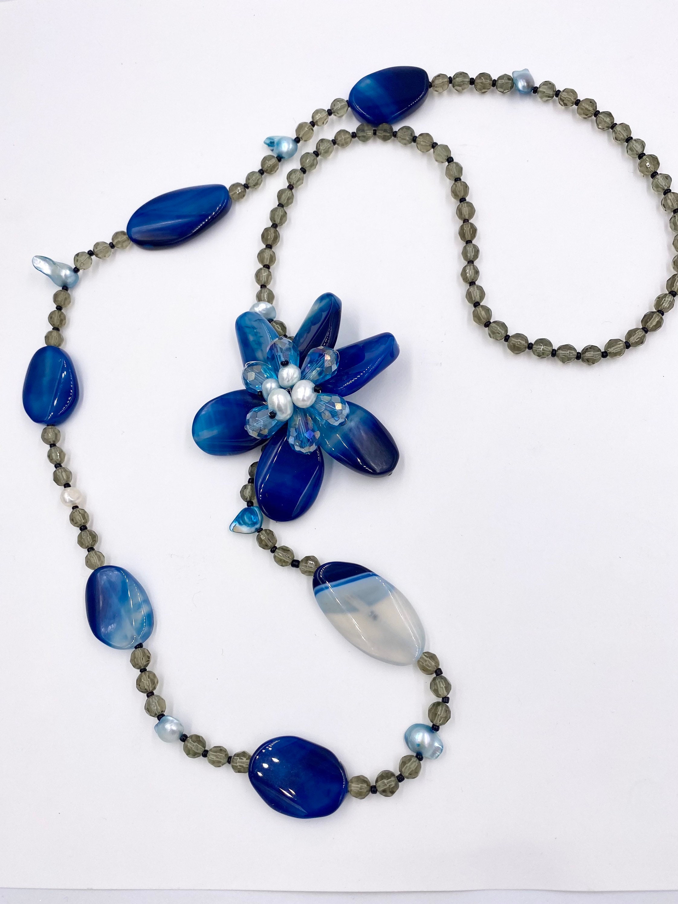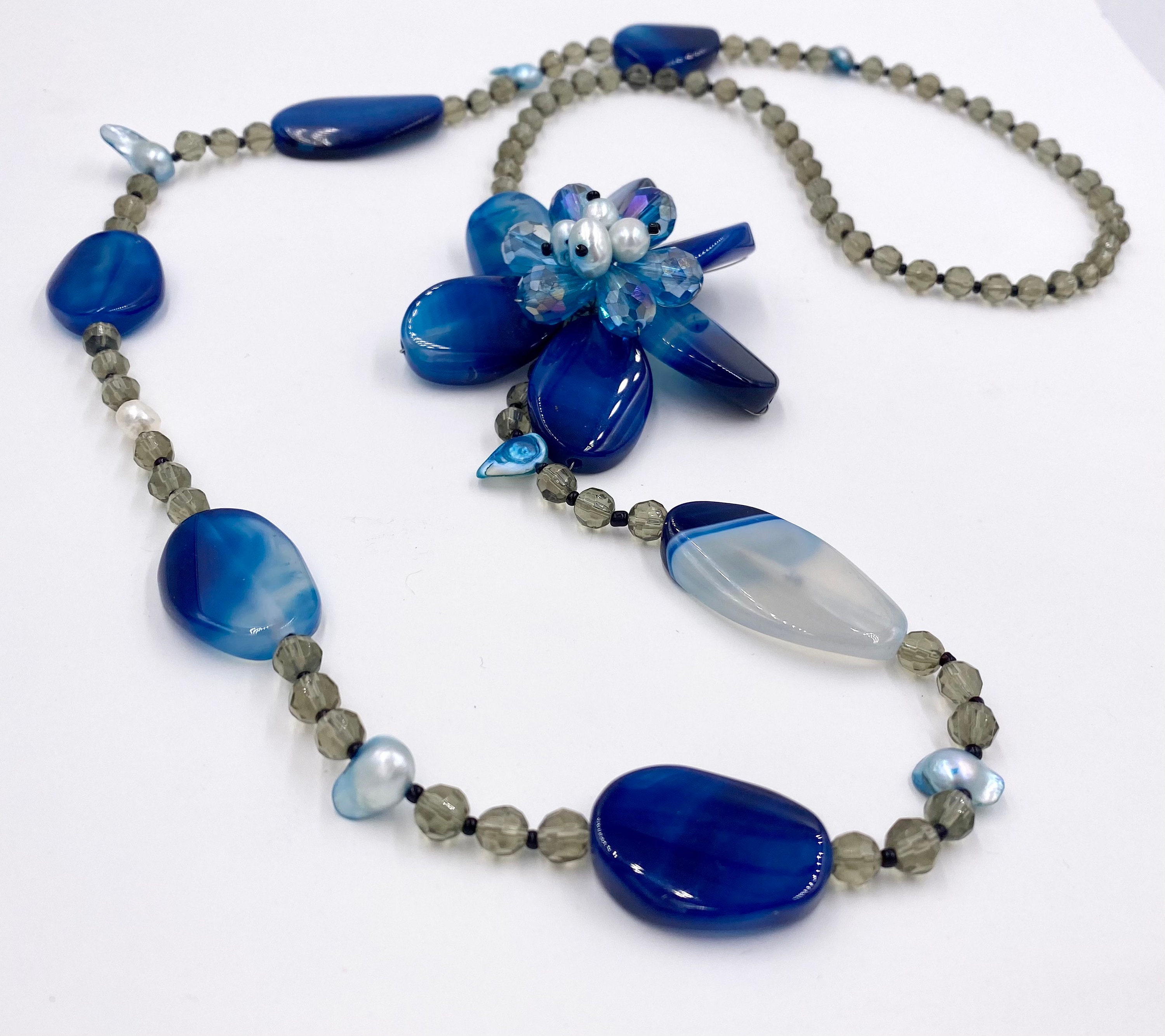 Floral Blue Agate Gemstone & Crystal Beaded Necklace, Chunky Stone Jewelry, Statement Necklace, Agate Necklace, Blue Stone Necklace, 33"