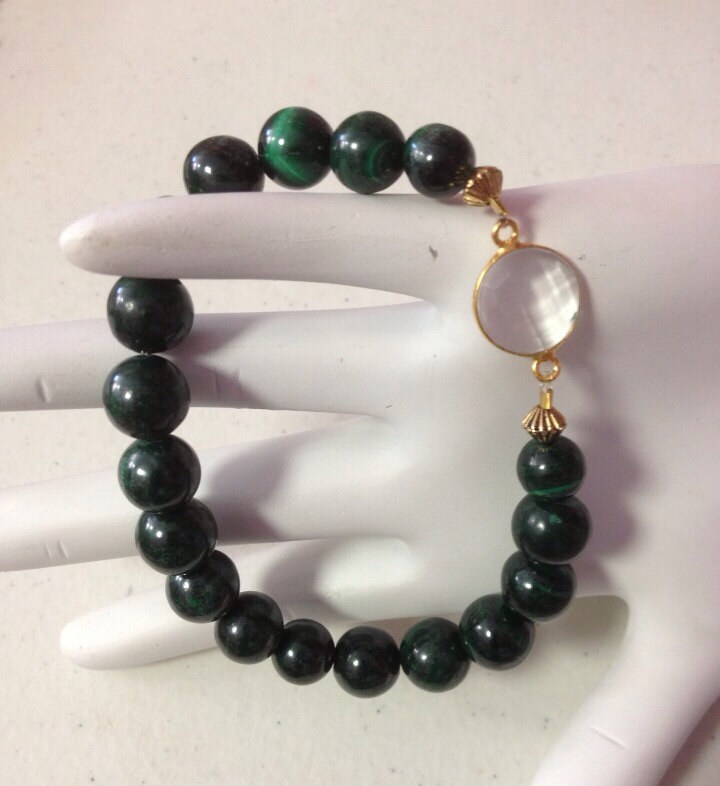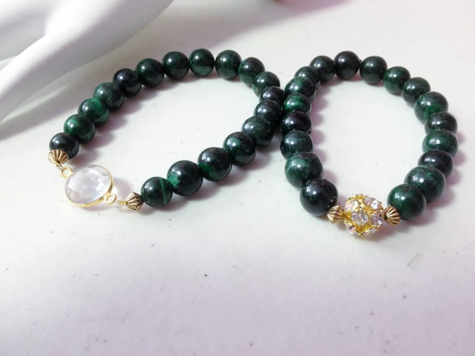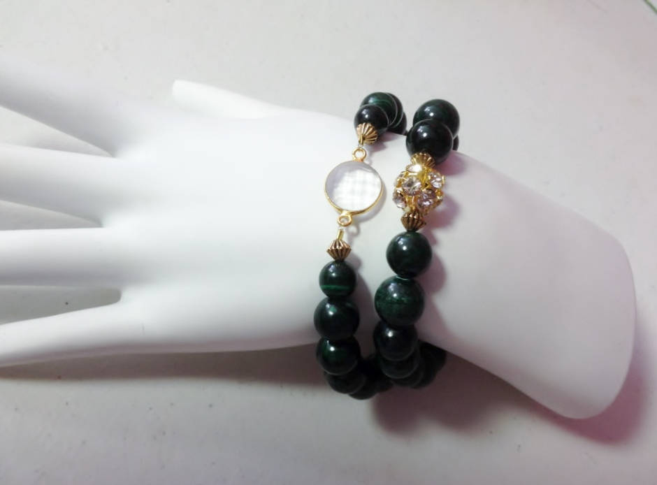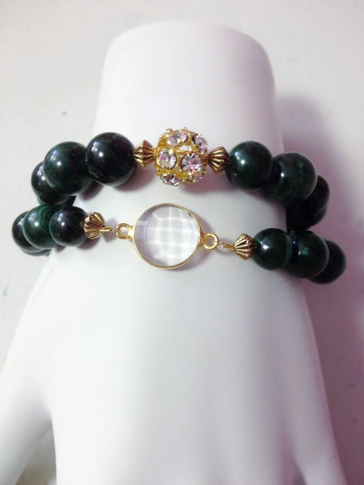 Malachite Bracelet, Faceted Crystal and Malachite Gemstone Bead Stretch Bracelet Set; Reiki Jewelry, Stone Bracelet Set, Beaded Bracelet