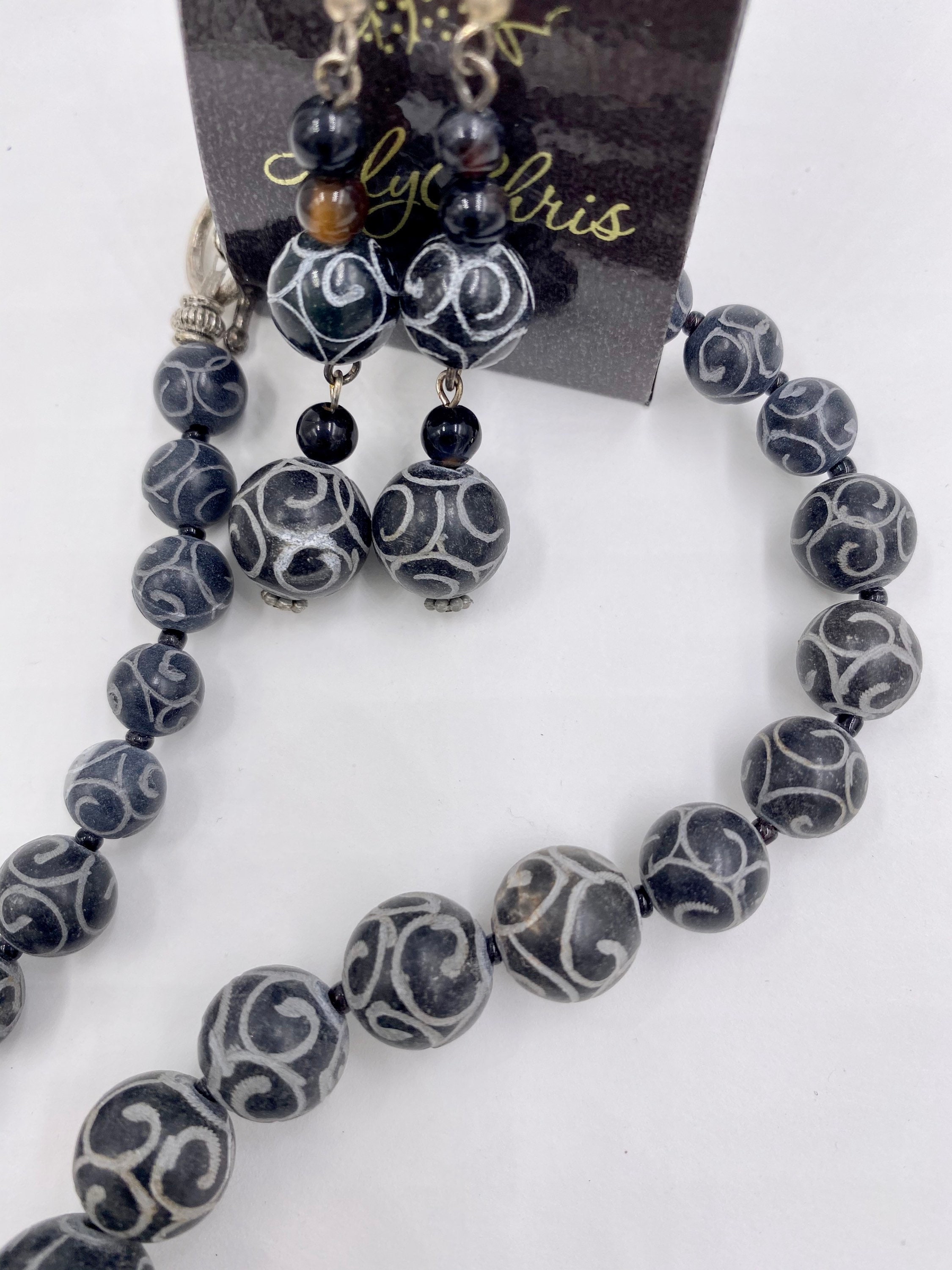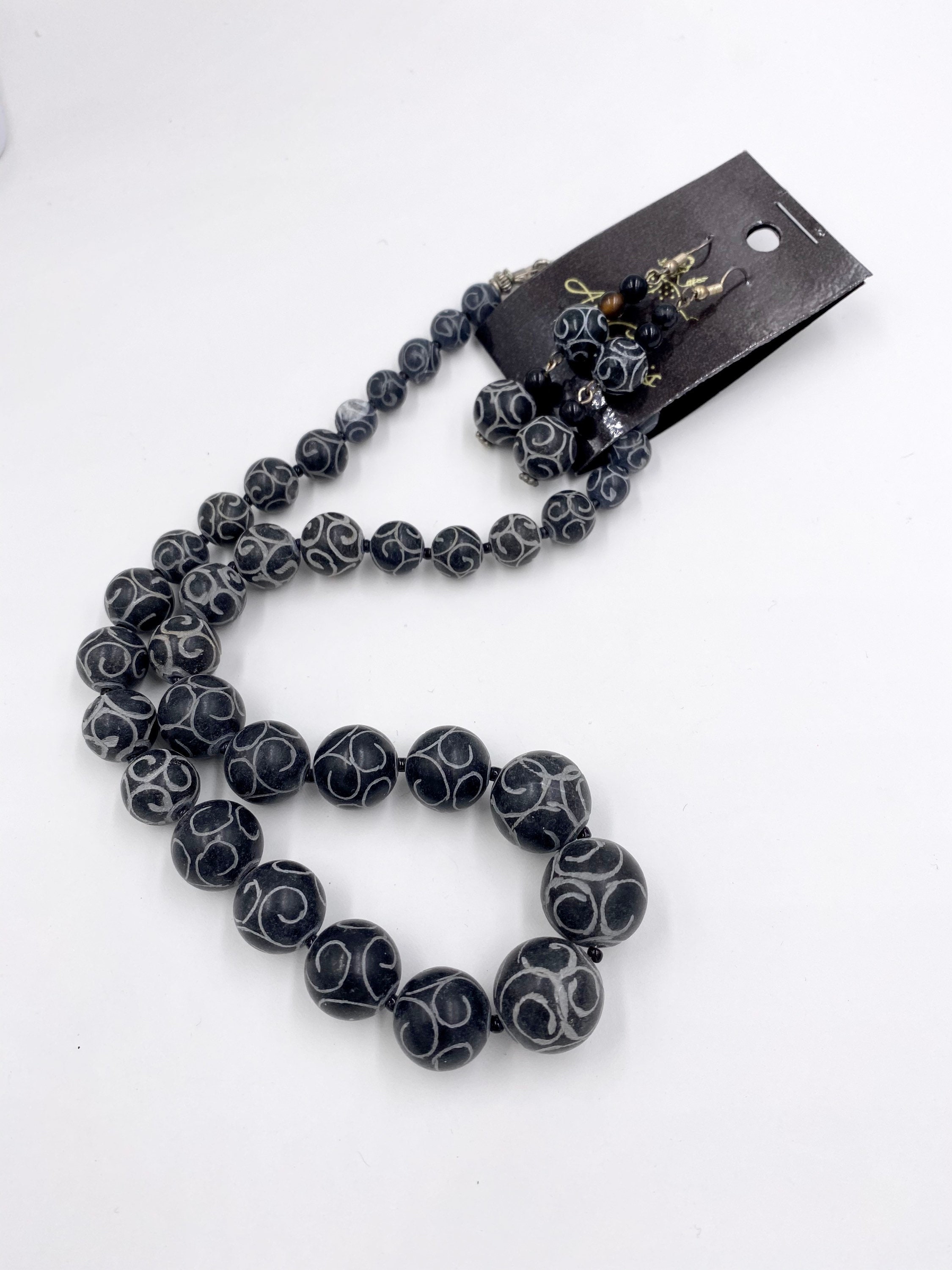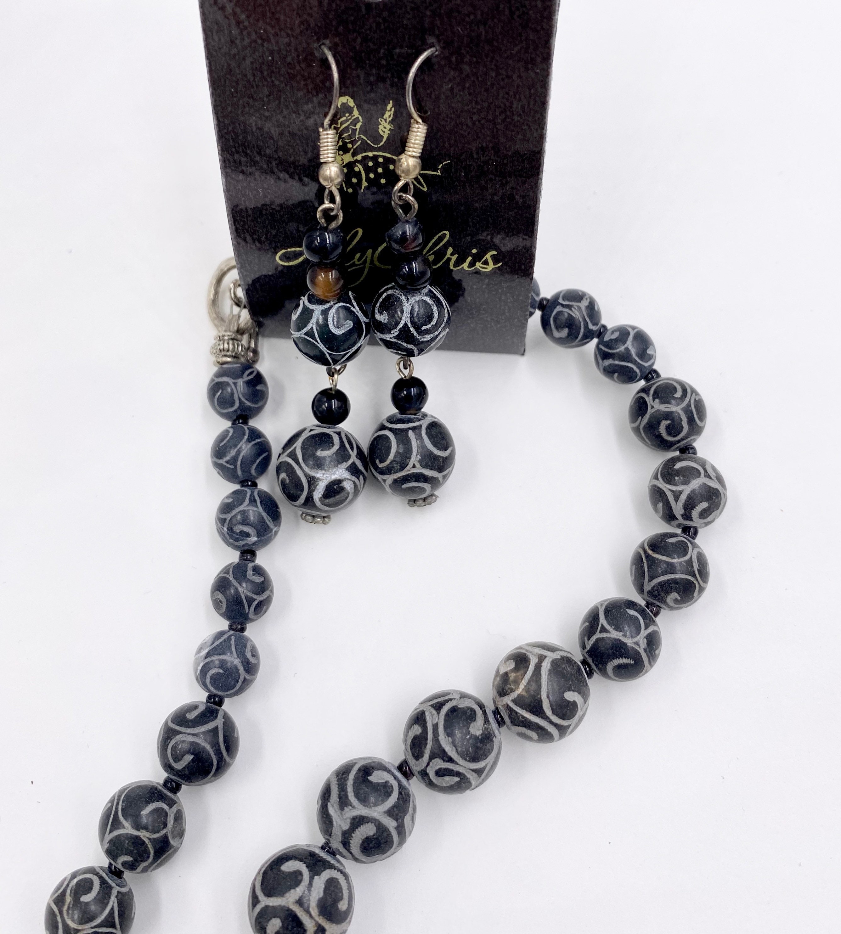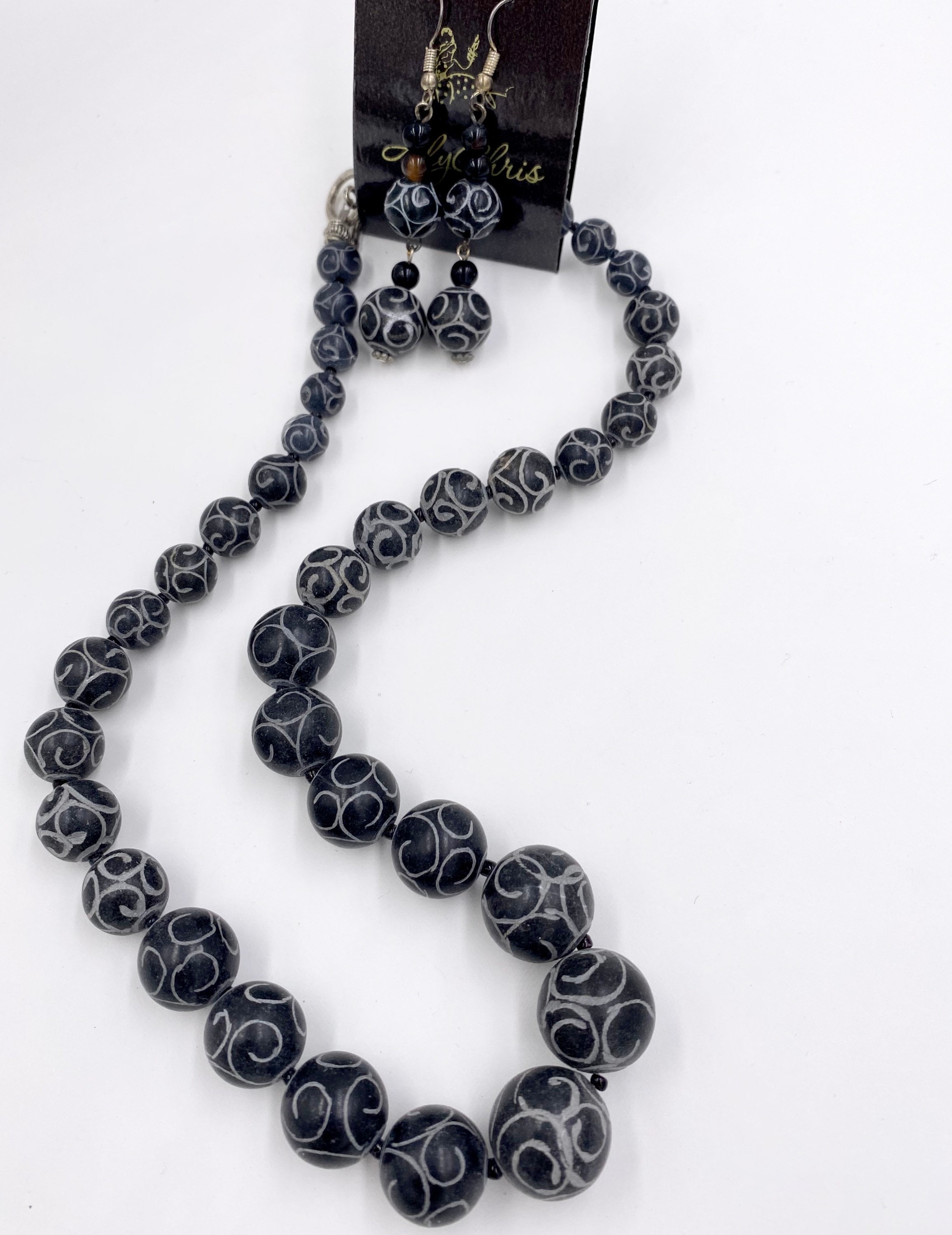 Carved Black Onyx Gemstone Bead Necklace & Earring Set