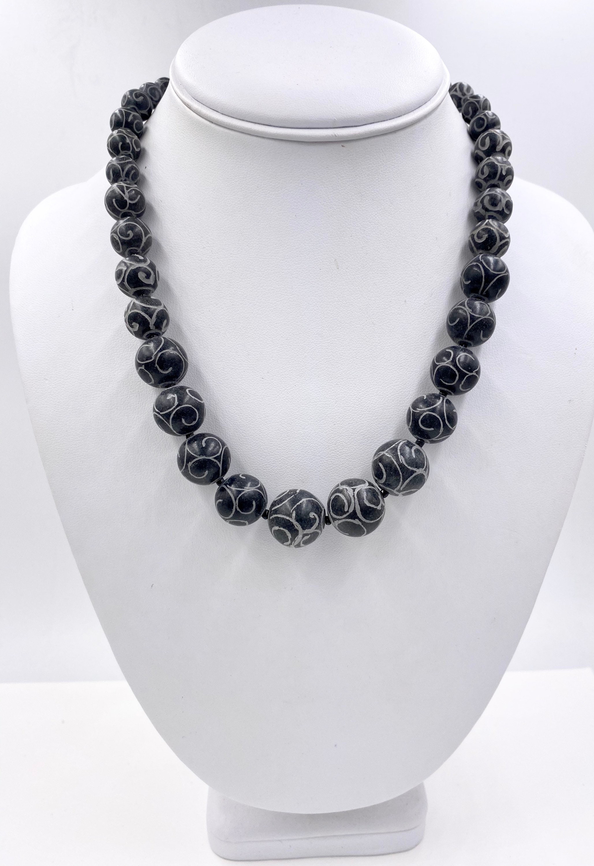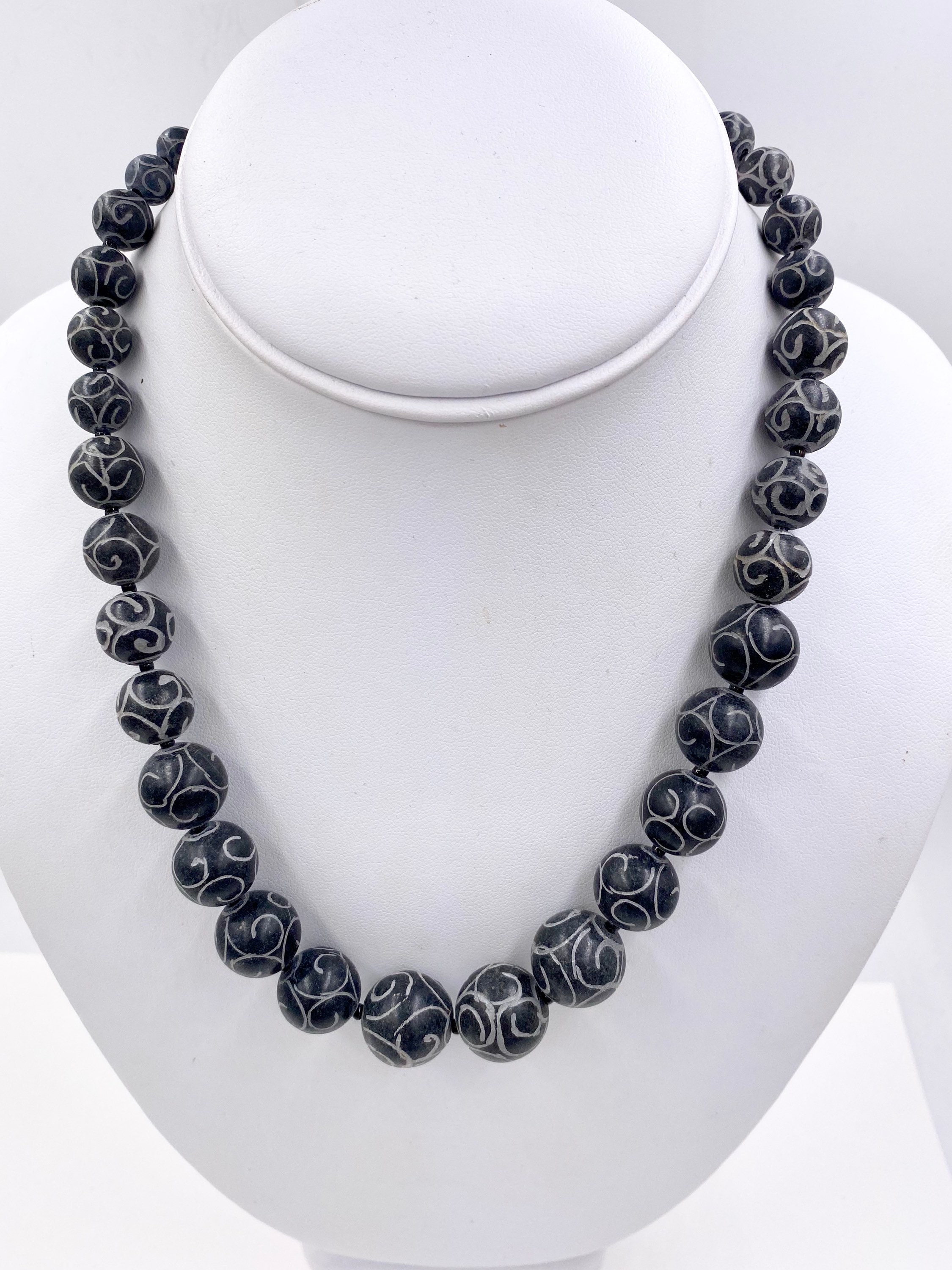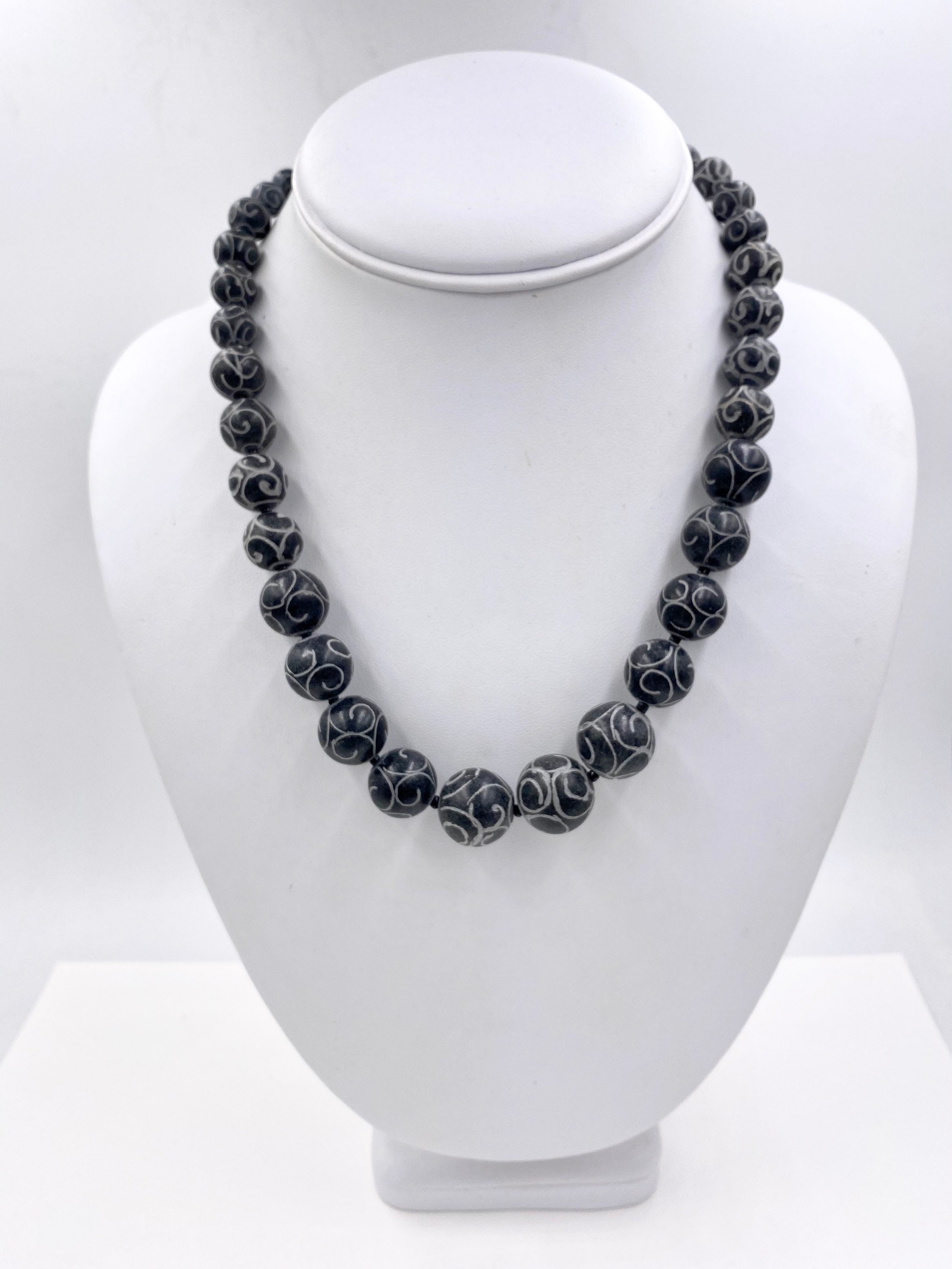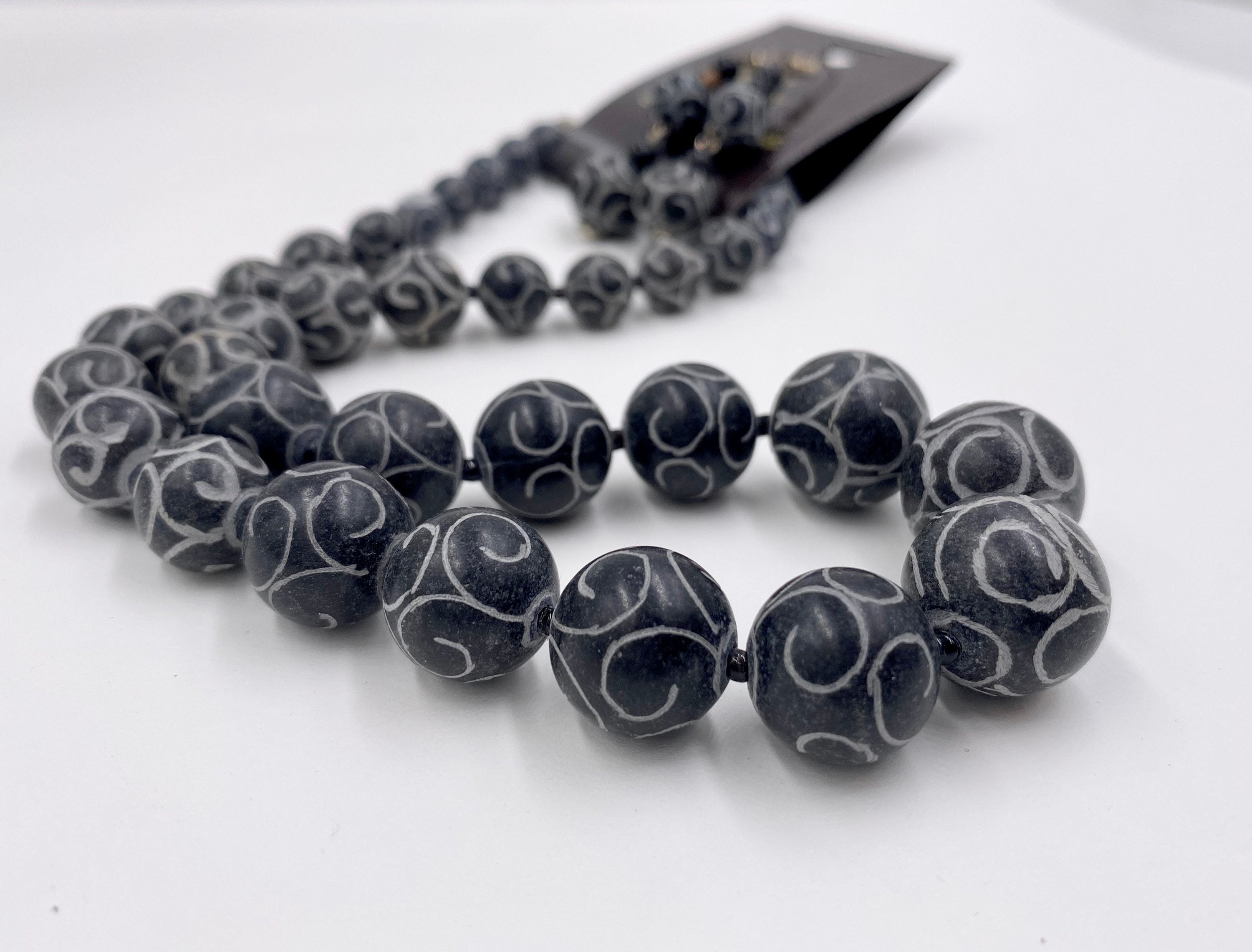 Carved Black Onyx Gemstone Bead Necklace & Earring Set