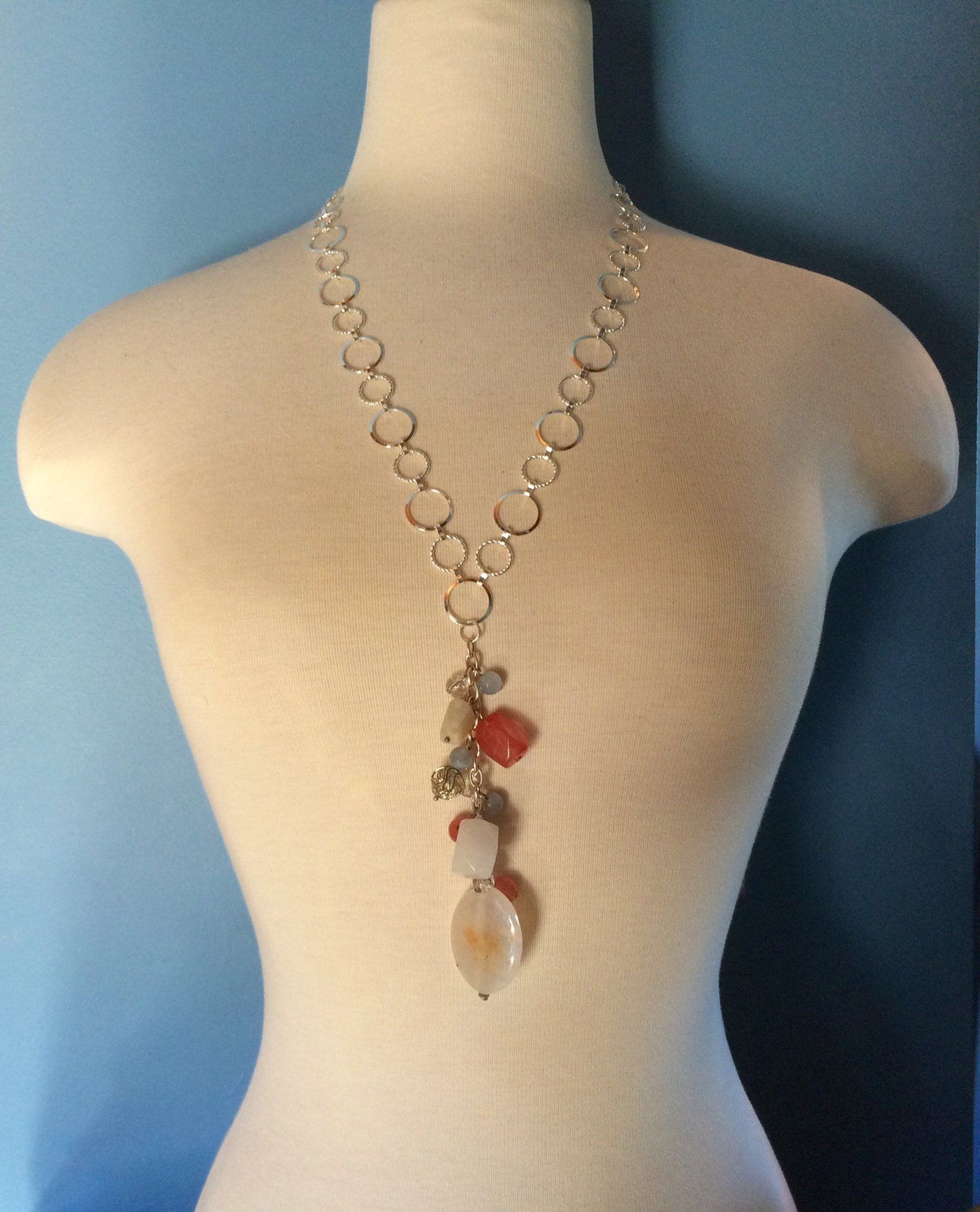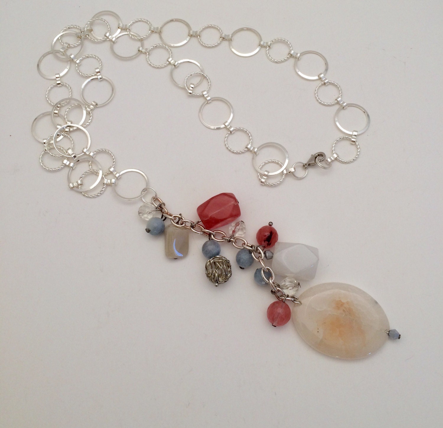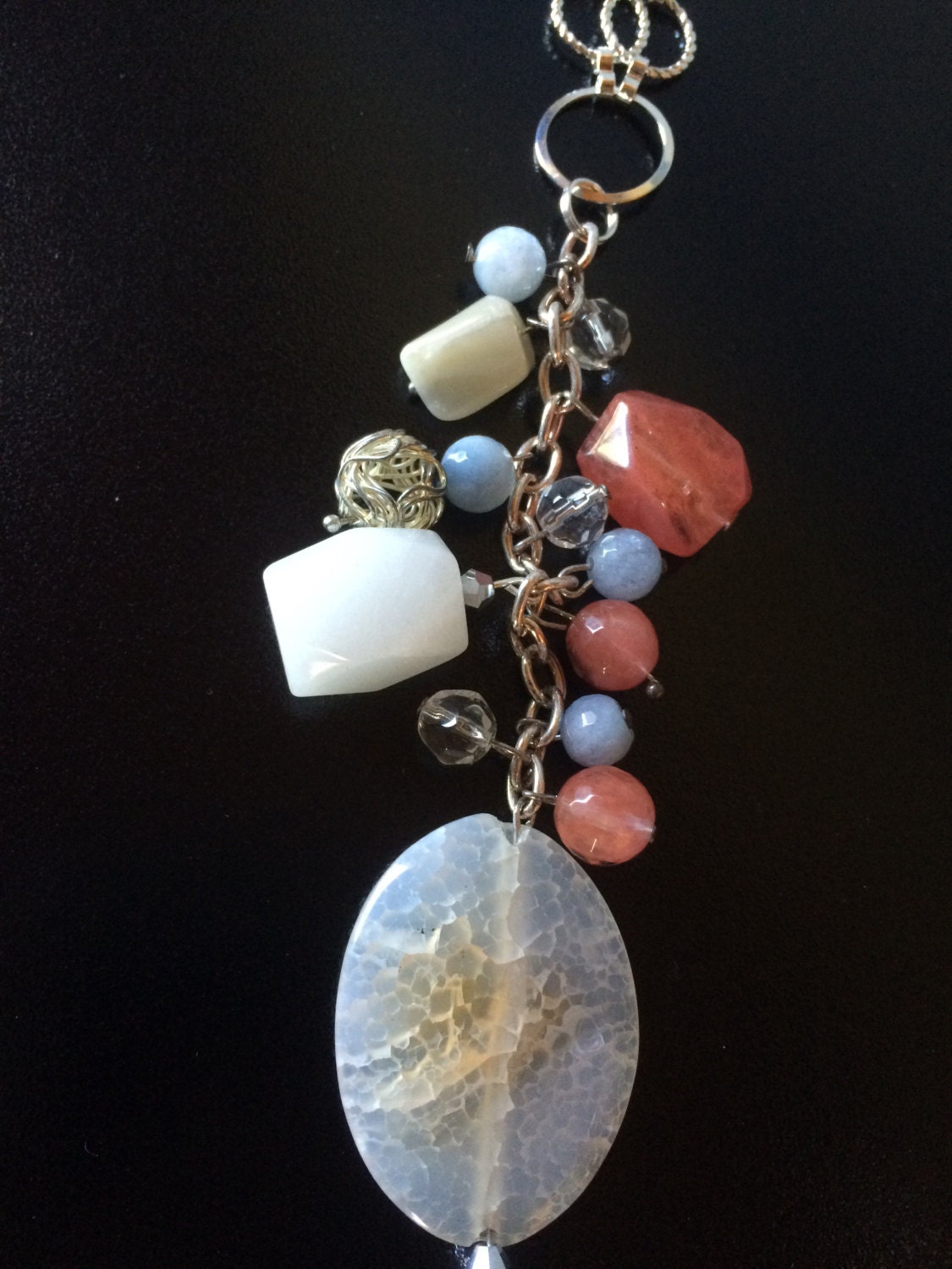 Mixed Gemstone Beaded Pendant: Agate, Rainbow Moonstone, Cherry Quartz, White Milky Jade, & Crystal Beads