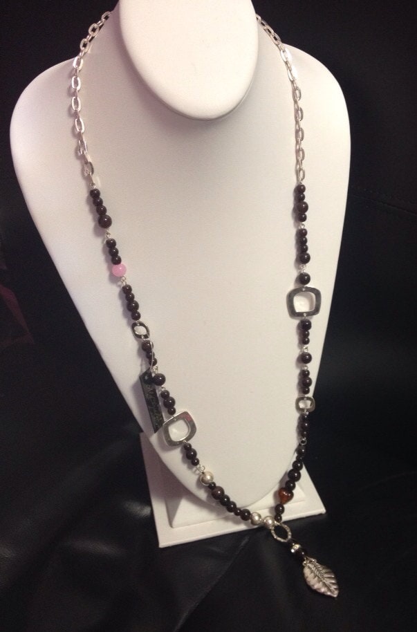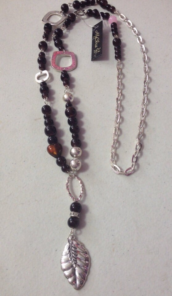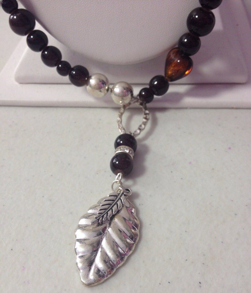 Burgundy Acrylic Bead Glass Heart Charm Necklace, Beaded necklace, Long necklace, layering necklace, leaf charm jewelry
