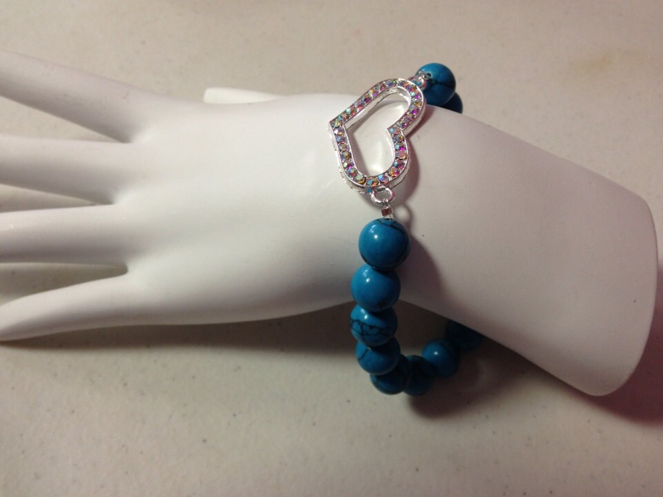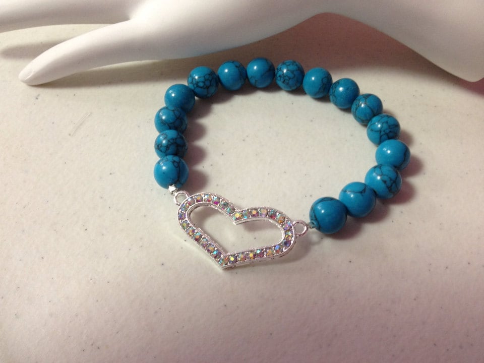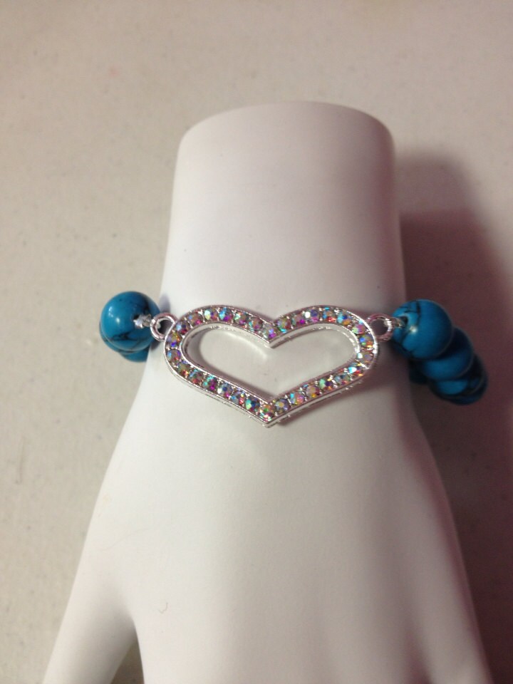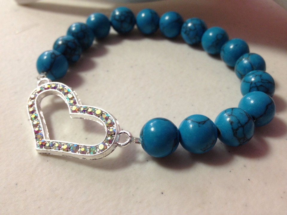 Heart Bracelet, 6 1/2" AB Crystal Pave Heart Charm Turkey Turquoise Gemstone Bead Bracelet, Beaded Bracelet,