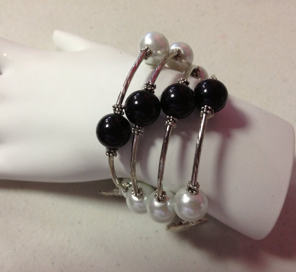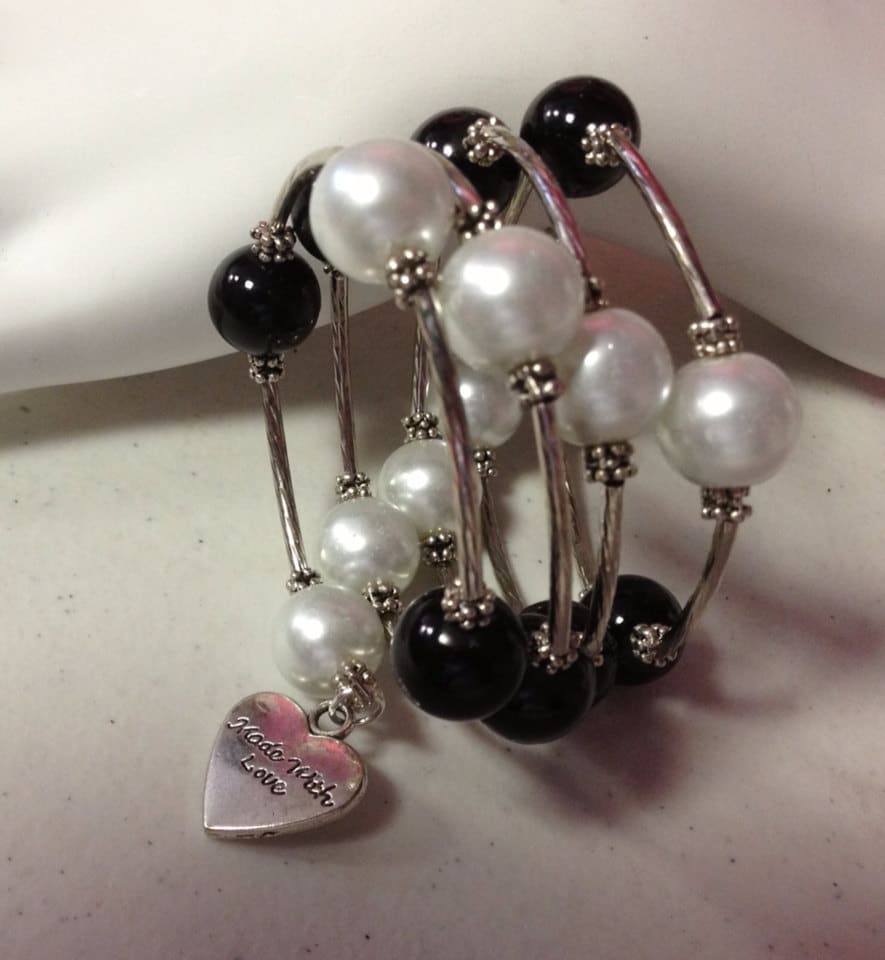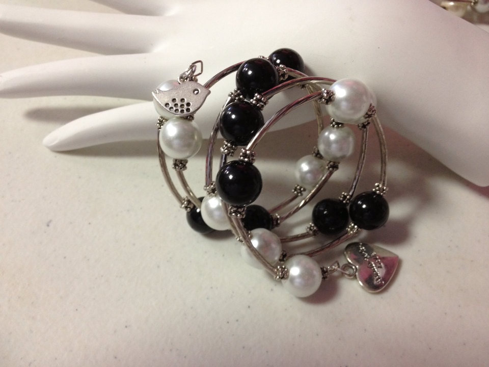 White & Black Faux Pearl Beads Sparrow and Heart Charm Wrap Bracelet: Bridesmaid gifts, Gifts for her, Memory Wire bracelet