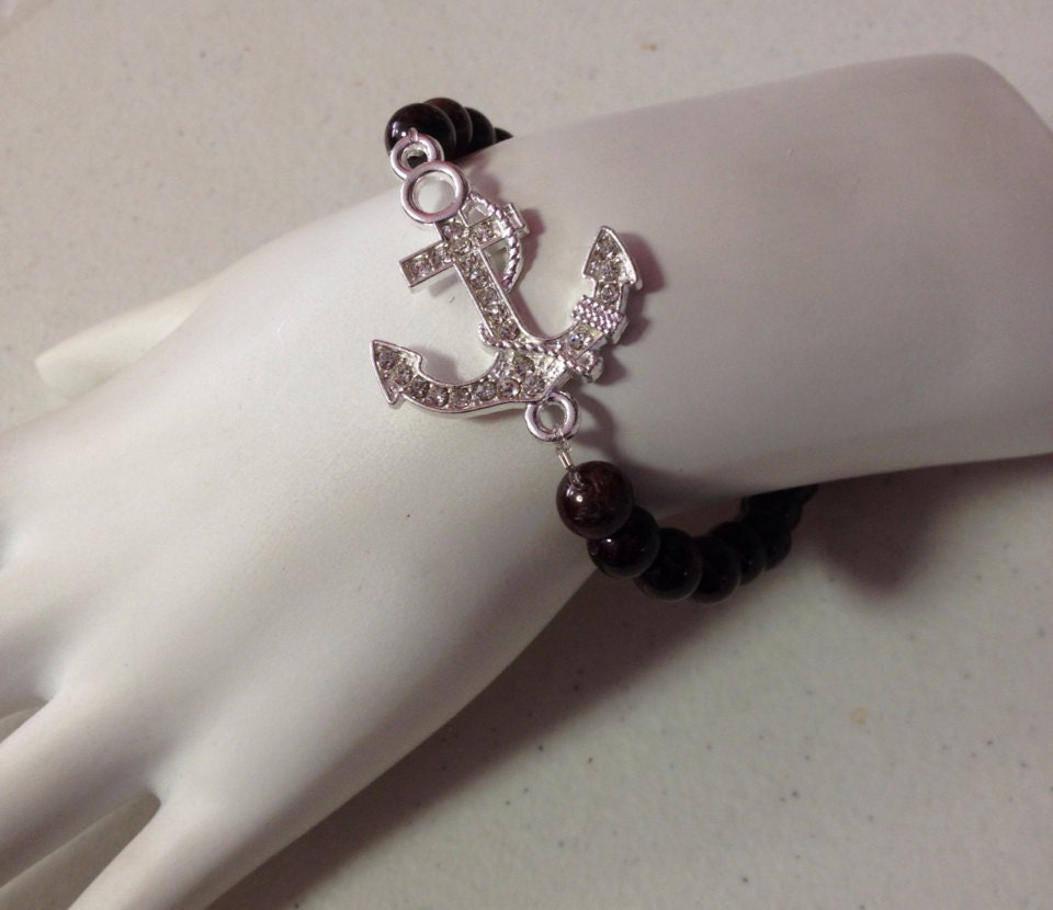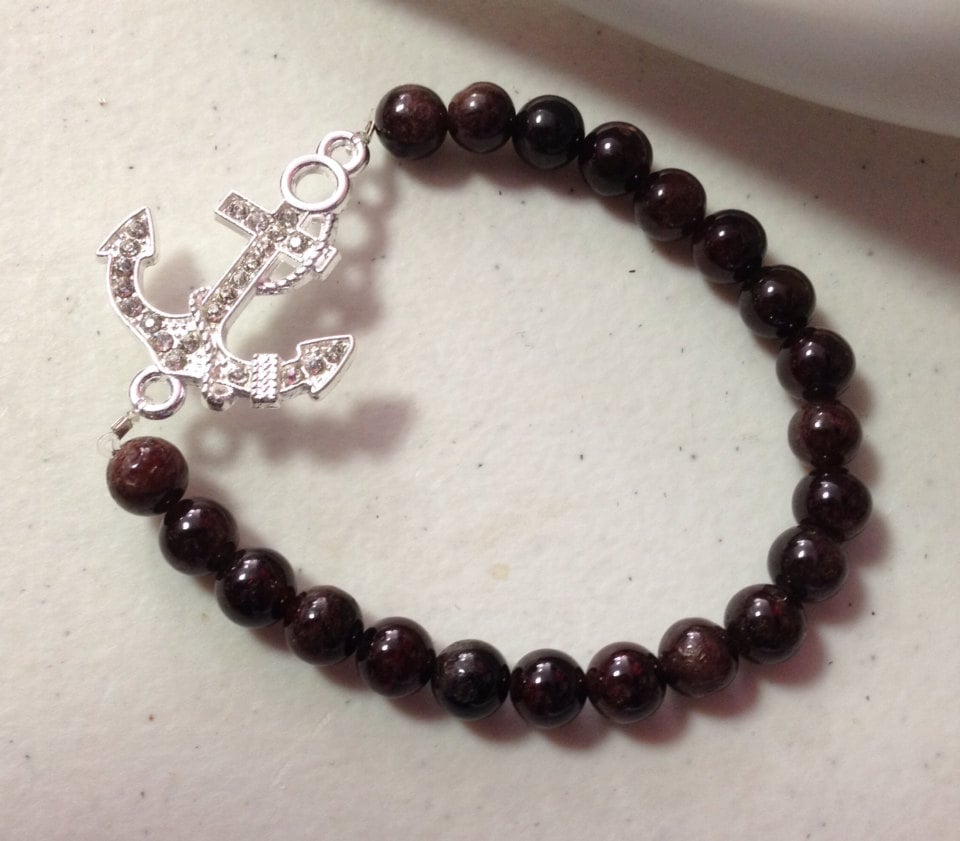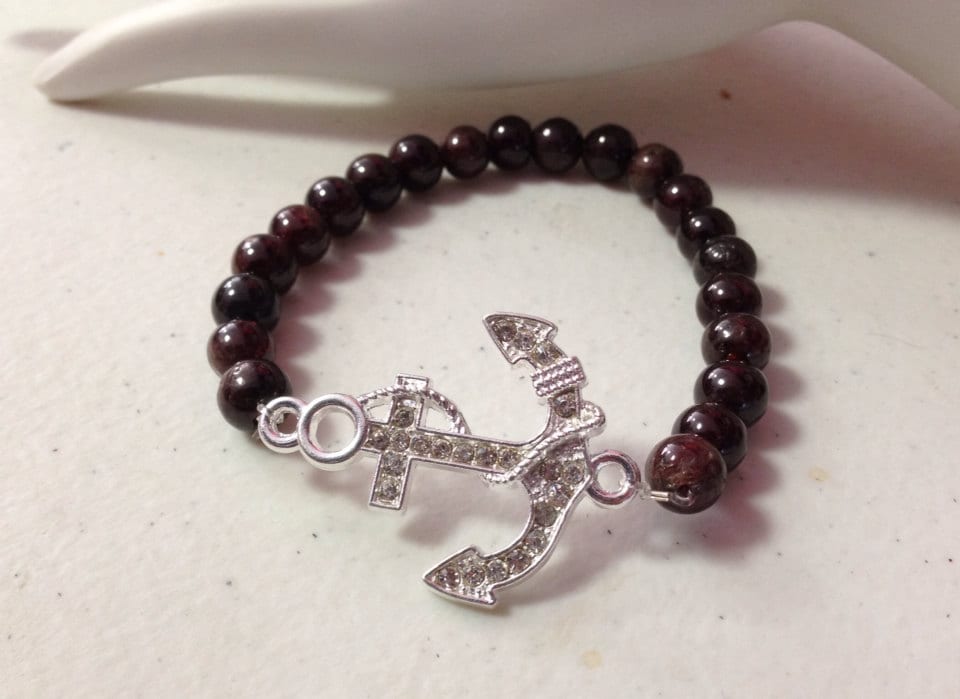 Garnet Bracelet, Anchor charm Garnet Gemstone Bead Crystal Bracelet; january birthstone, anchor jewelry, gifts