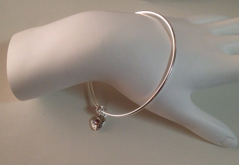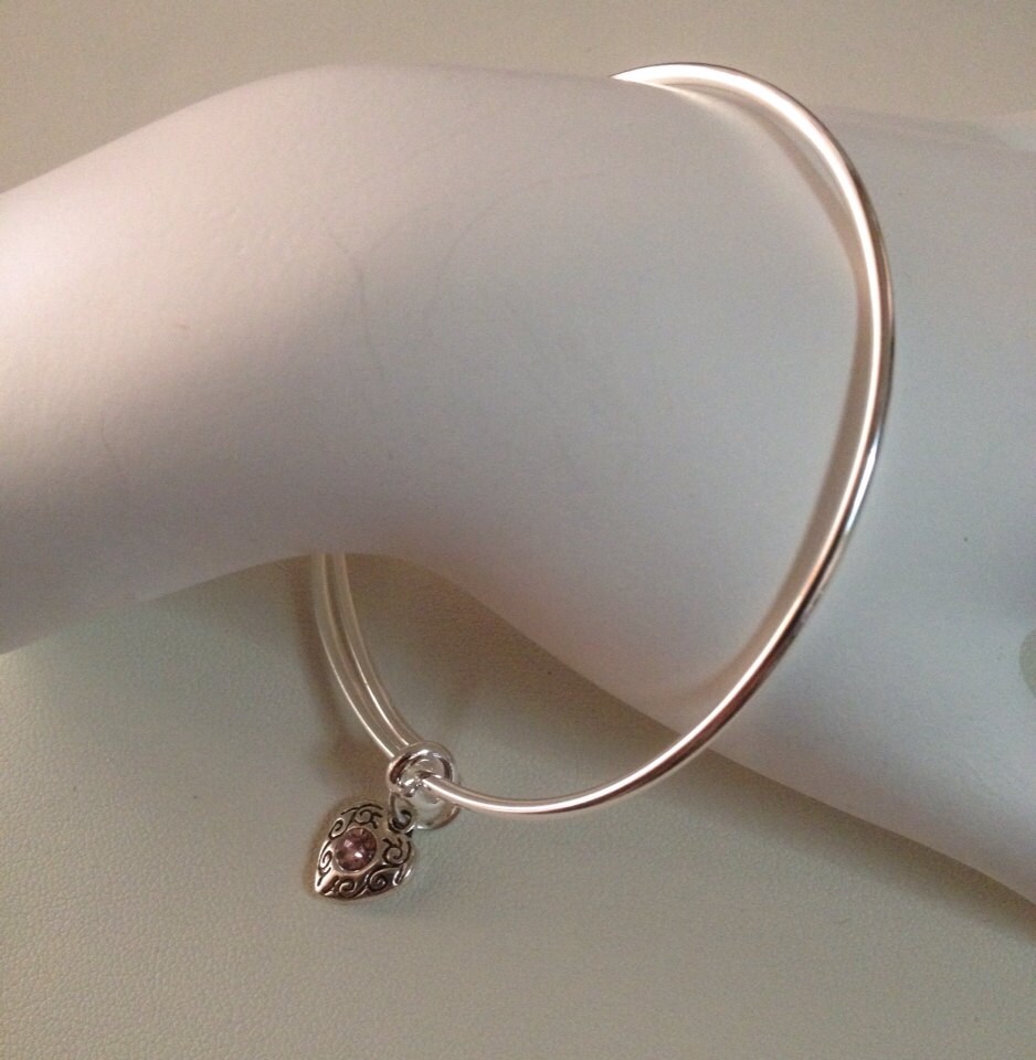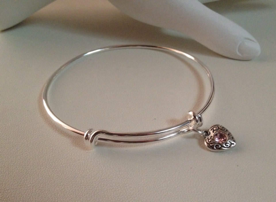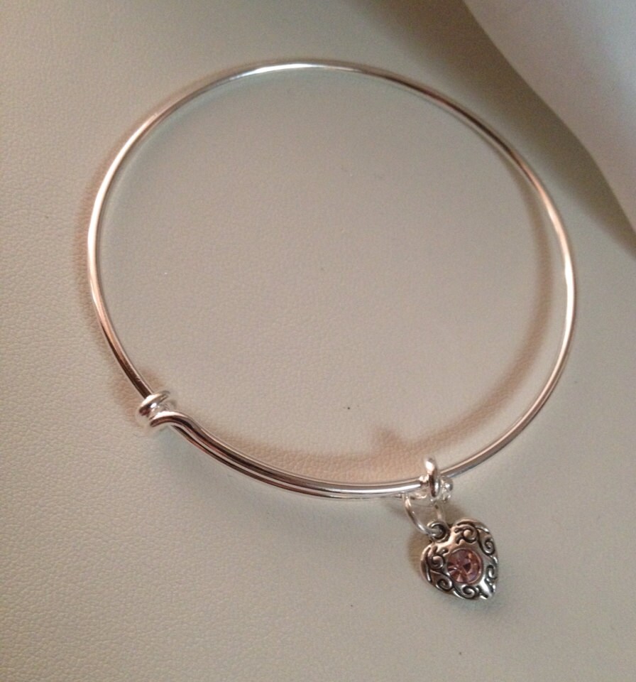 Pink Crystal Heart Charm Bangle, October birthstone jewelry, Pink Charm Bangle