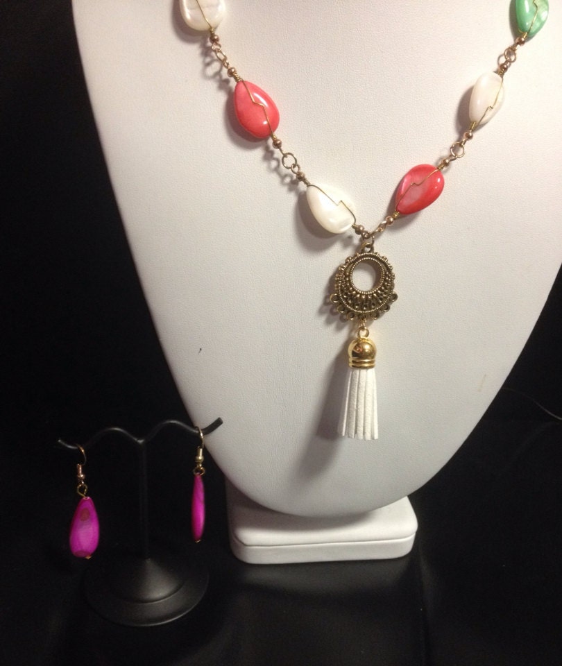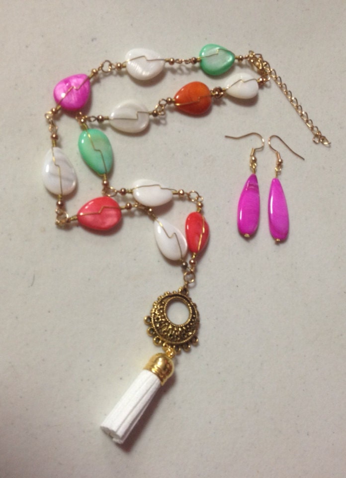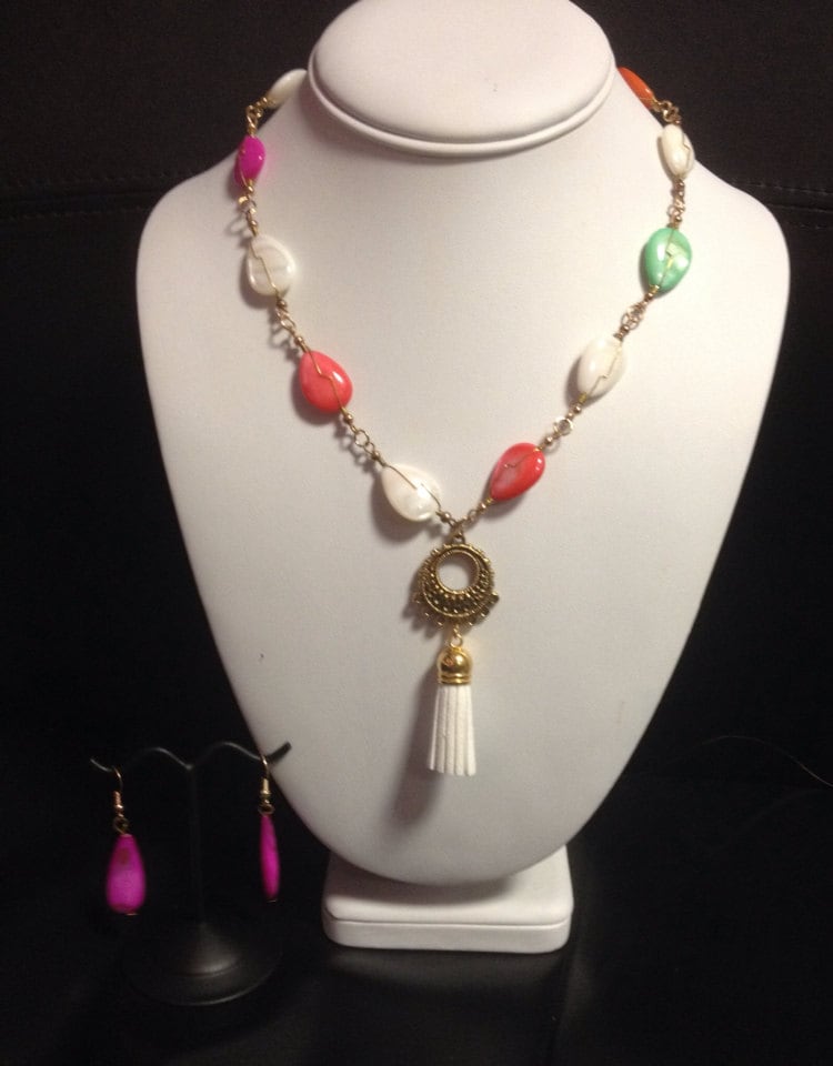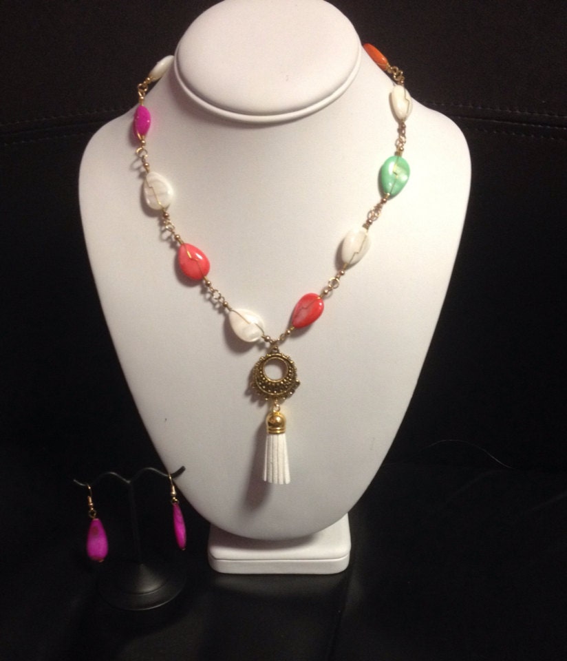 Multi Color Mother of Pearl Shell Tear Drop Beads Necklace & Earring Set; tassel jewelry, tassel necklace, Beach Necklace, Gift for her,