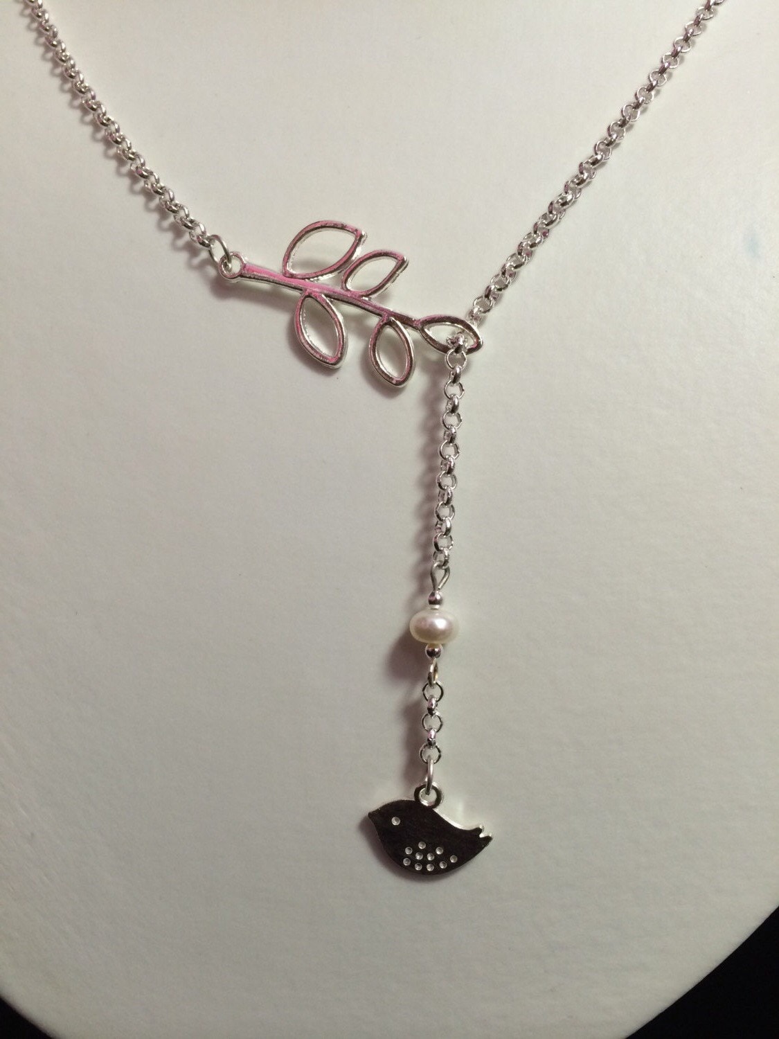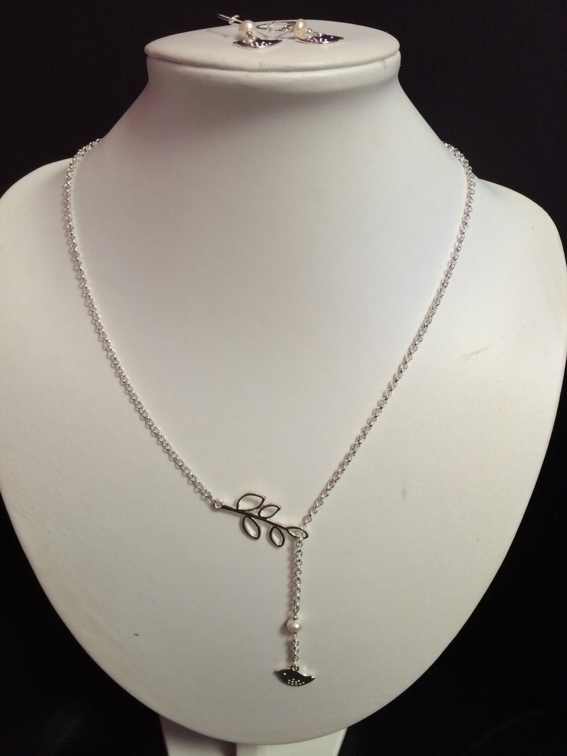 21"L Bird and Branch Charm Necklace with white cultured freshwater pearls.