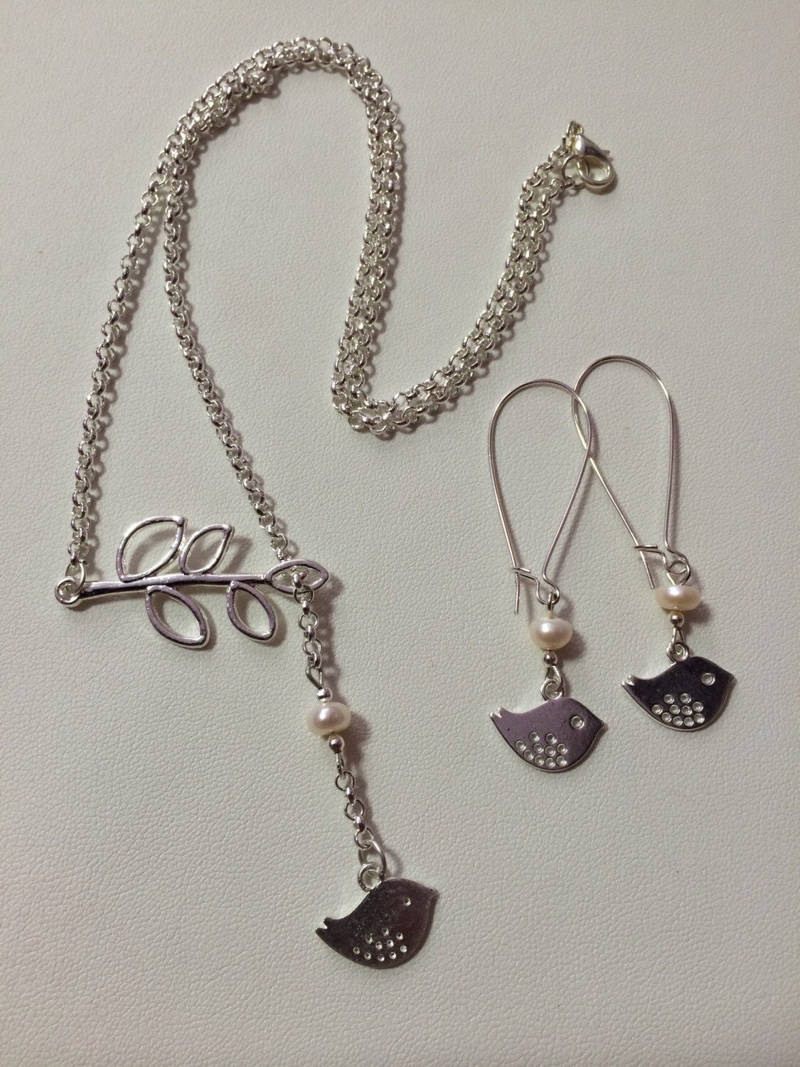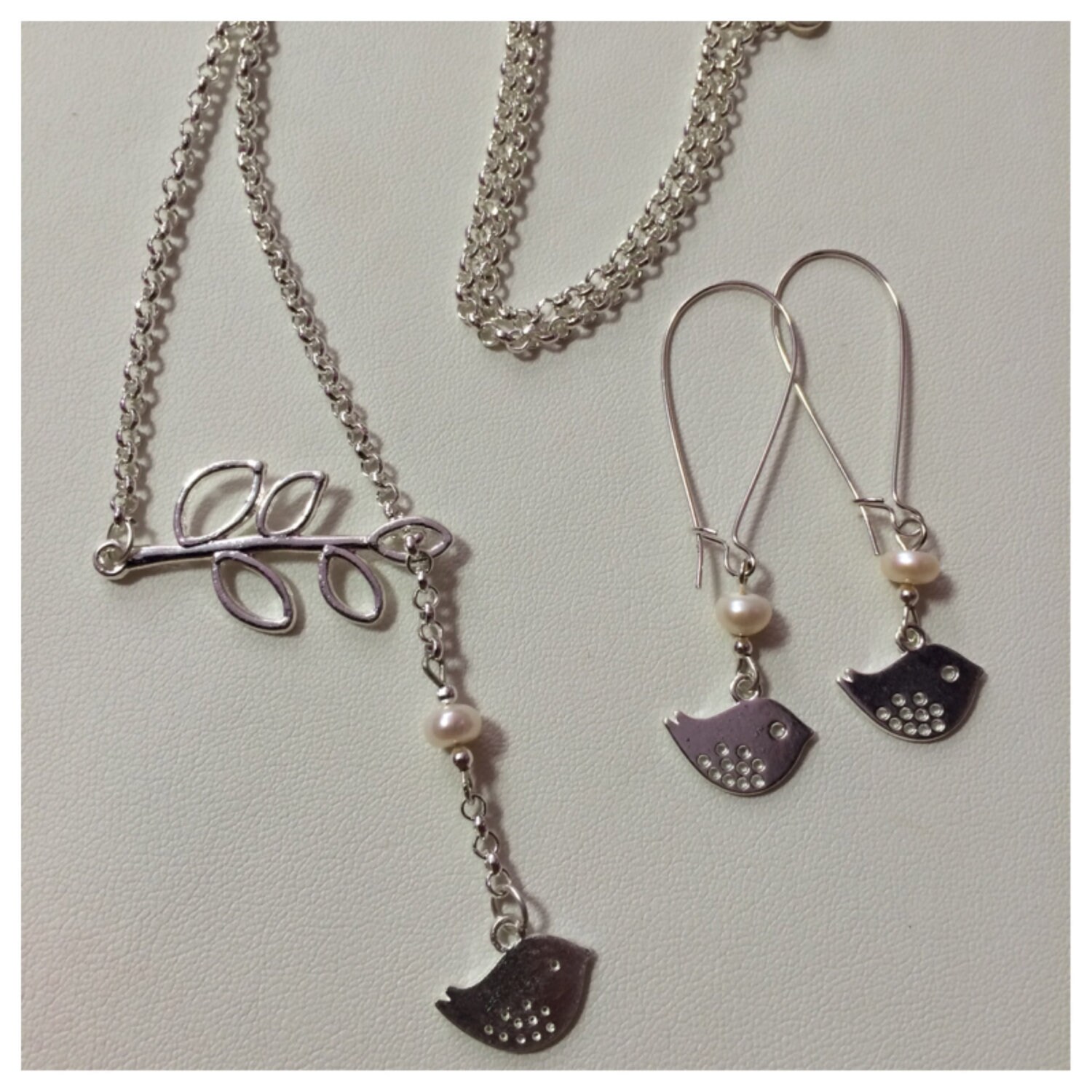 Birds and Branch Charm White CFW Pearl Necklace Earring Set