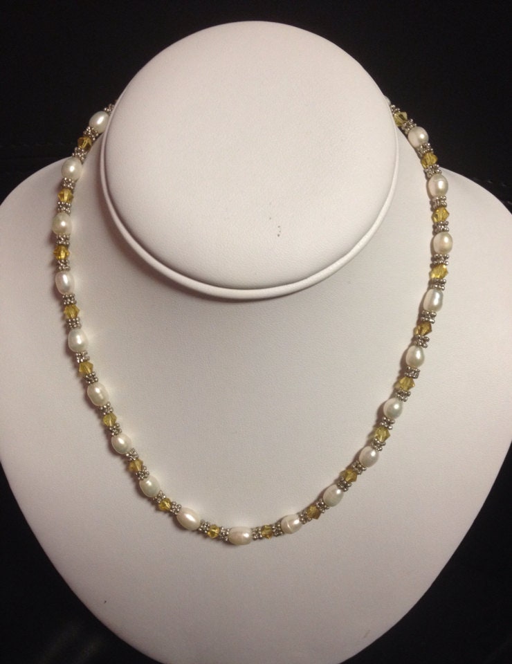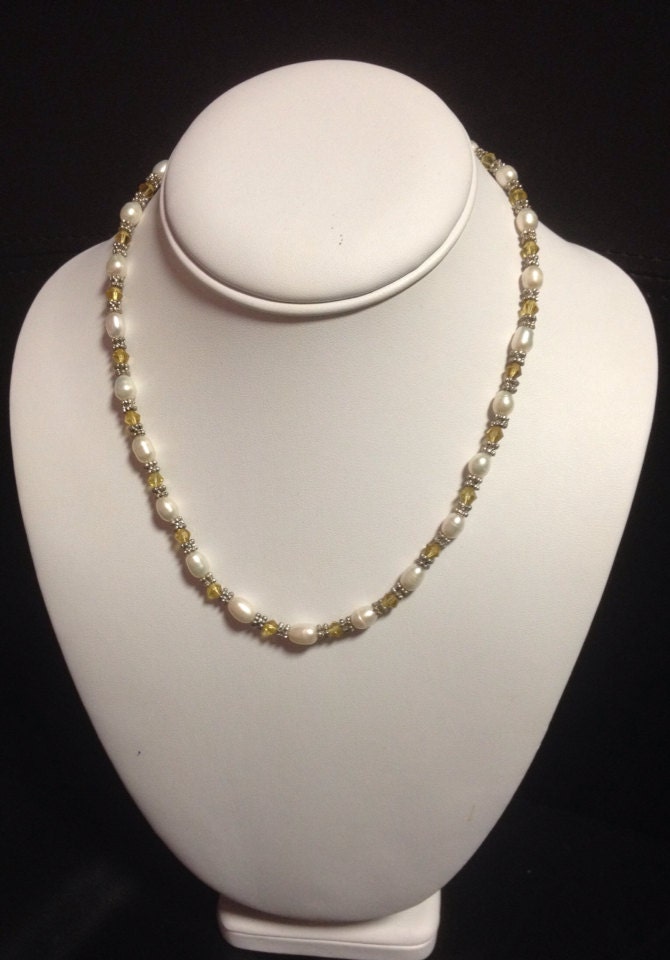 White Cultured Freshwater Pearl and yellow crystal beads necklace