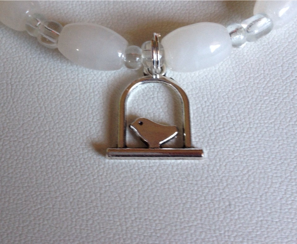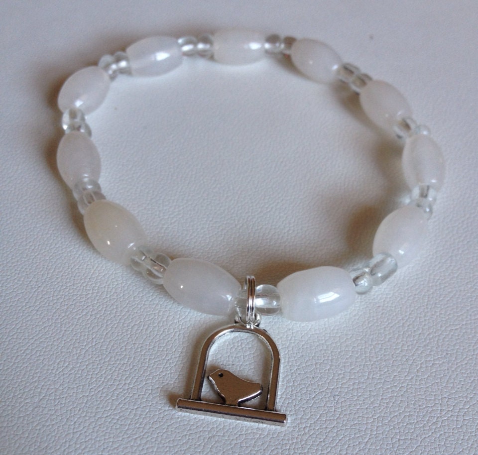 White Jade & Crystal Gemstone Bird on Swing Charm Bracelet, White gemstone bracelet, Charm Bracelet, Dainty Bracelet, Gemstone Bracelet