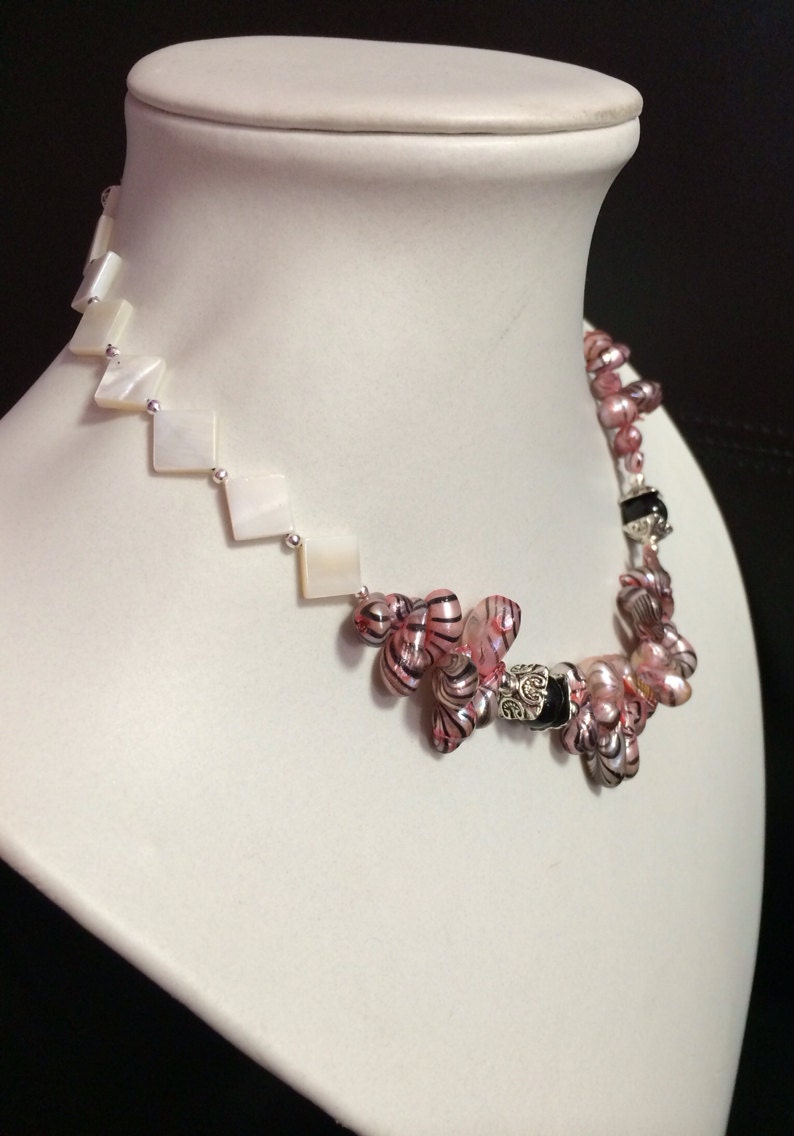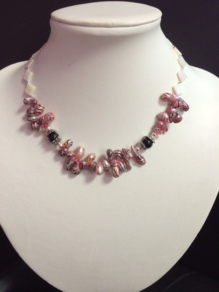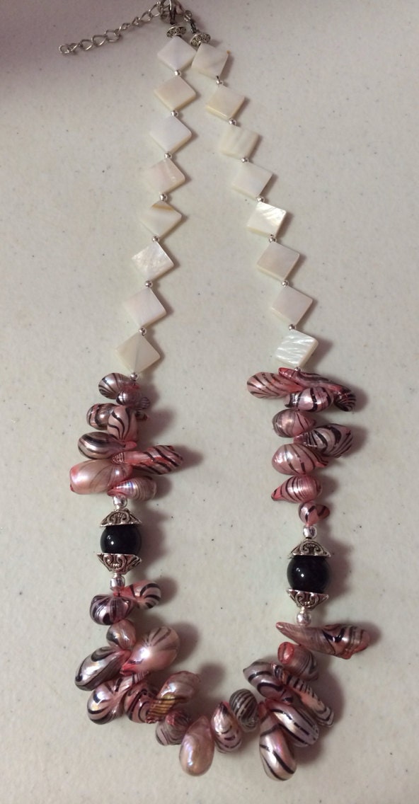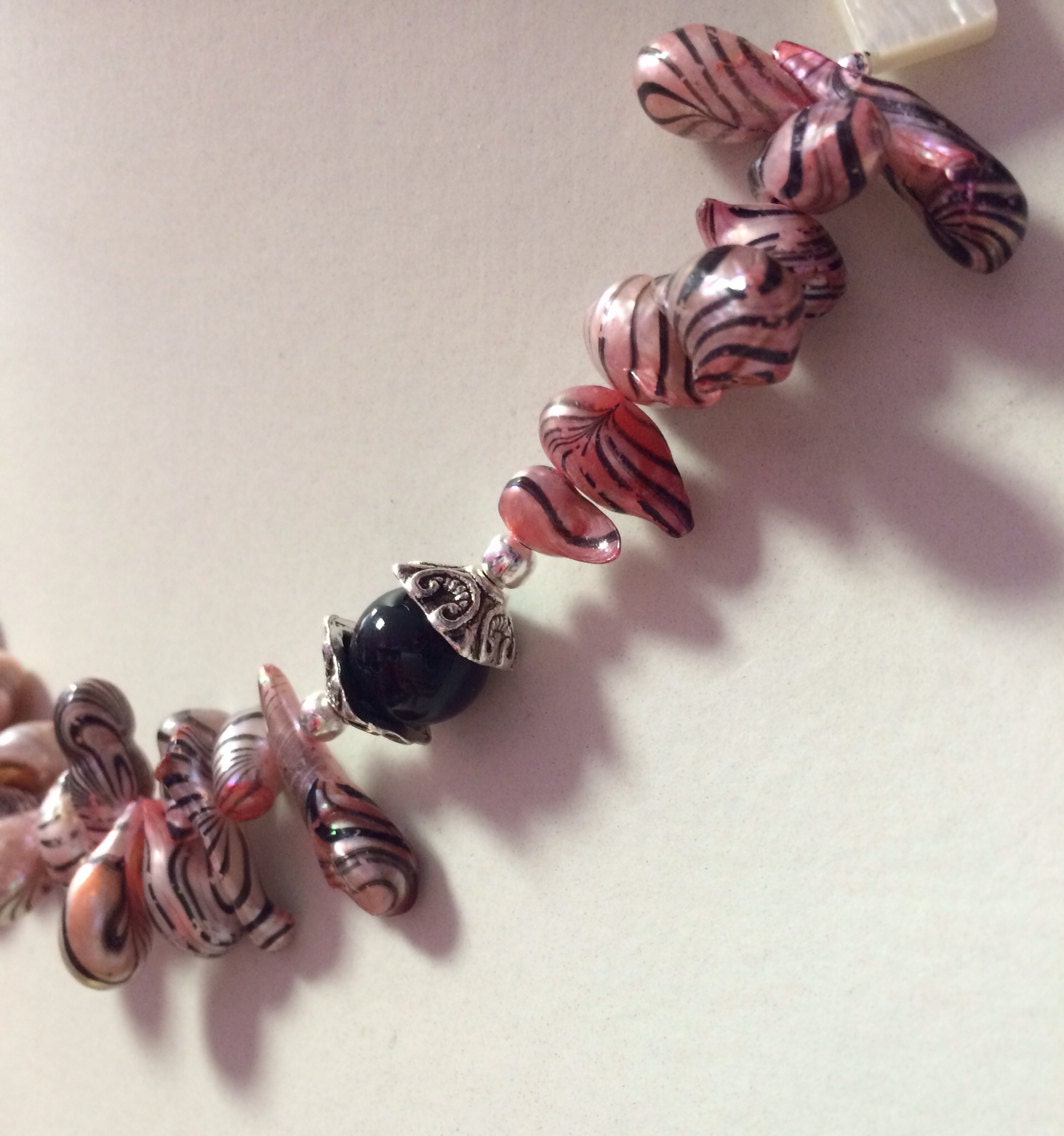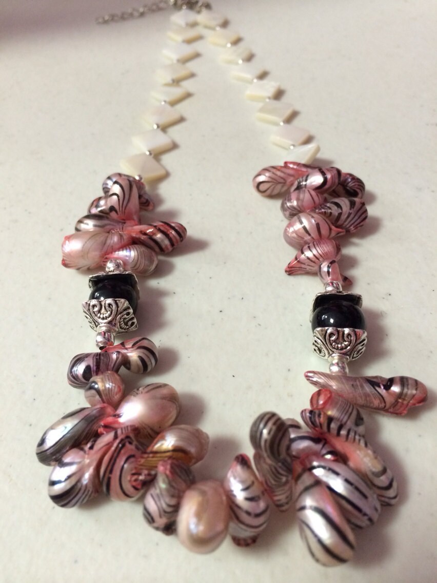 Pink Zebra Striped CFW Pearl, White MOP Shell Necklace