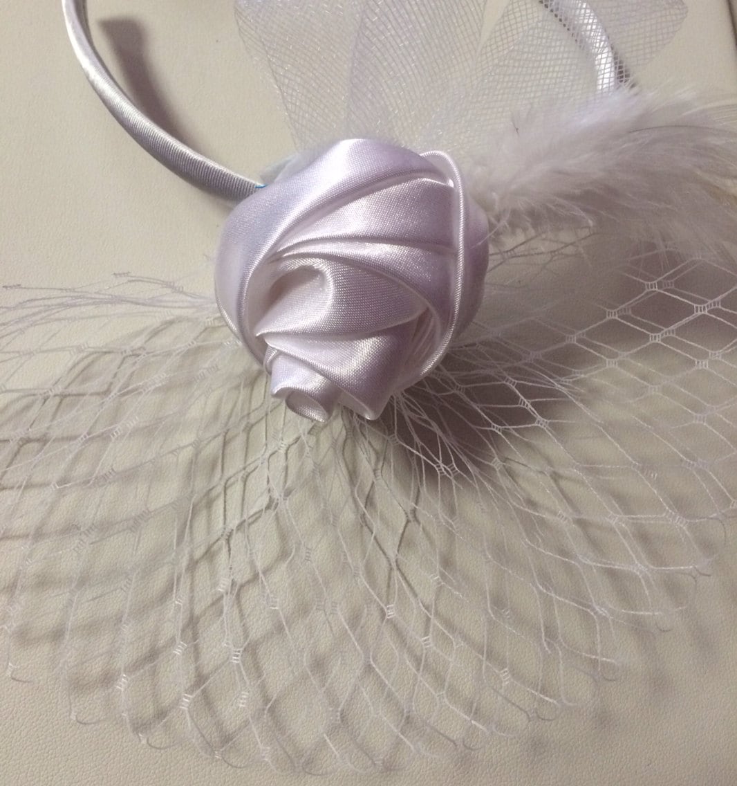Flower girl White Satin Rose Feathered Veil Headband; fascinator, White Headband, Flower Headband,