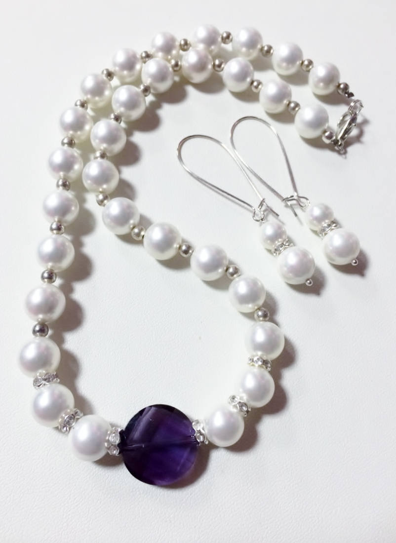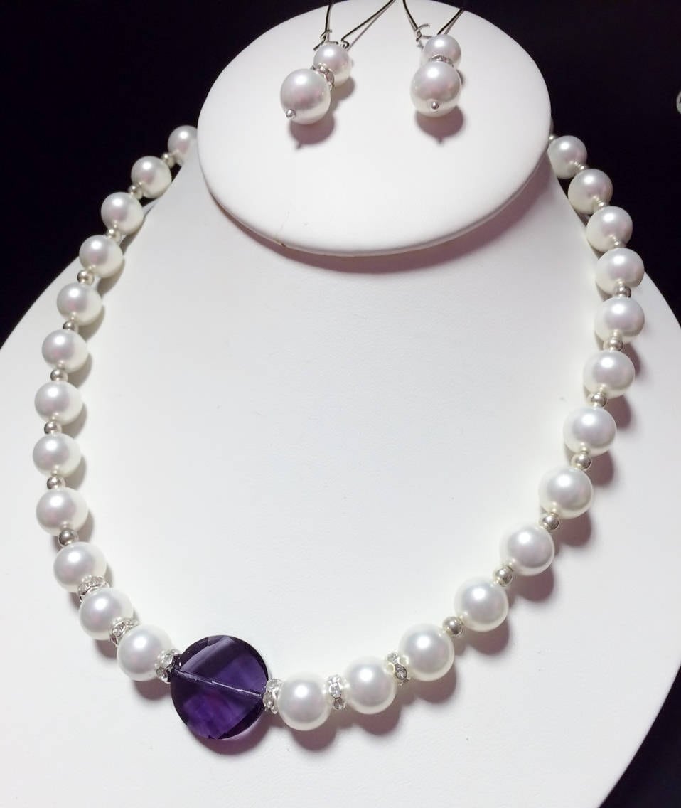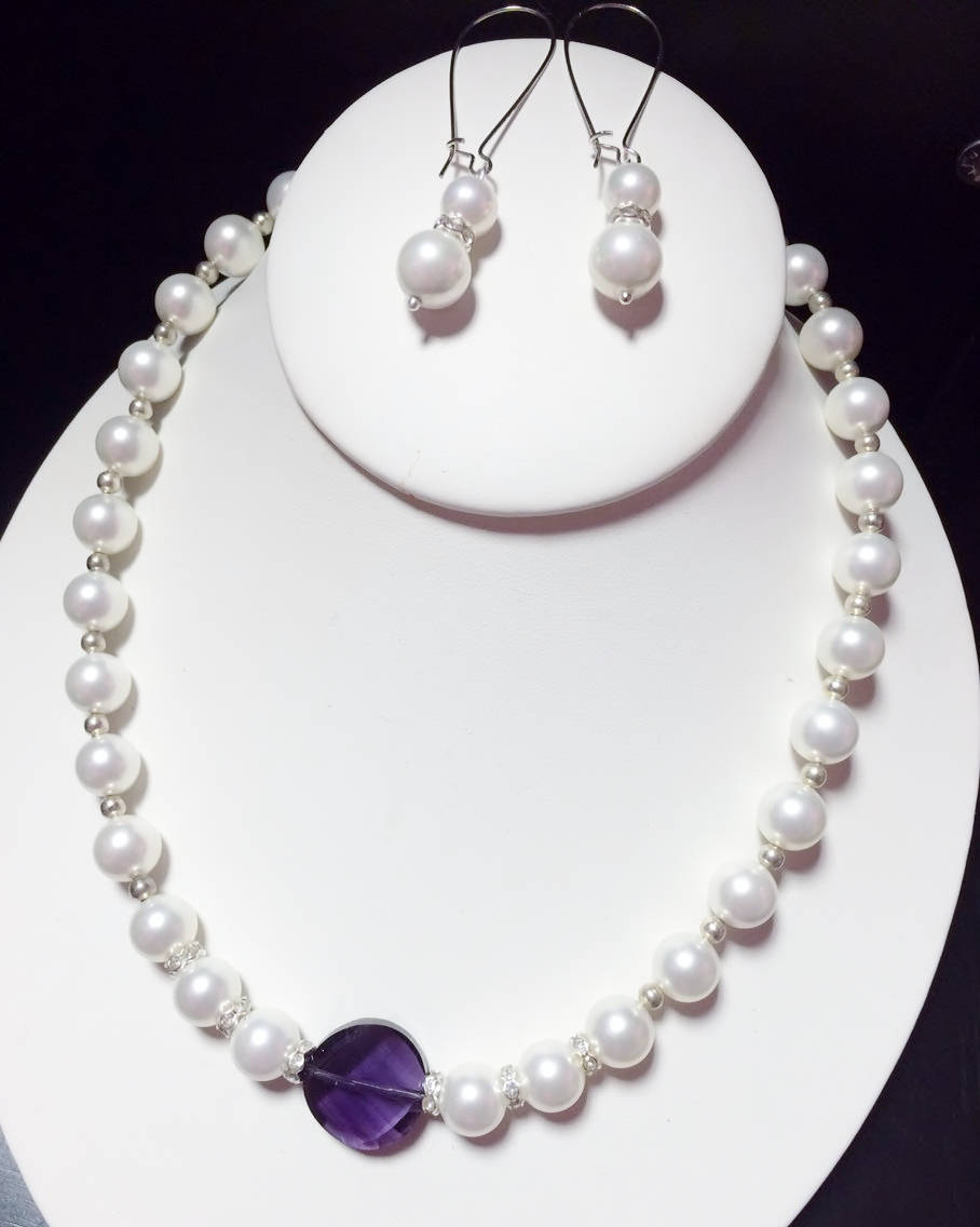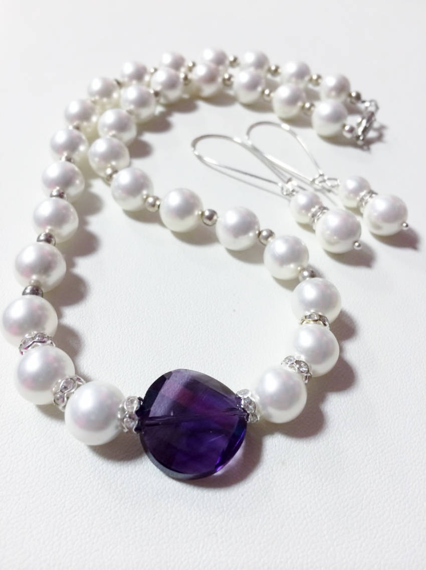 Bridal Jewelry Set, 10mm White Glass Pearl & Faceted Purple Crystal Necklace Earring Set