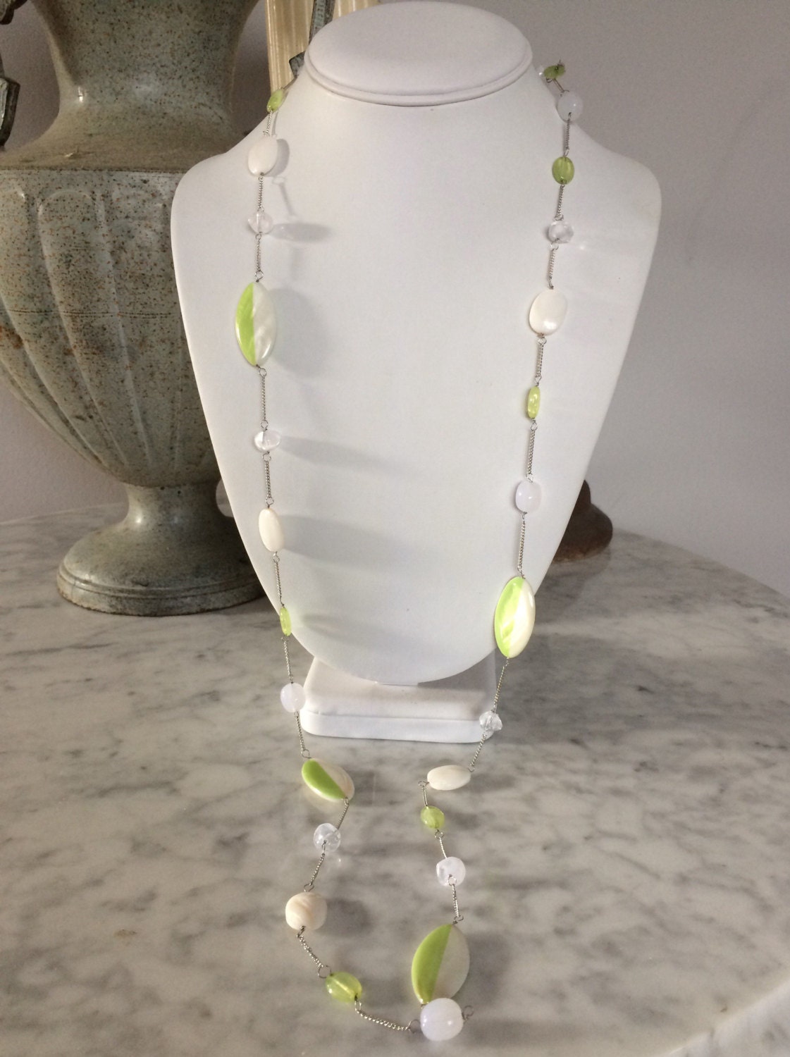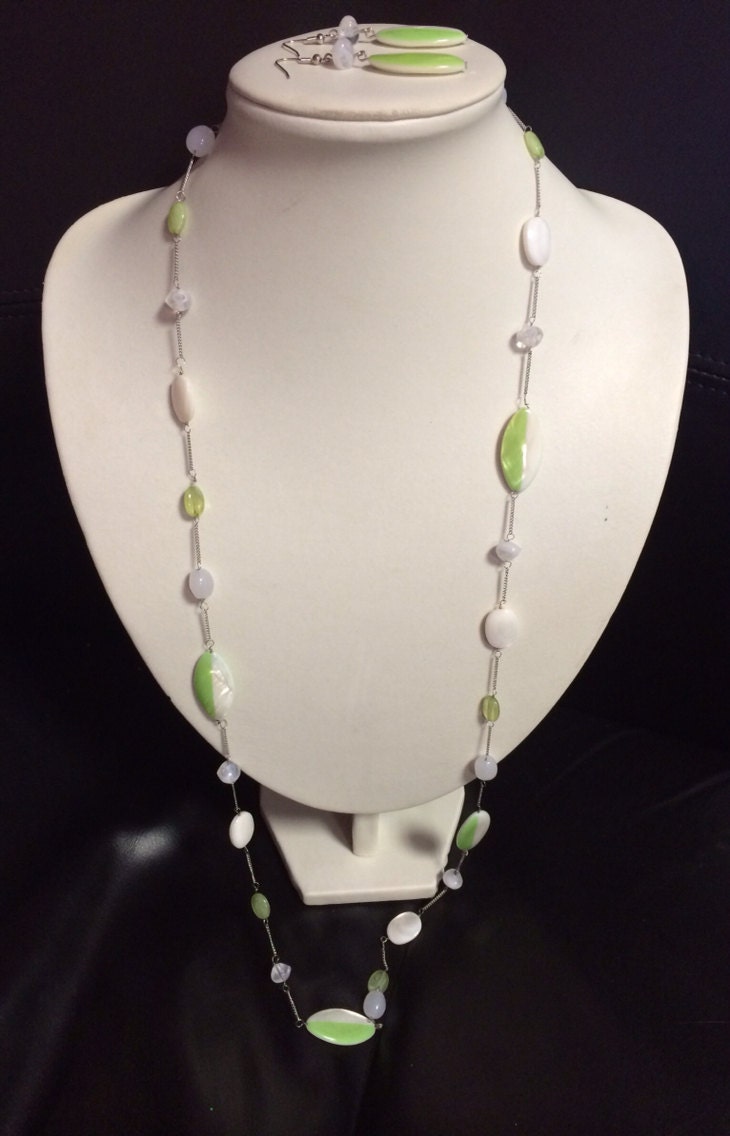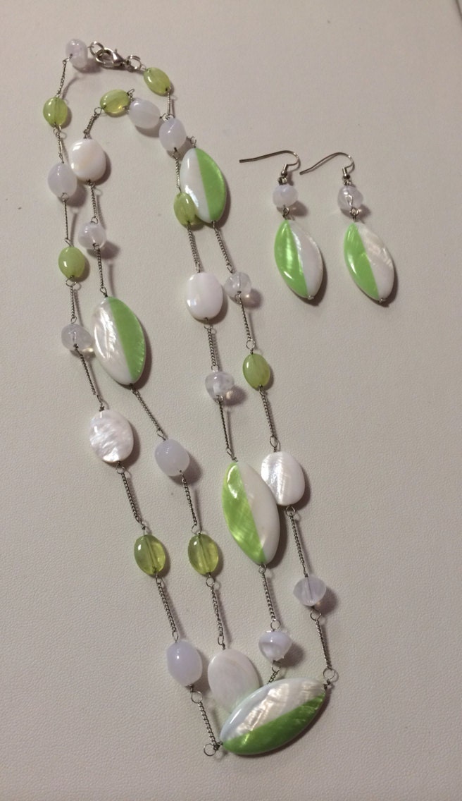 38" Mother of Pearl Shell Long Necklace & Earring Set, Green Shell necklace, Long Necklace, Summer Jewelry, Beaded Necklace