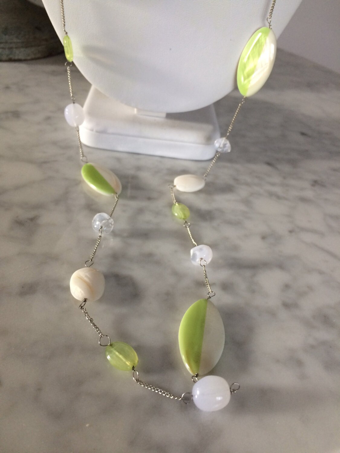 Made with white & striped MOP Shell beads with small white & green acrylic beads