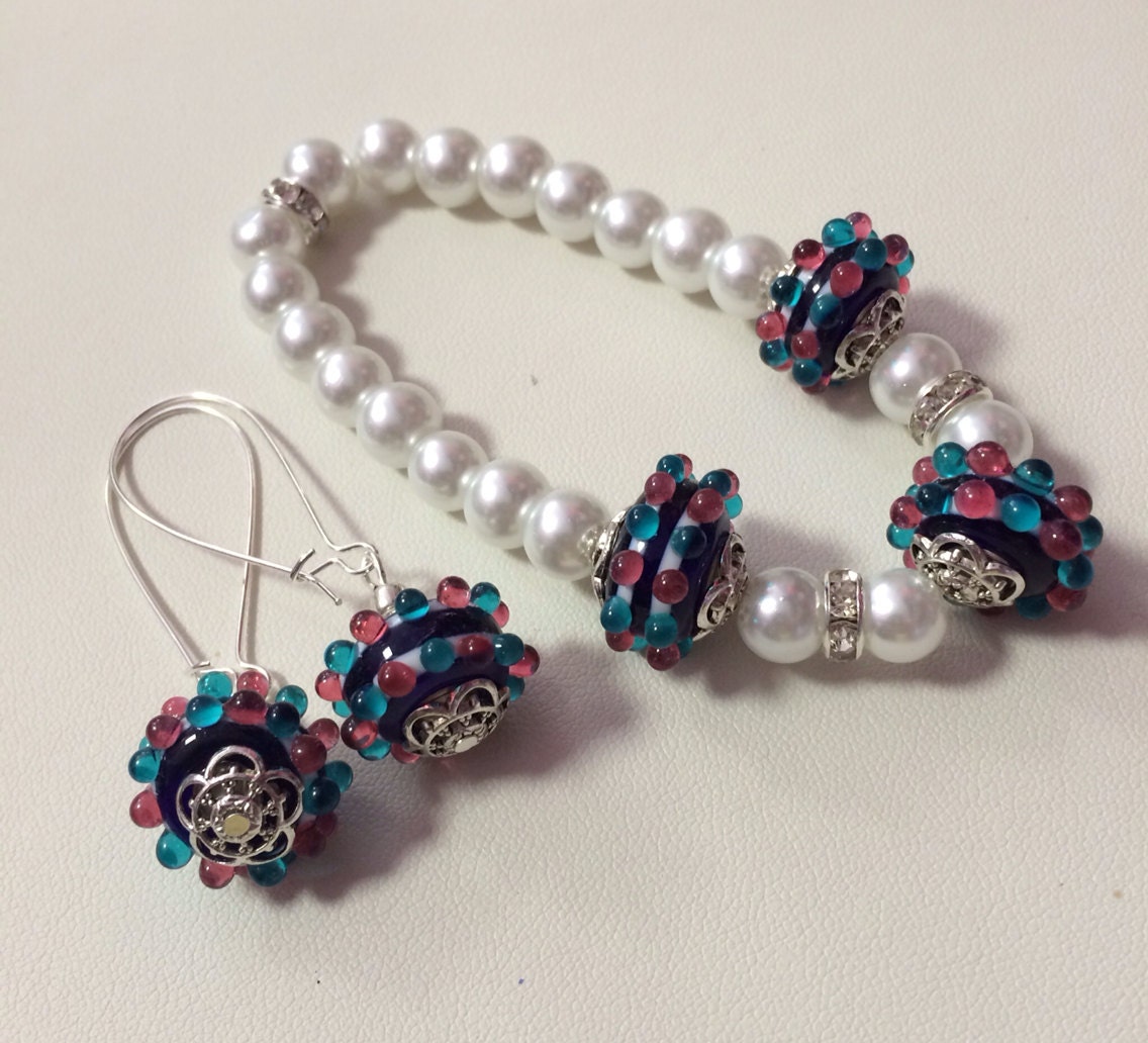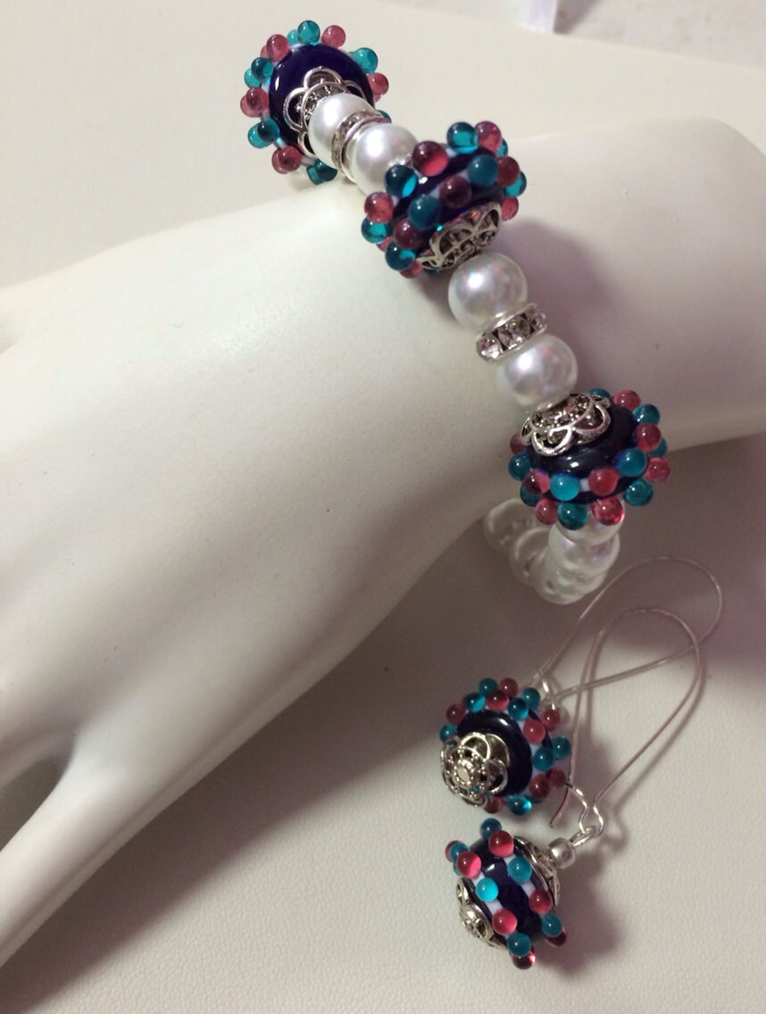 Multi Color Lampwork Beaded Crystal Faux Pearl Bracelet Earring Set
