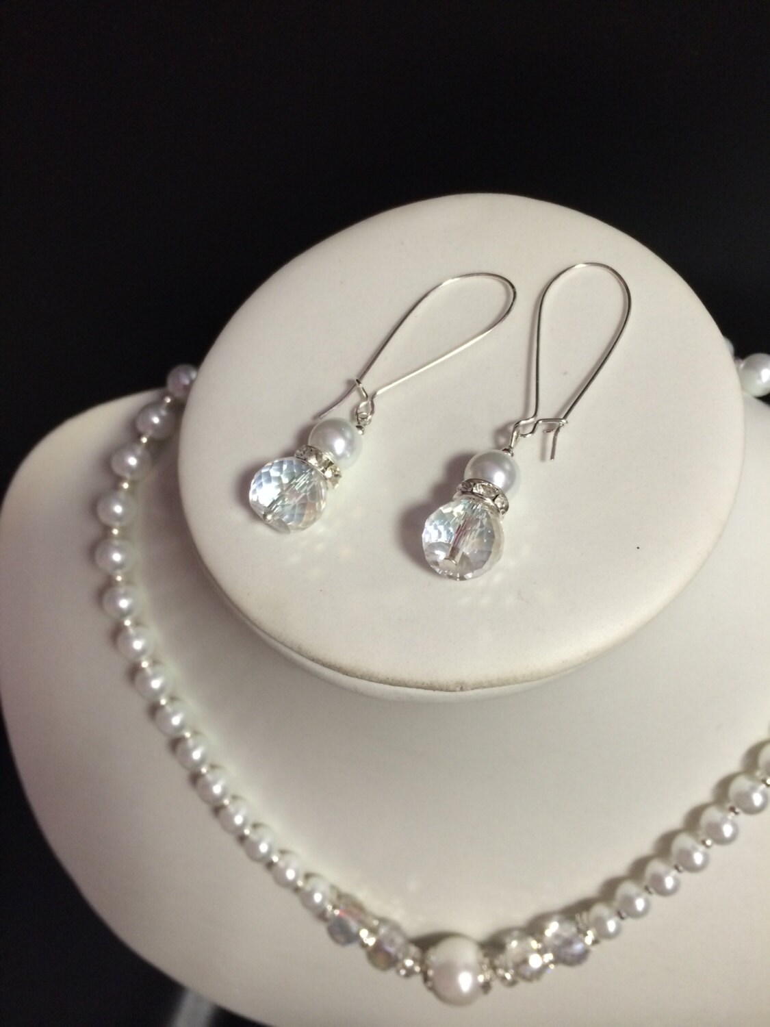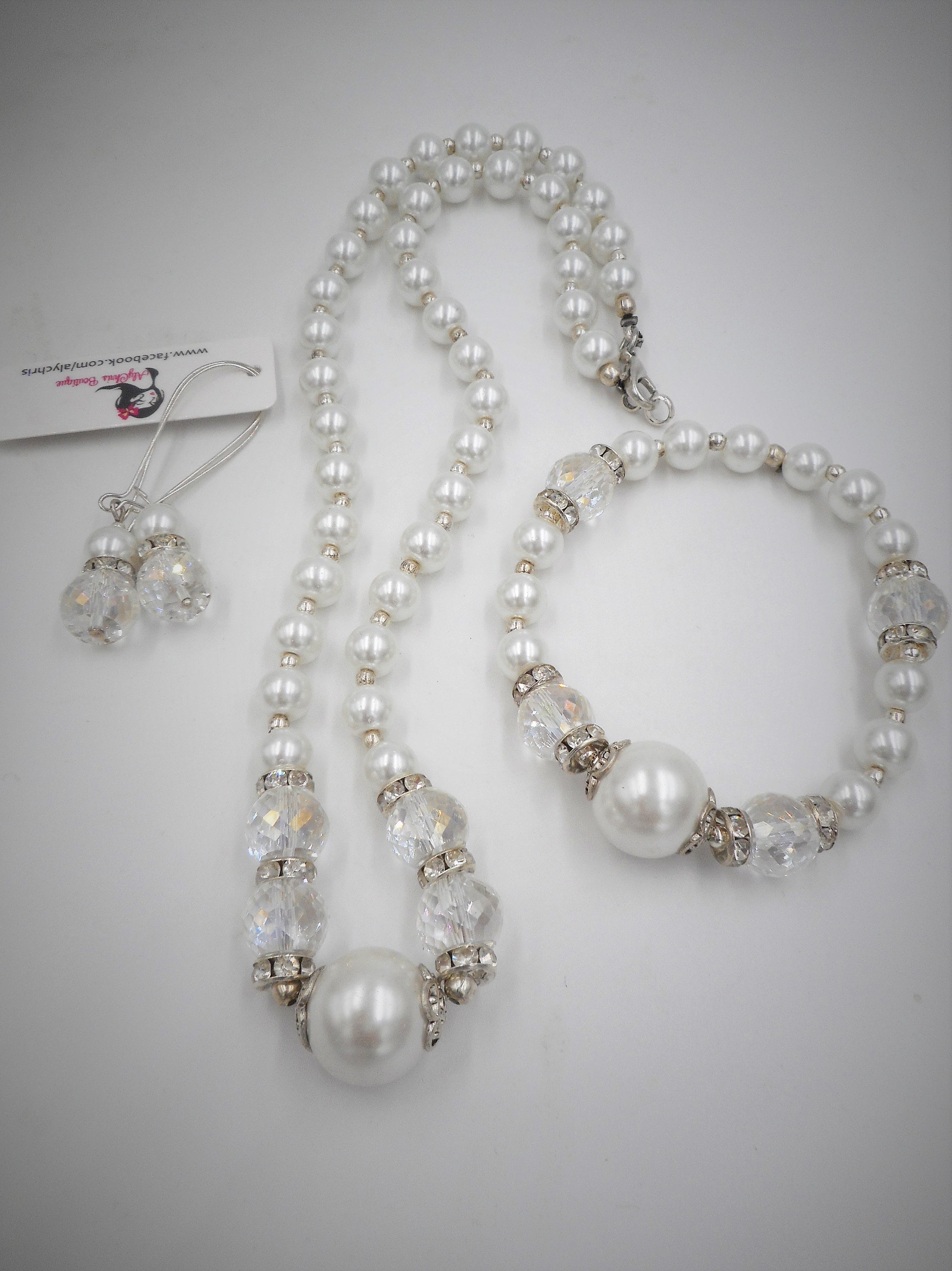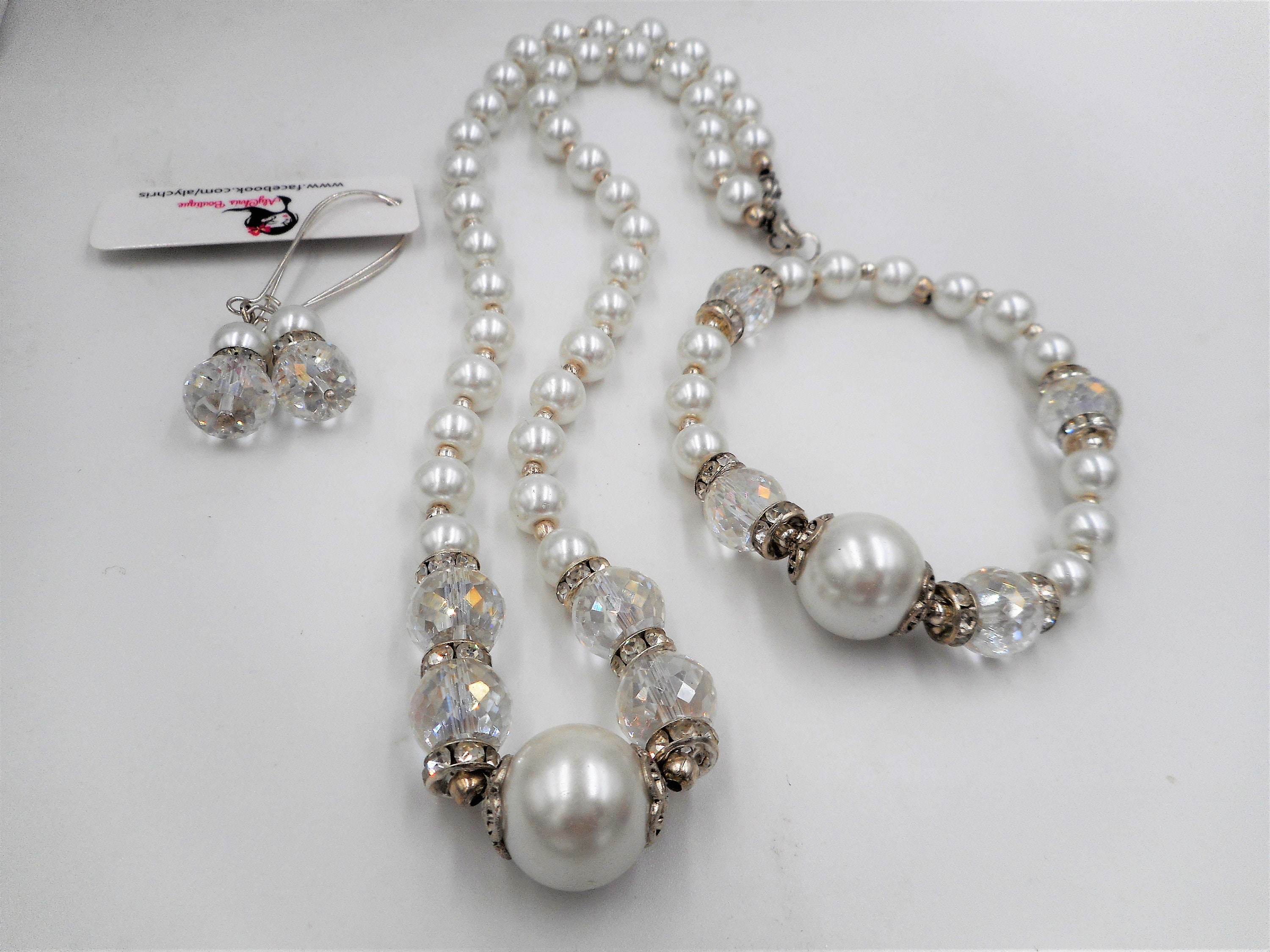 White Glass Pearl Beaded Crystal Necklace,Bracelet & Earring Set, Wedding jewelry, Crystal jewelry, Crystal necklace, Pearl Bridal Set
