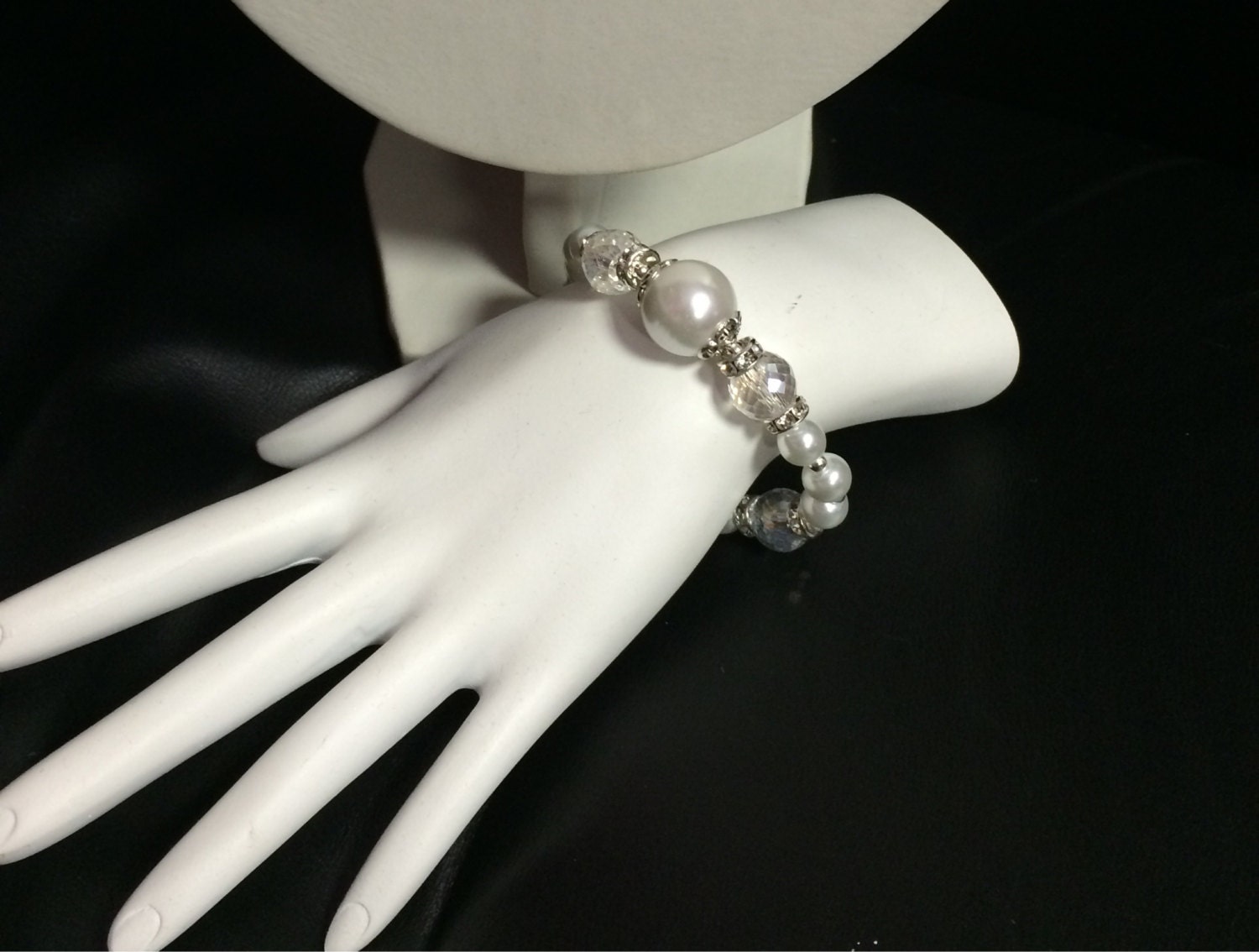 Bracelet: 6 1/2", stretch bracelet with 8mm & 16mm glass pearls. Faceted 13mm crystal beads