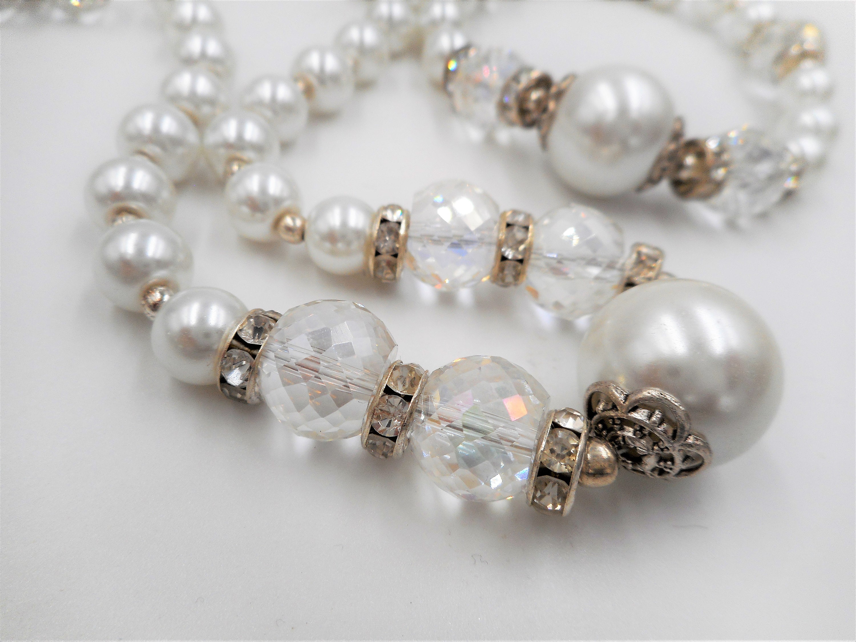 Necklace: 18"L with 8mm & 16mm glass pearl. Faceted 13mm crystal beads
