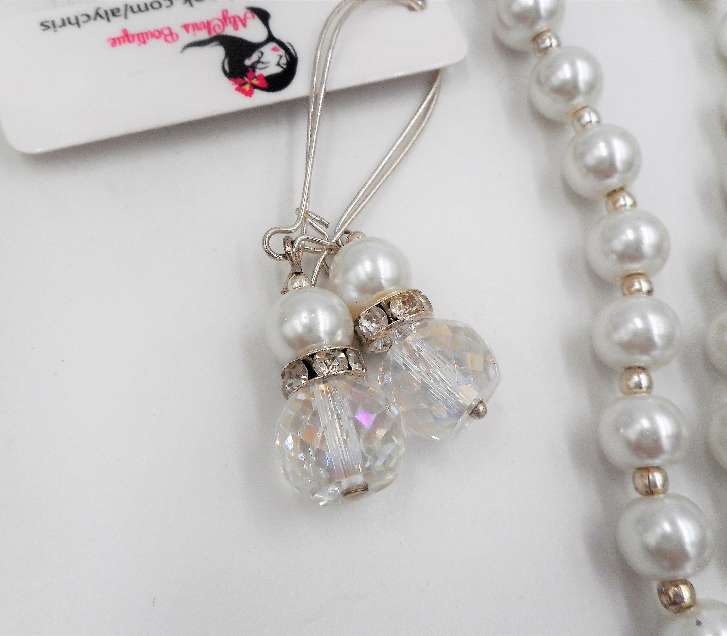 Earrings: apprx 2 1/4"L with 8mm glass pearl & 13mm faceted crystal