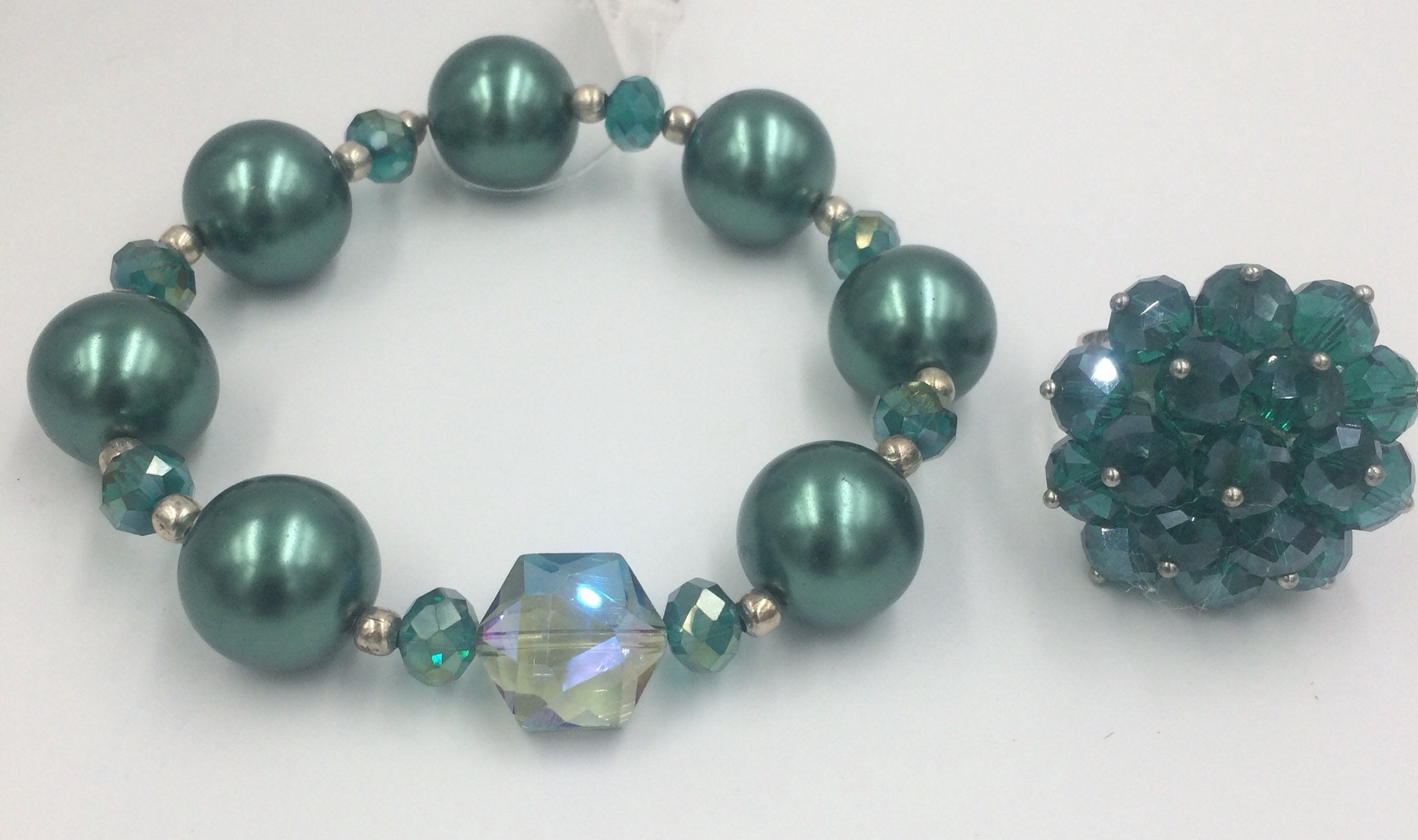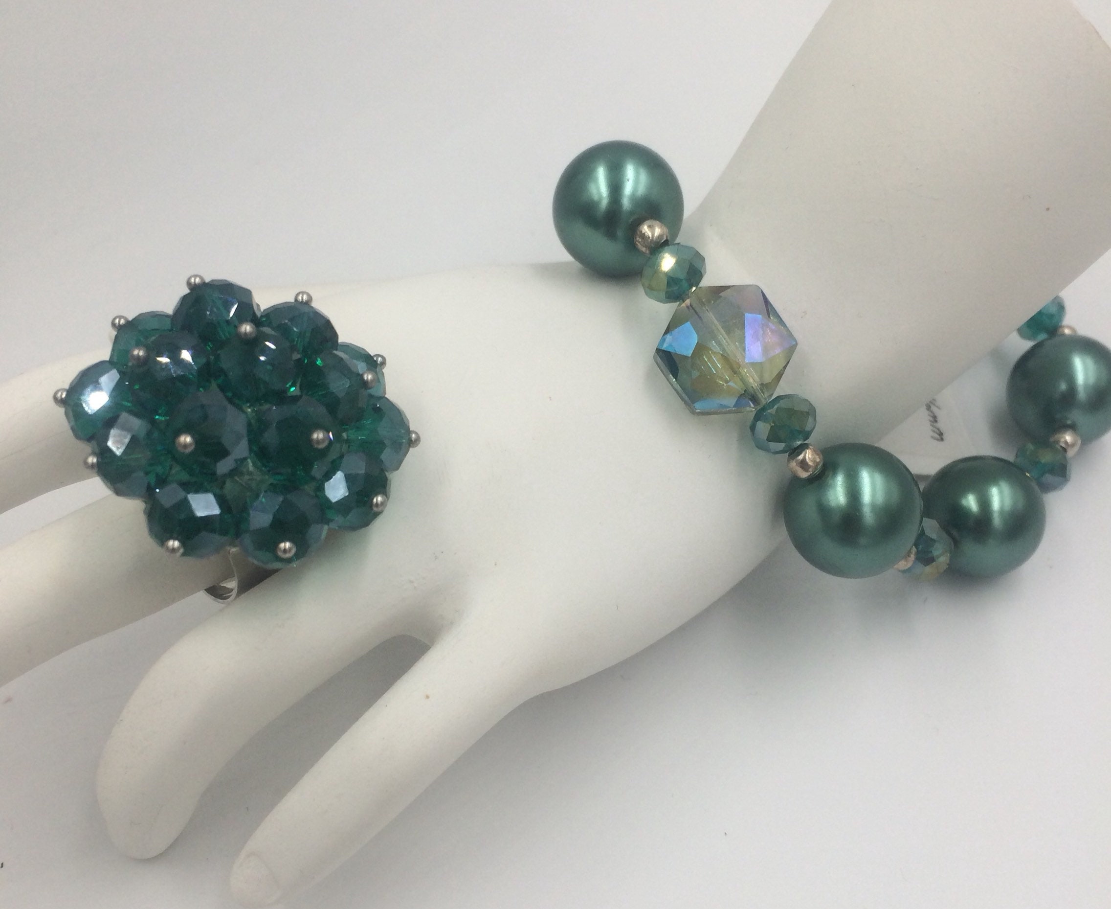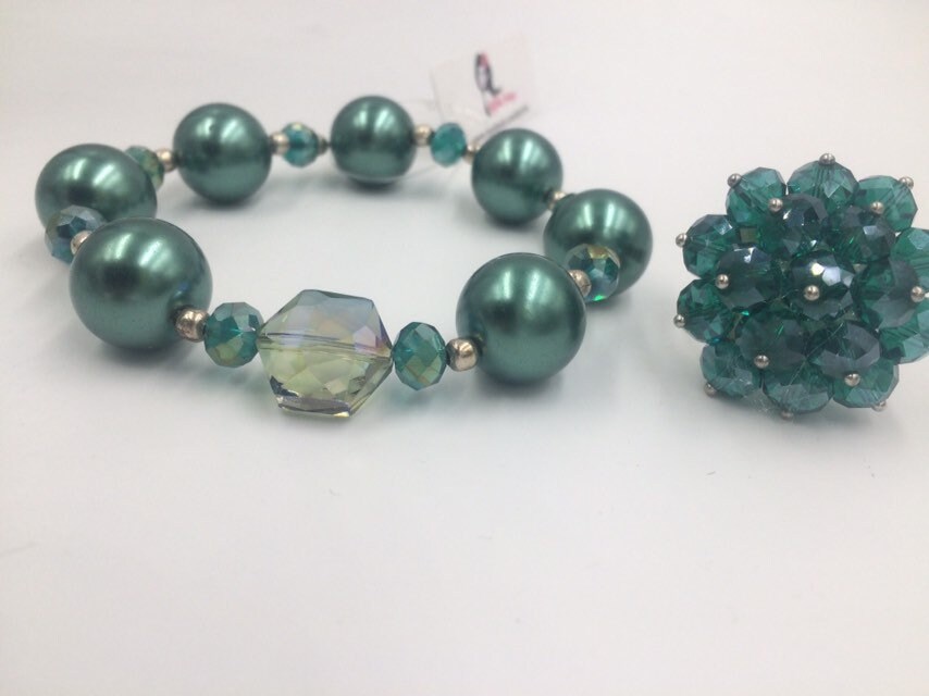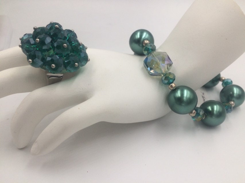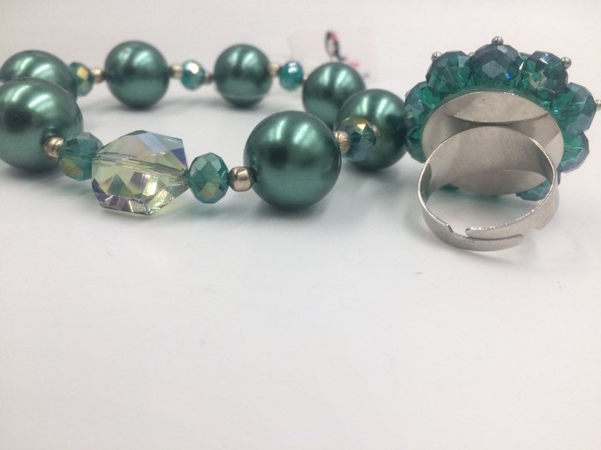 Green Bracelet and Ring Set, Green Glass Pearl & AB Crystal Bridal Bracelet. Christmas bracelet, holiday jewelry, Green Jewelry Set