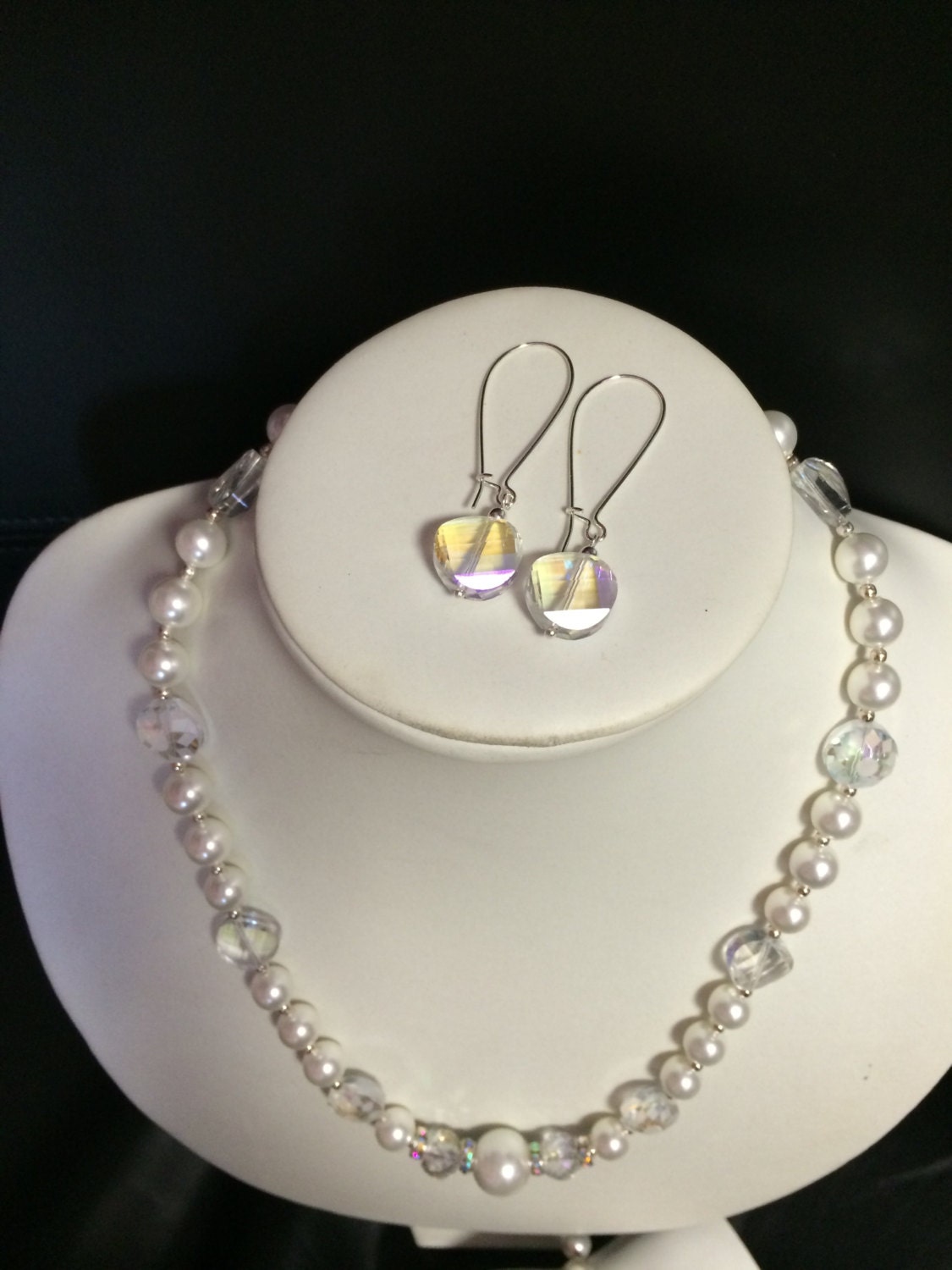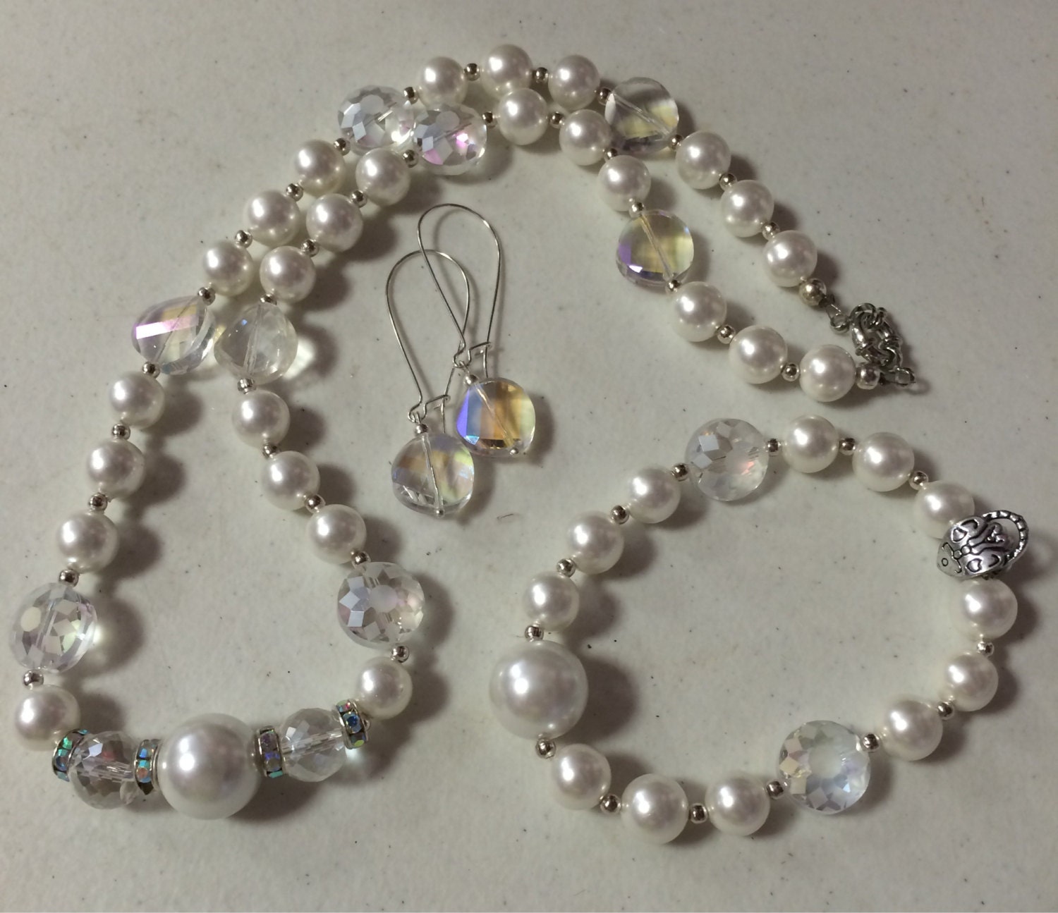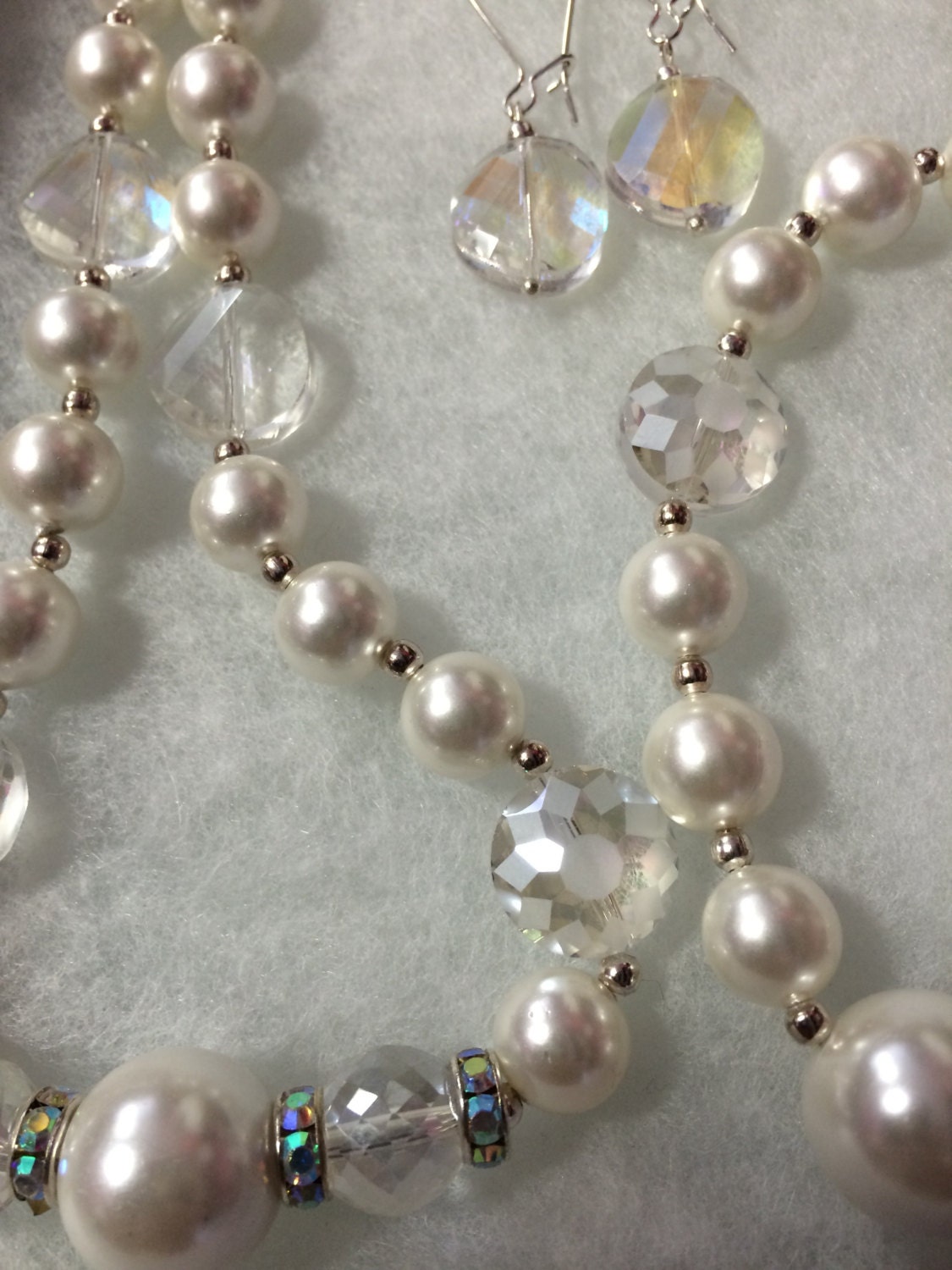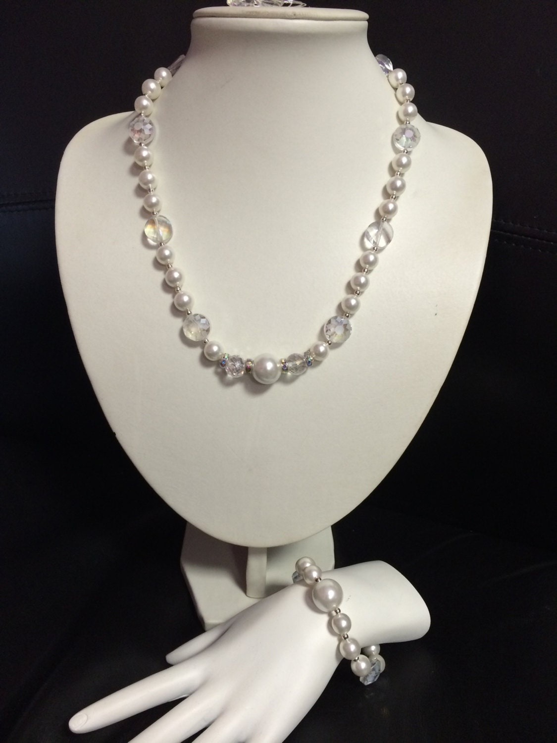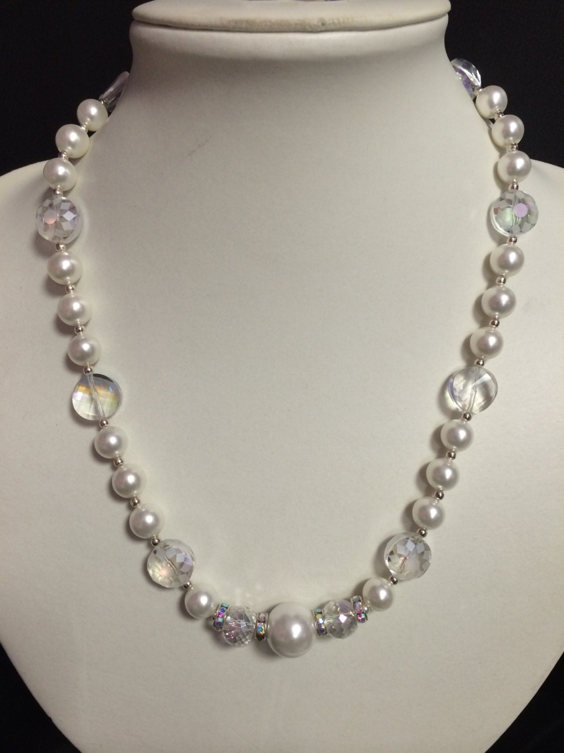 Necklace: 20"L with 10mm & 16mm glass pearl. Faceted crystal beads