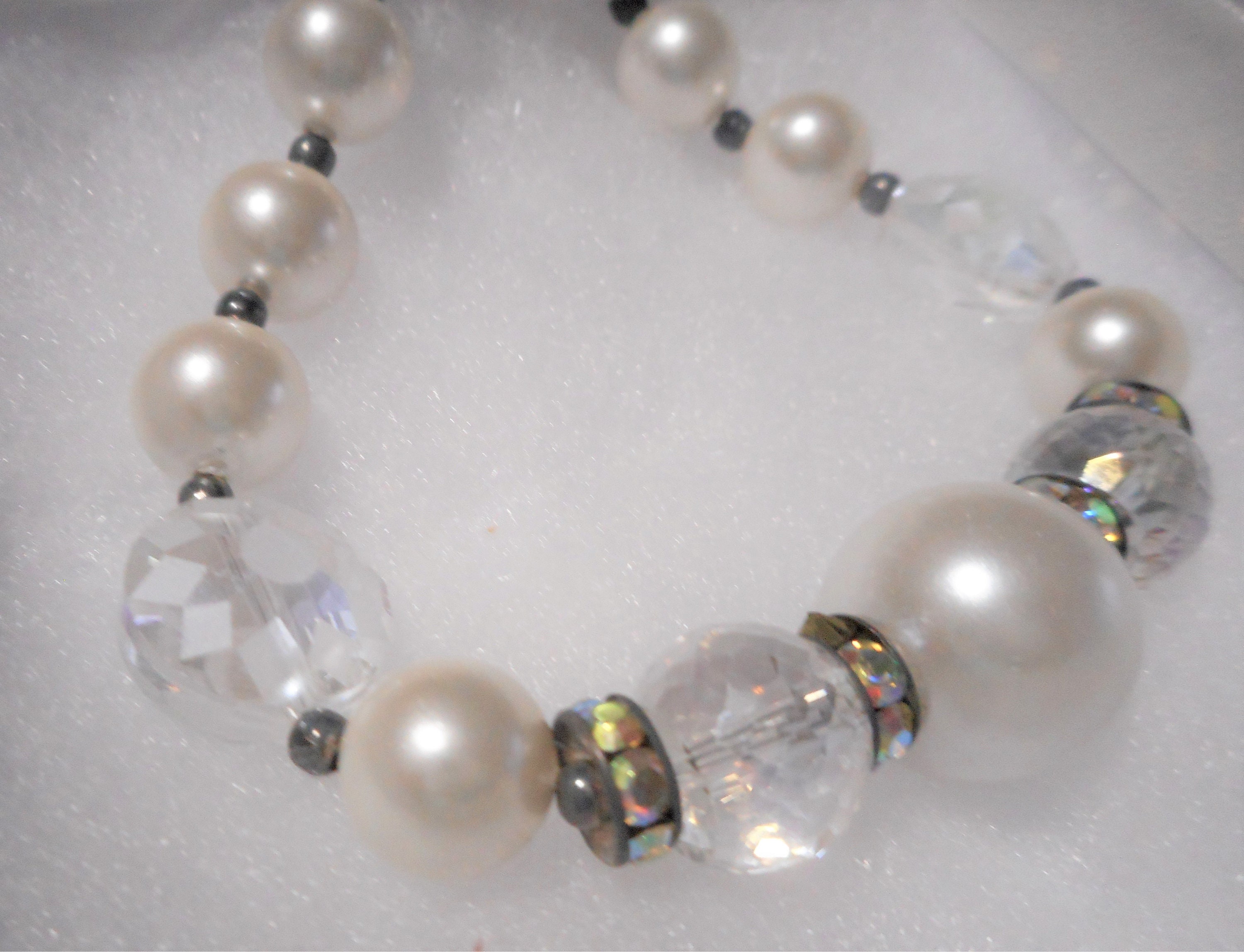 Bracelet: 6 1/2", stretch bracelet with 10mm & 16mm glass pearls. Faceted crystal beads