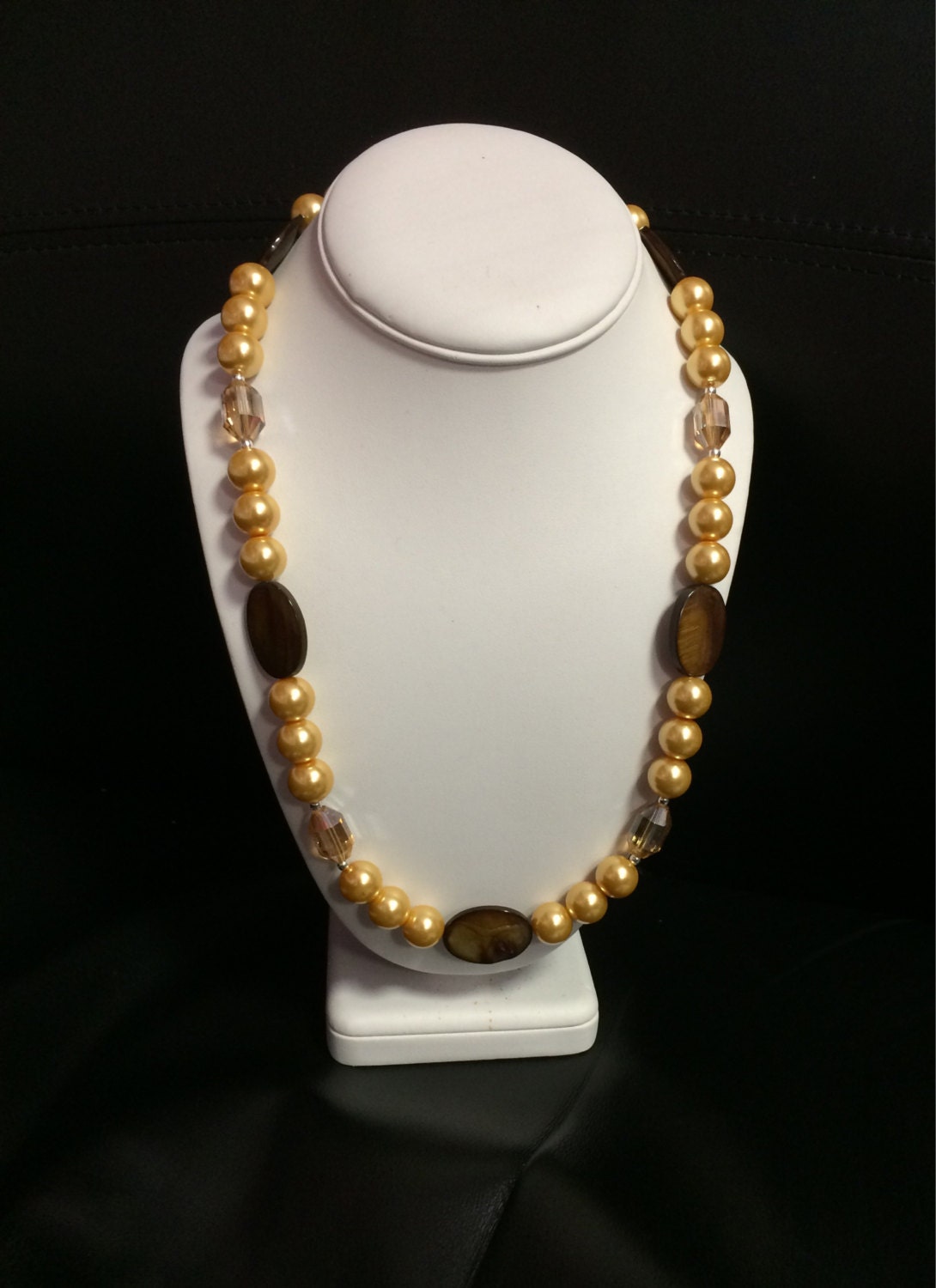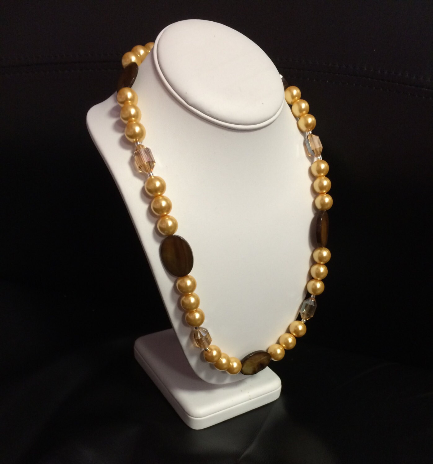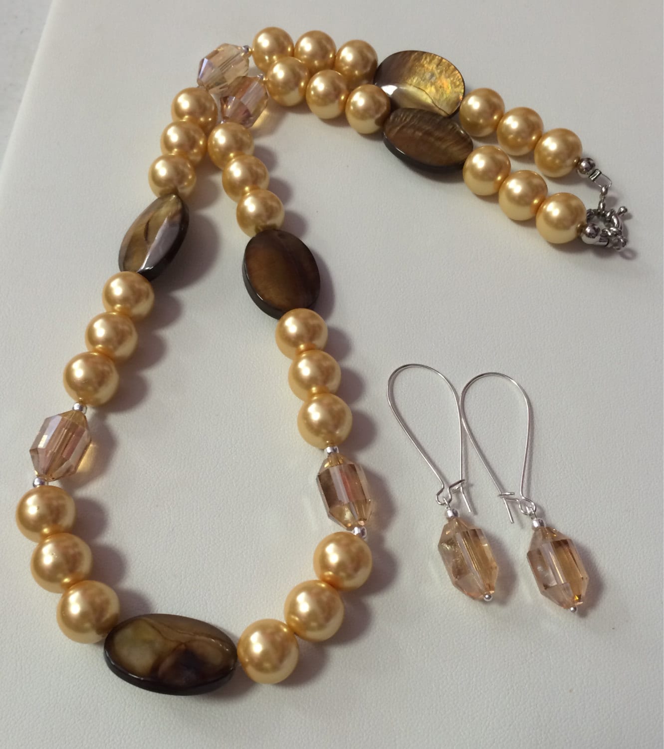 Yellow Glass Pearl Crystal & Brown Mother of Pearl Shell Necklace Earring Set, Pearl Set, Beaded Necklace Set, Shell Jewelry, Pearl Jewelry