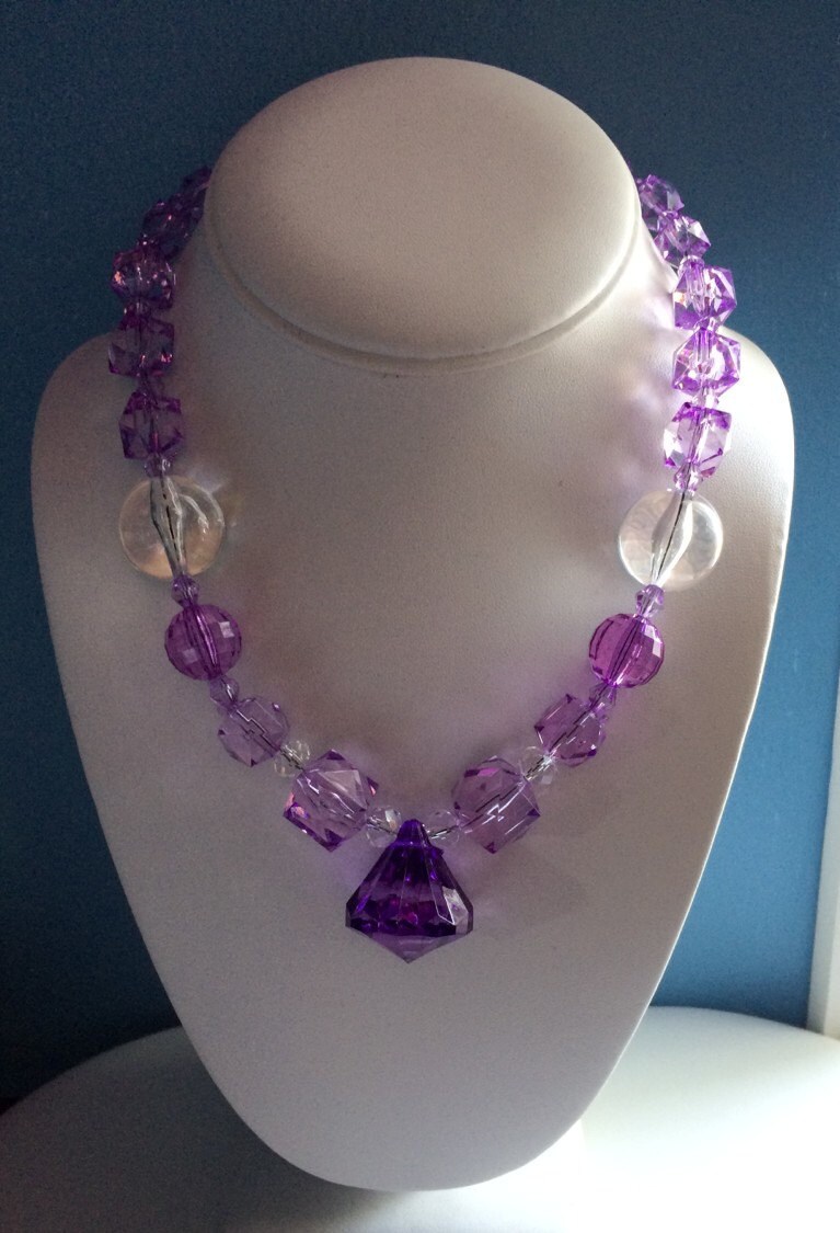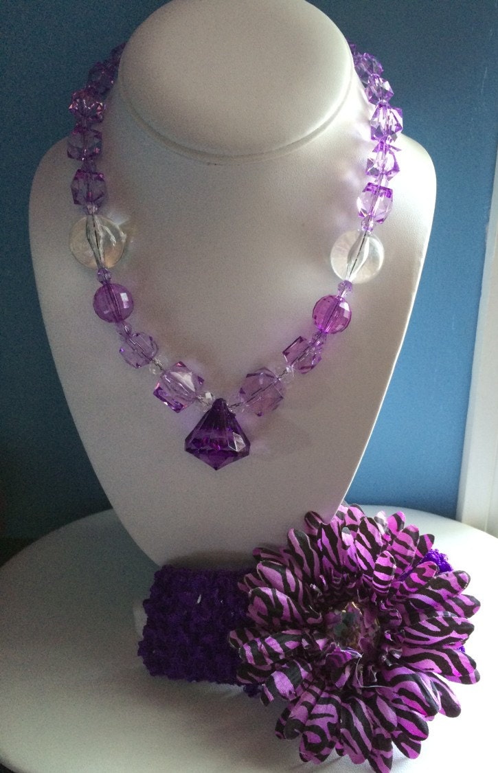 3 piece set includes: Purple Bubblegum chunky beaded necklace, stretch headband & flower hair clip