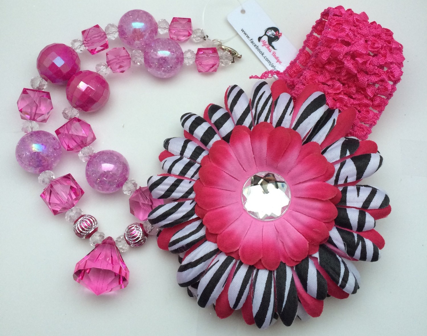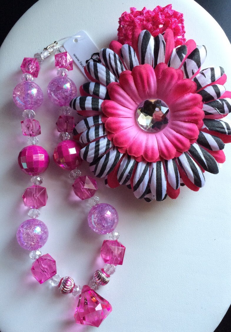 Girls Hot Pink Bubblegum Beaded Necklace, Stretch Headband, Flower Clip Gift Set, bubblegum jewelry, Birthday necklace, First Birthday