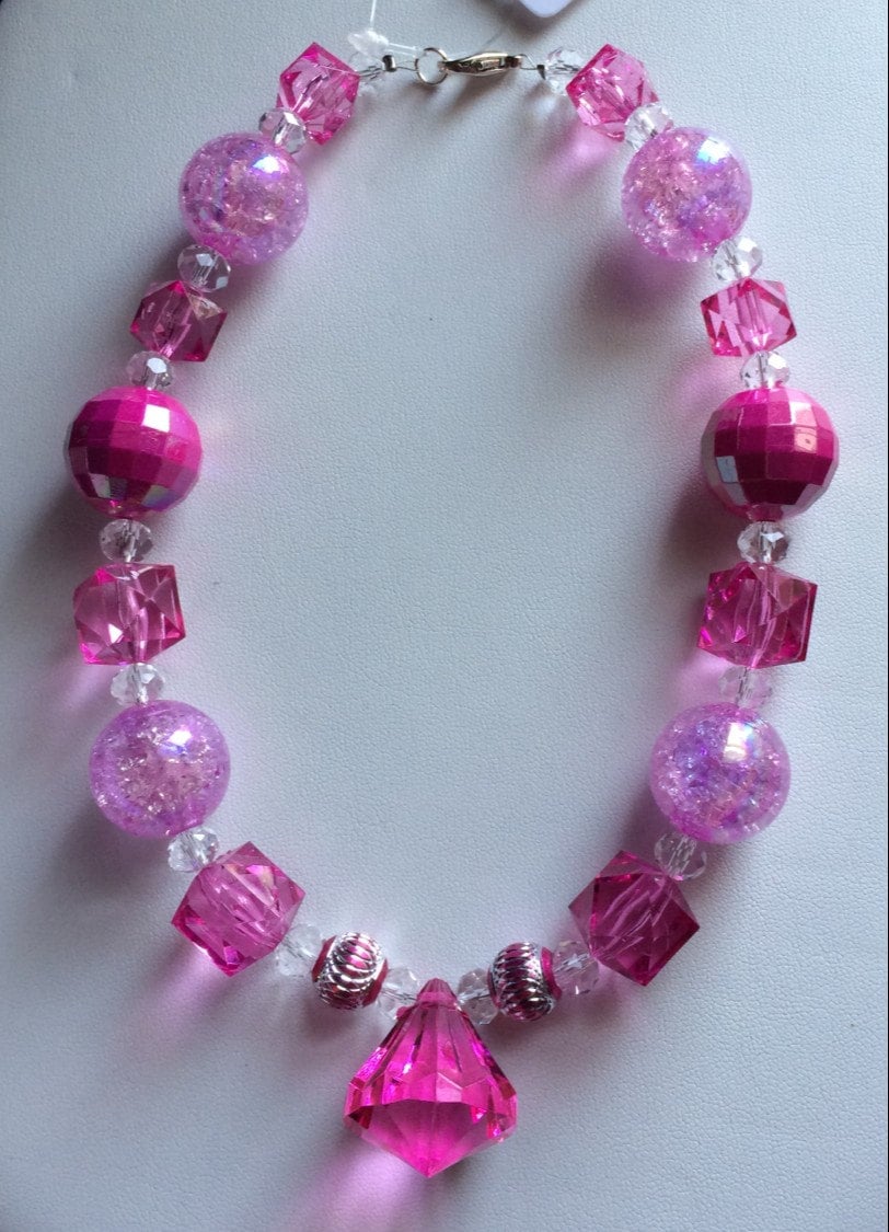 3 piece set includes: Hot Pink Bubblegum chunky beaded necklace, stretch headband & flower hair clip