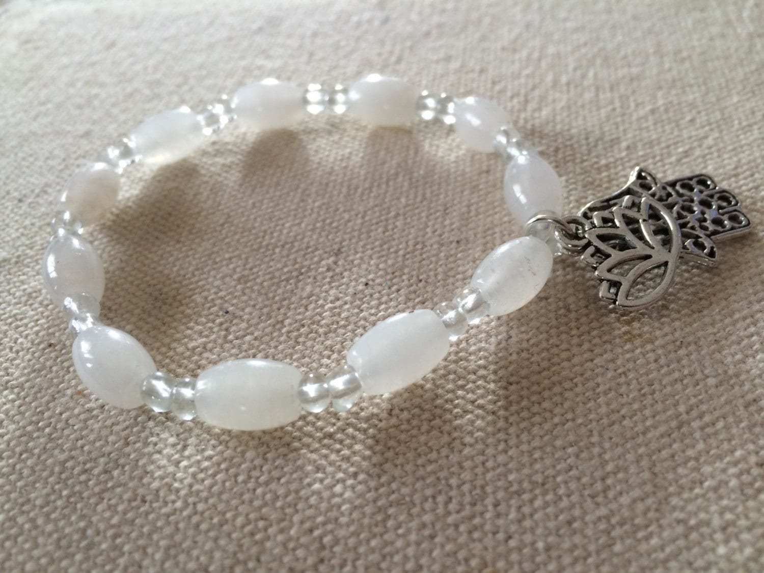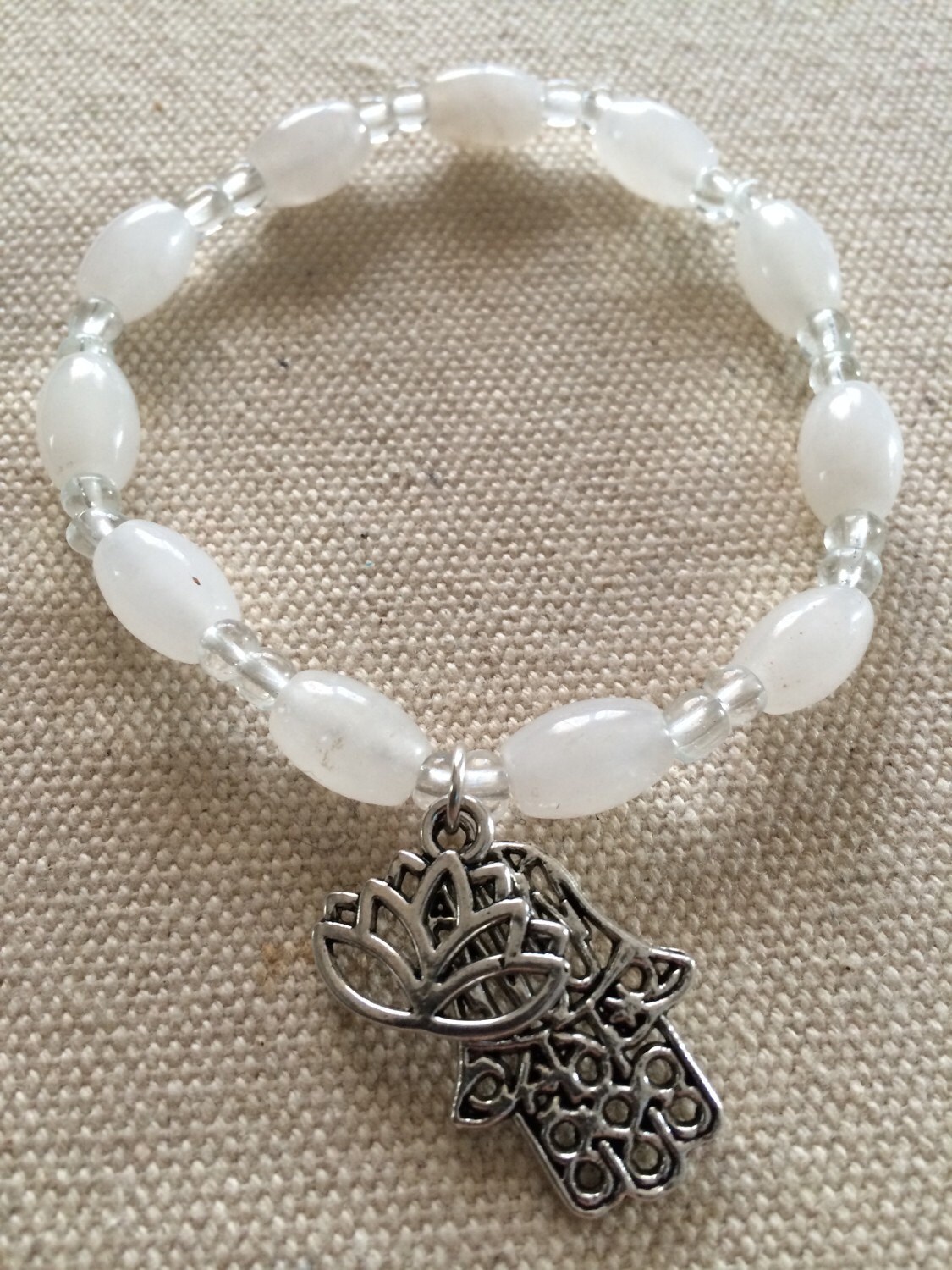 Hamsa & Lotus White Jade Crystal Gemstone Bracelet, Hand of Fatima Bracelet; luck stone, Reiki, Hamsa jewelry, yoga jewelry, Namaste jewelry