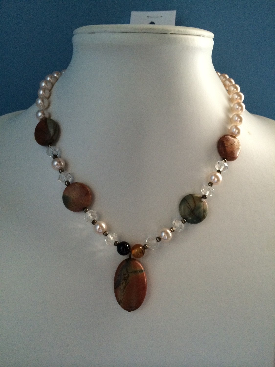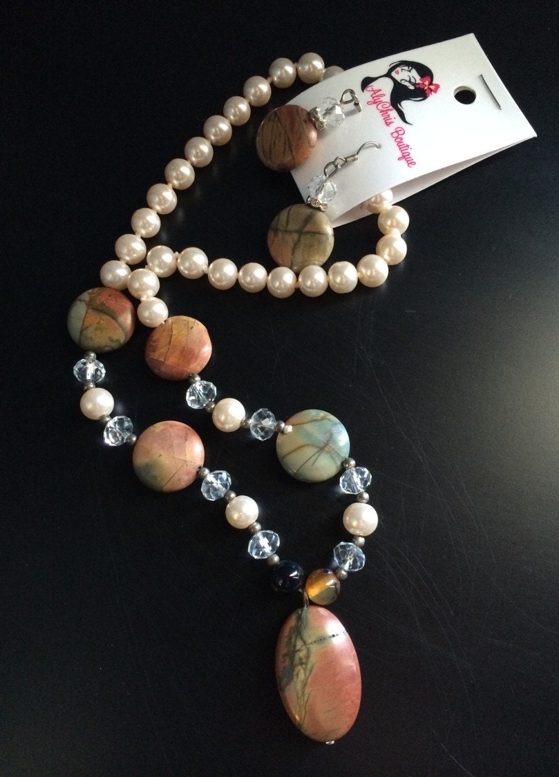 Jasper & Agate Gemstone Pink Glass Pearl Crystal Beads Necklace Earring Set