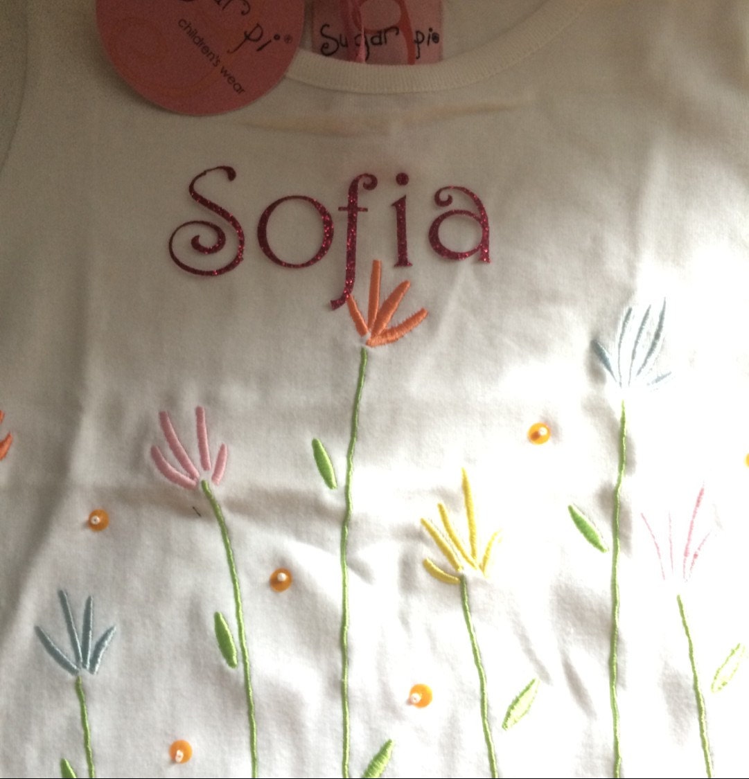 White Short sleeve embroidered floral design top. Personalized with child's name in quality glitter vinyl.