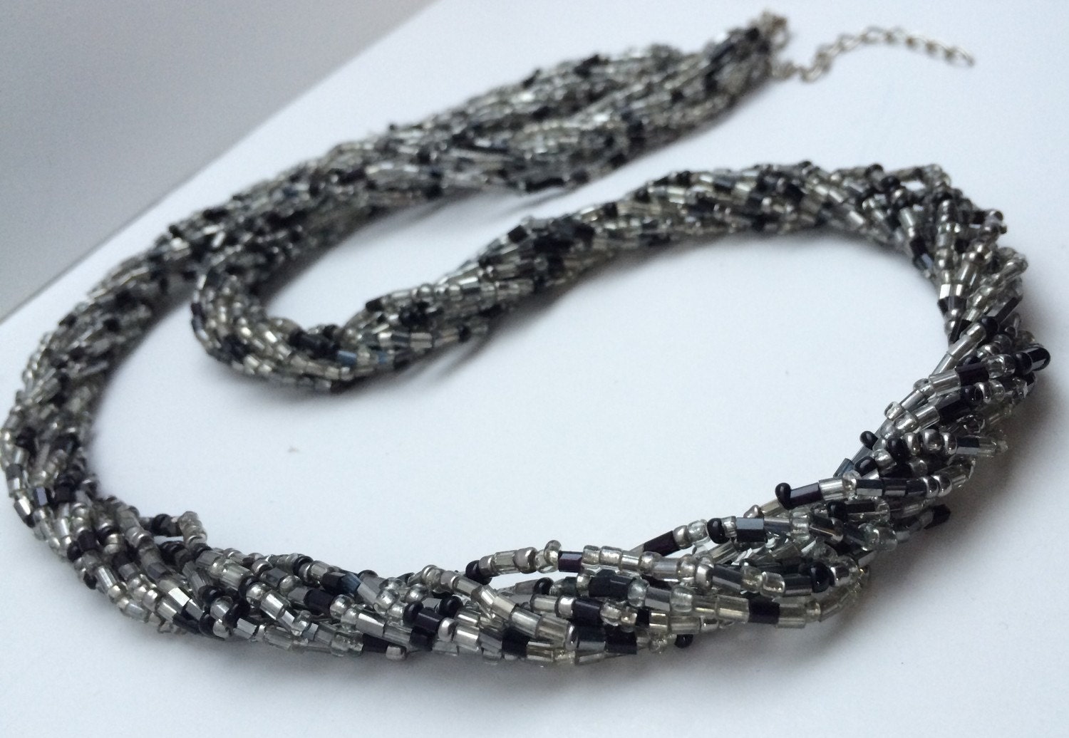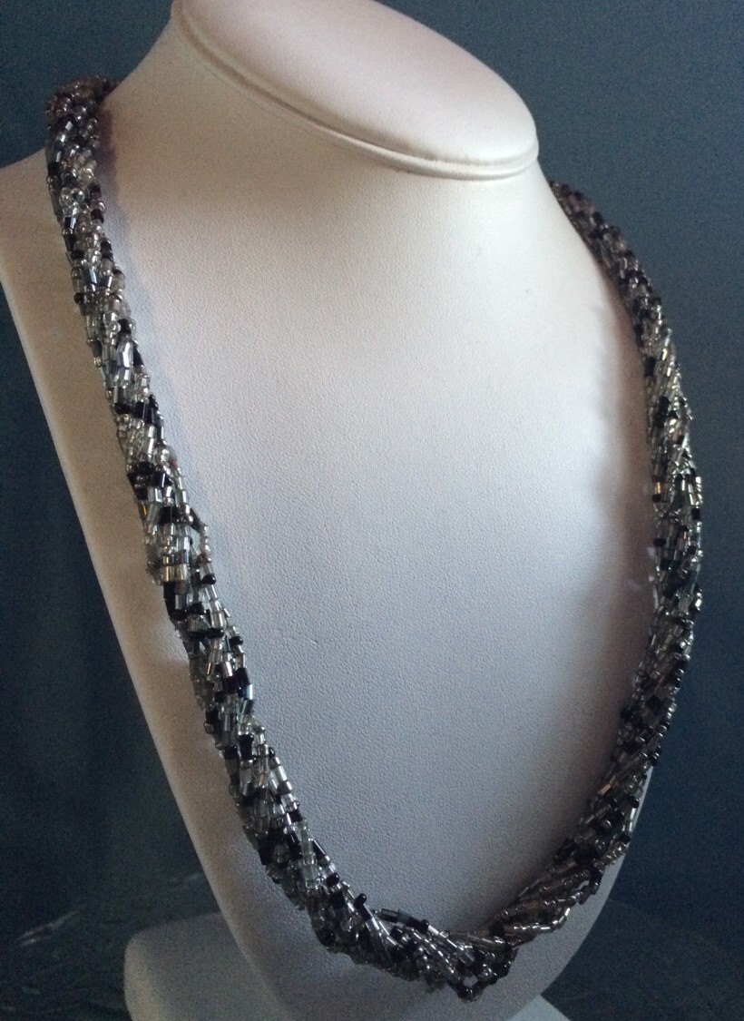 Multi Strand Twisted Black & Silver Seed Bead Necklace, Seed bead jewelry