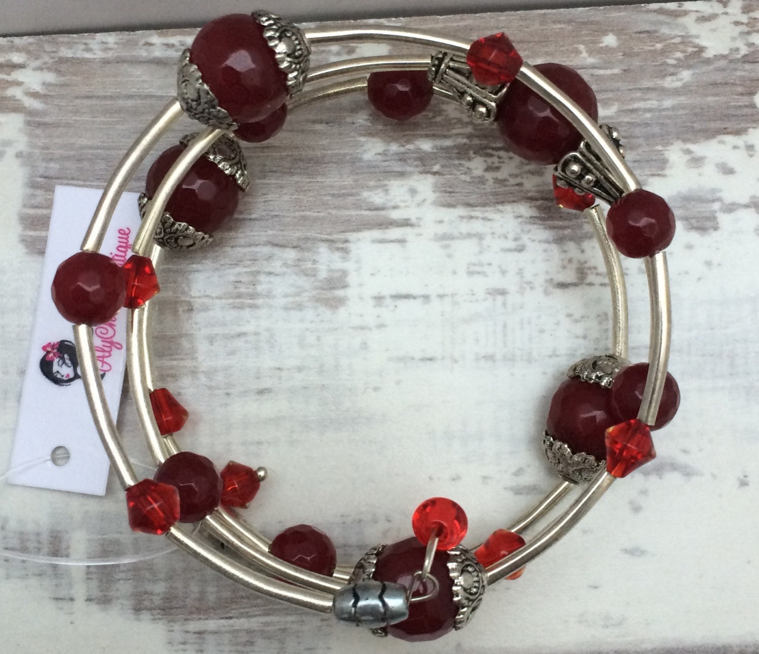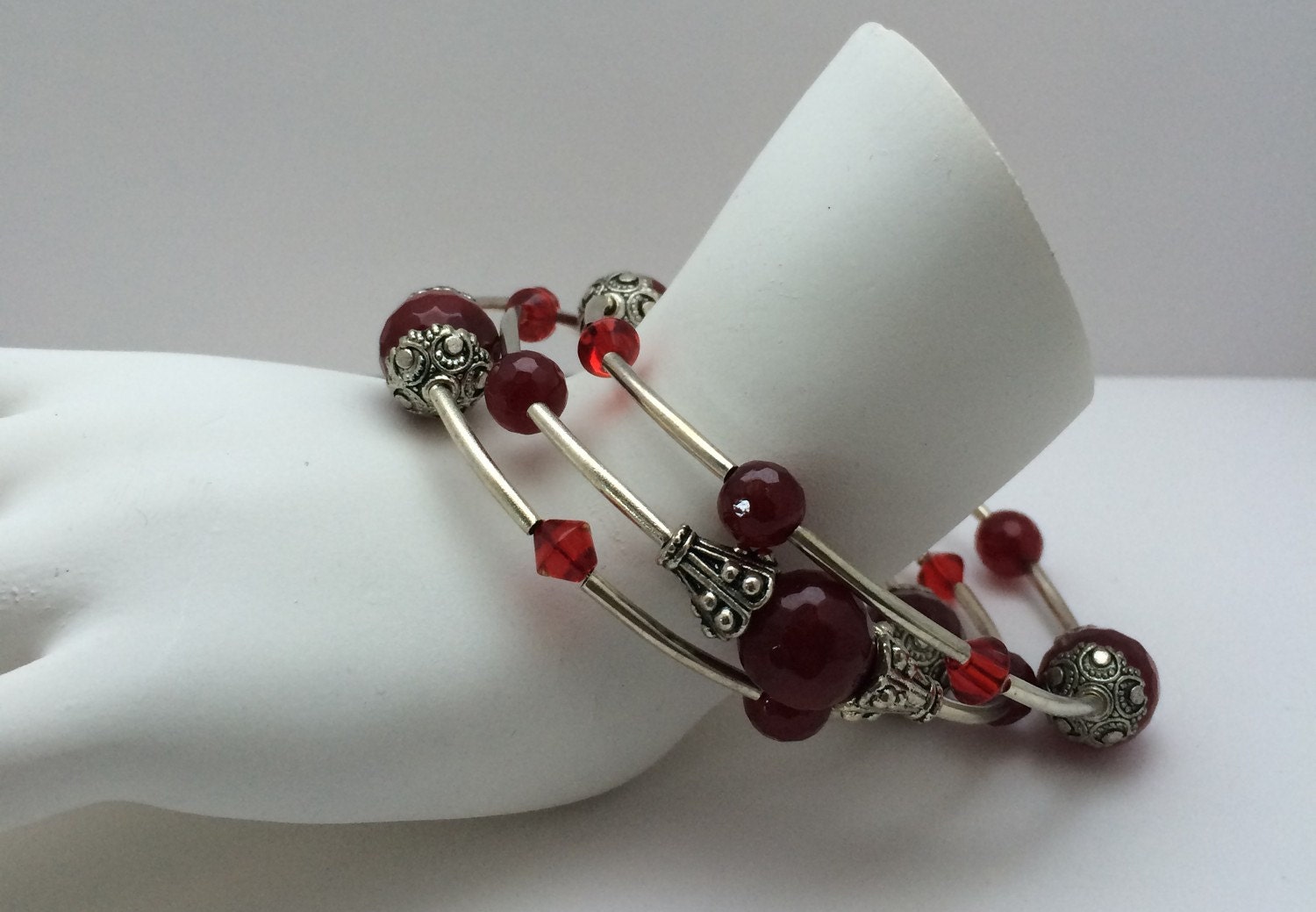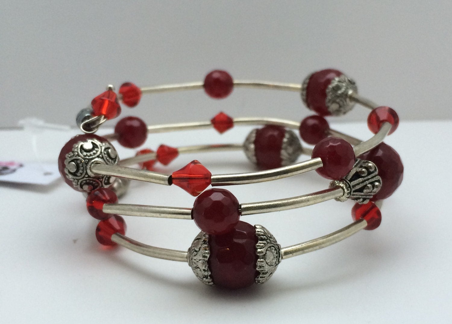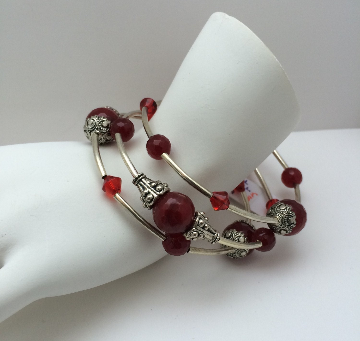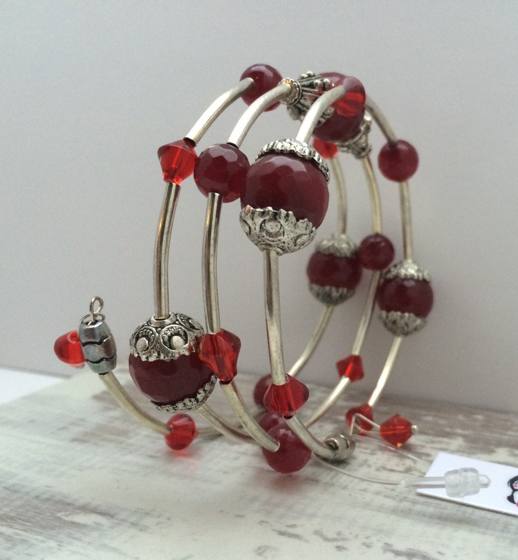 Red Jade Gemstone Bead Memory Wrap Bracelet; gifts for her, beaded bracelet, jade bracelet, layered bracelet, boho bracelet, Memory Wire
