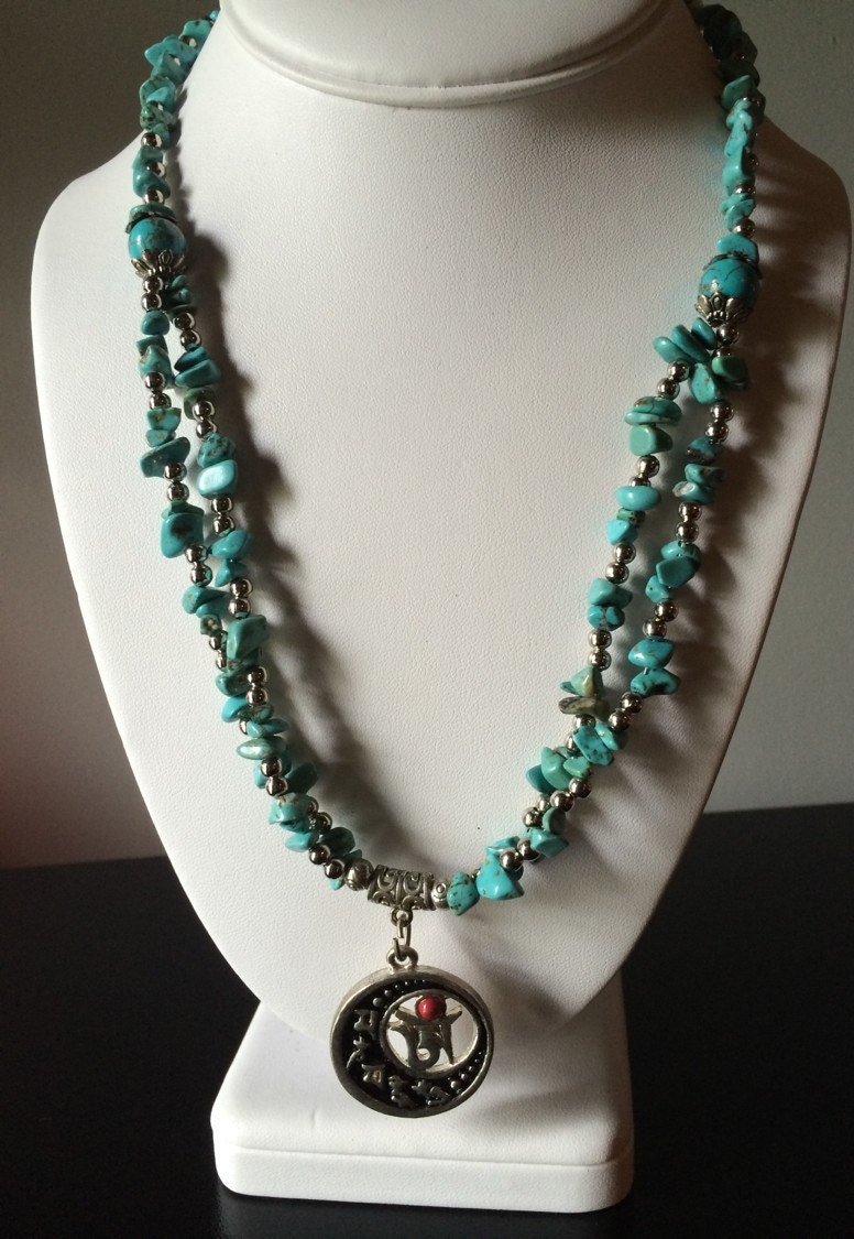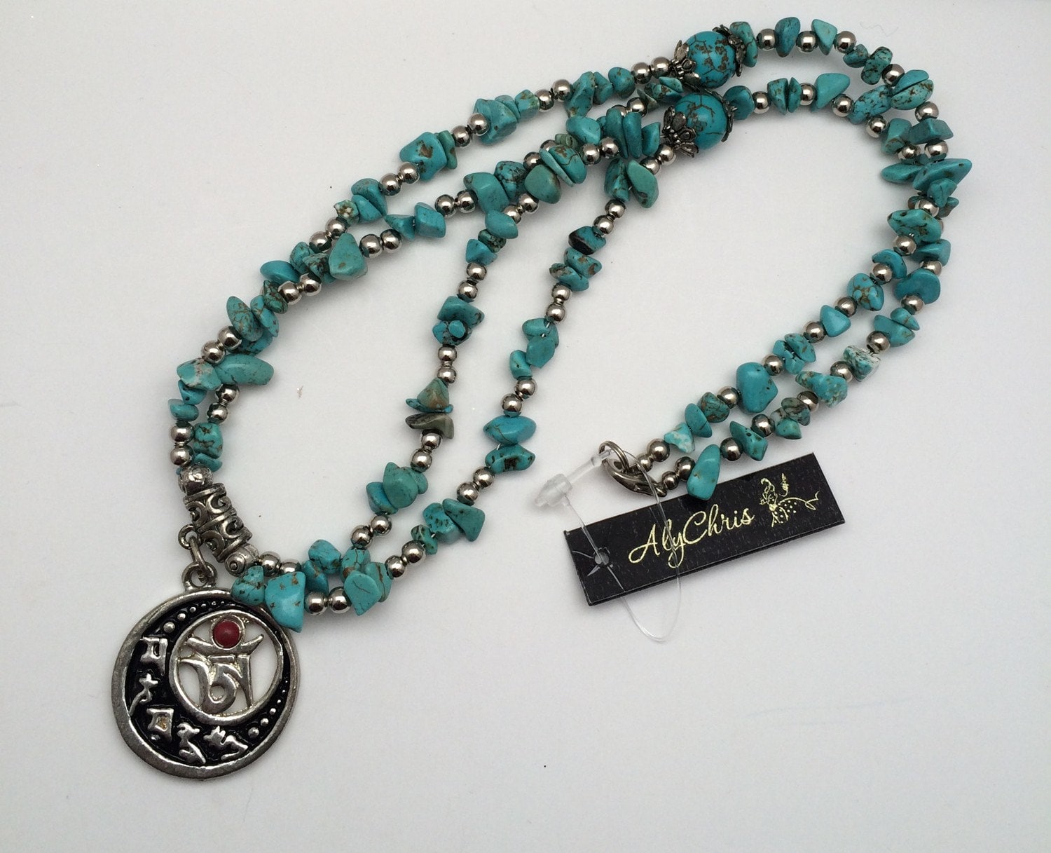 Turquenite Gemstone Beaded Medallion Pendant Necklace; turquoise necklace, turquoise jewelry, gifts, gemstone chip necklace