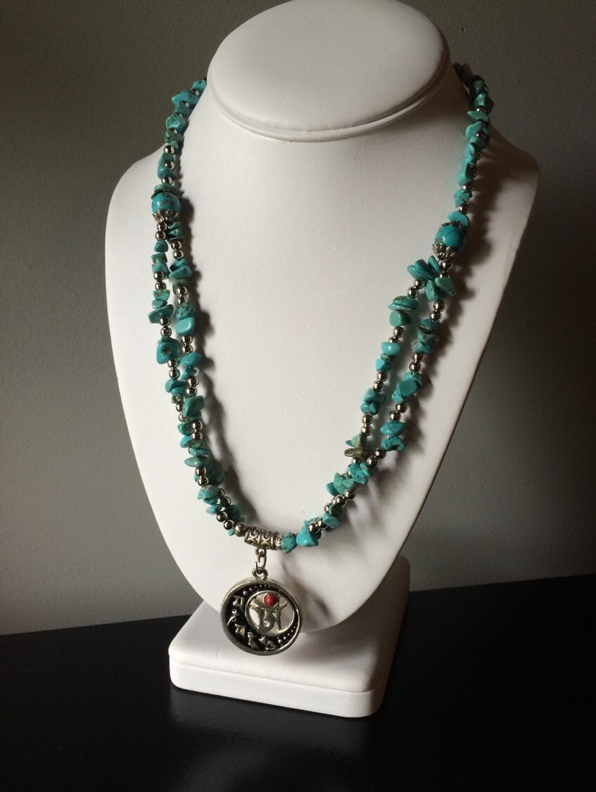 Turquenite Gemstone Beaded Medallion Pendant Necklace; turquoise necklace, turquoise jewelry, gifts, gemstone chip necklace, gifts, heart pendant