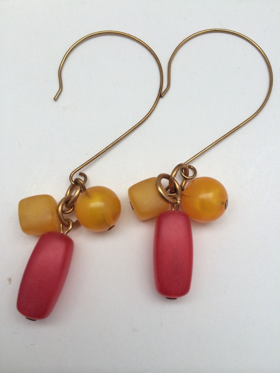 Dangle Earrings, Beaded drop earrings, Red & Yellow frosted bead earrings