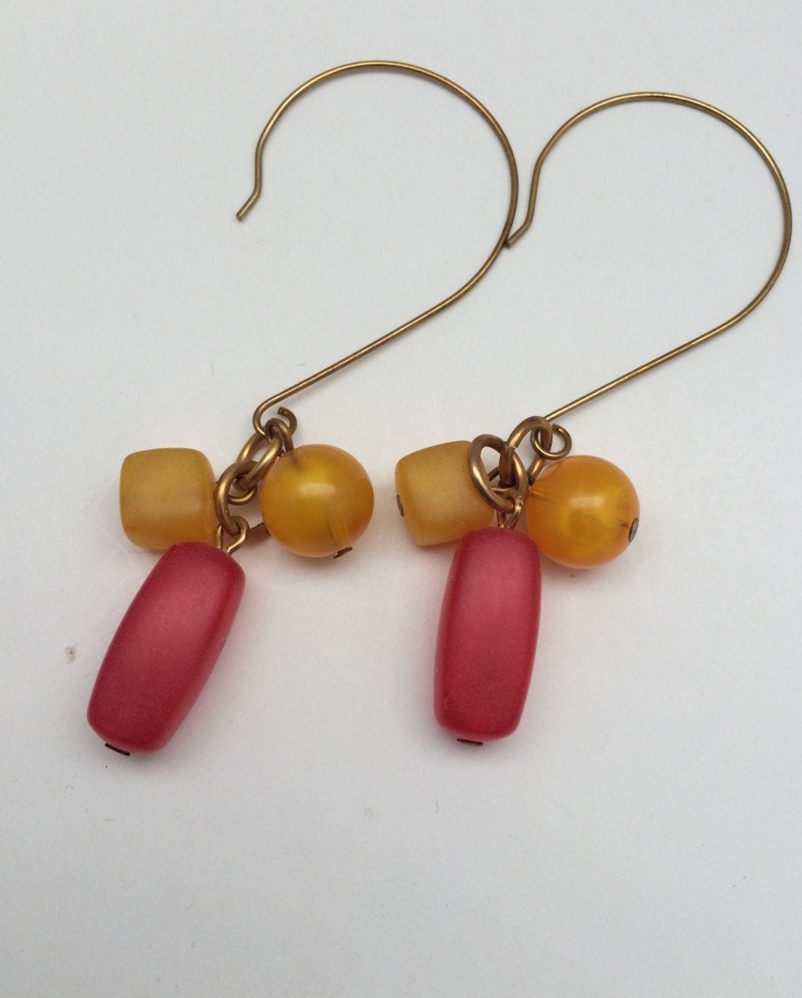 Dangle Earrings, Beaded drop earrings, Red & Yellow frosted bead earrings, bohemian earrings