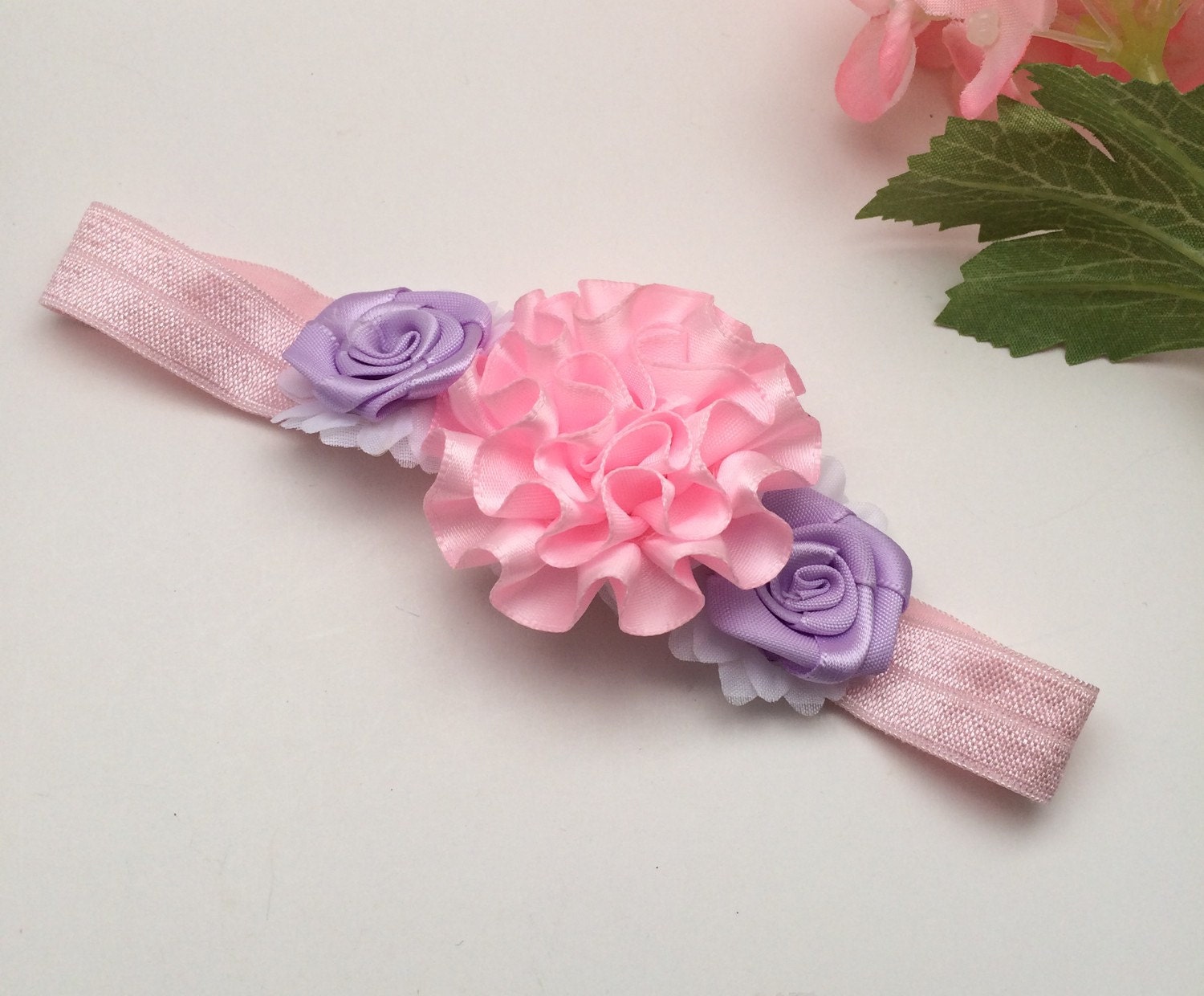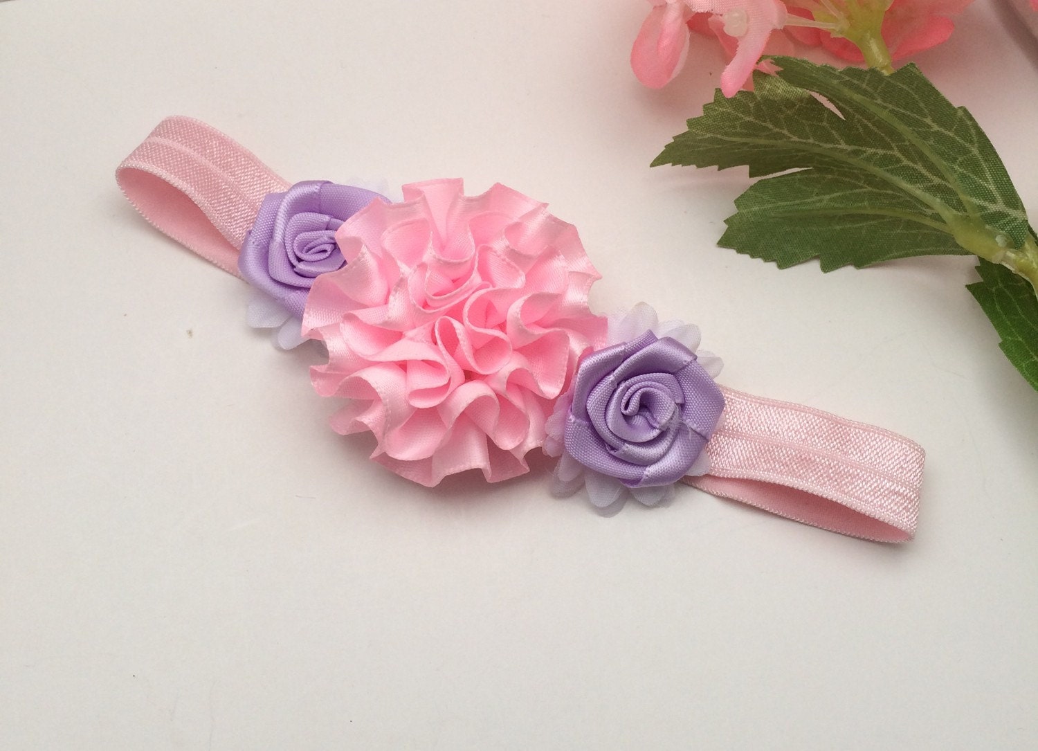 Pink satin peony flower Stretch Headband with lavender satin rosettes