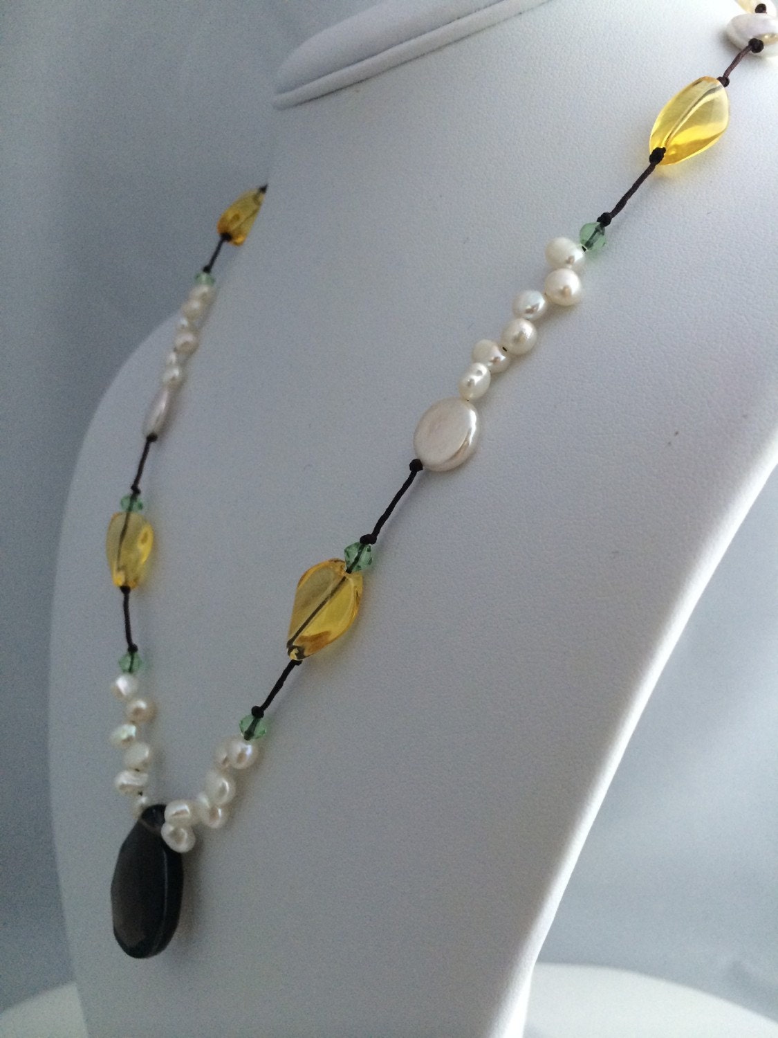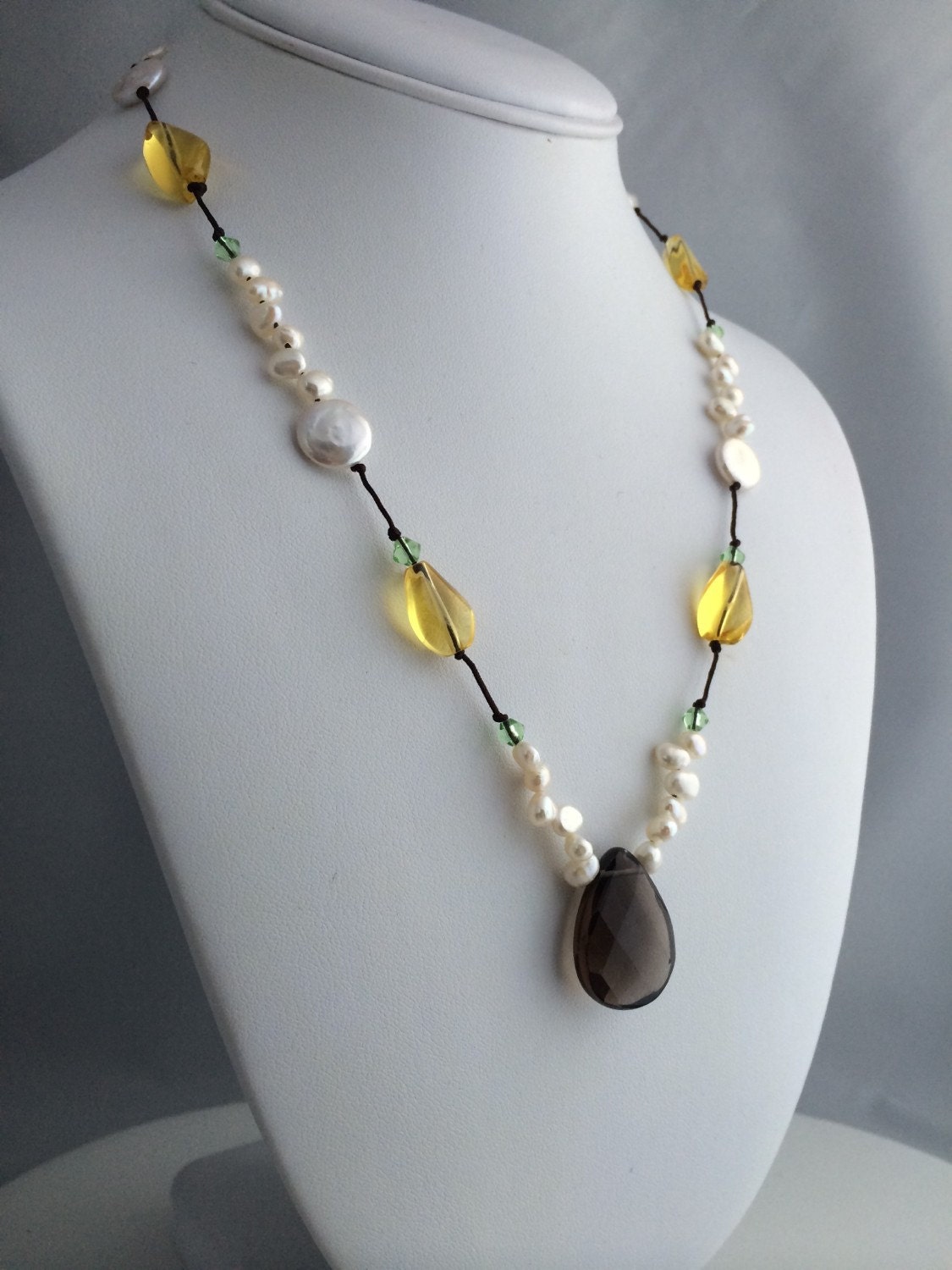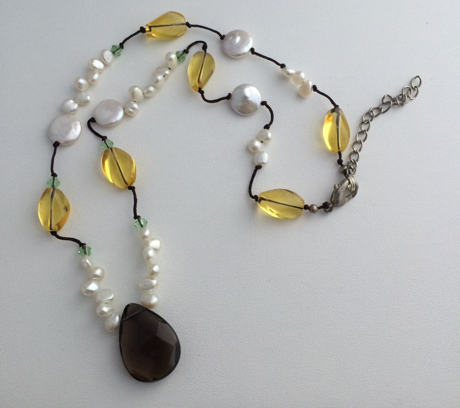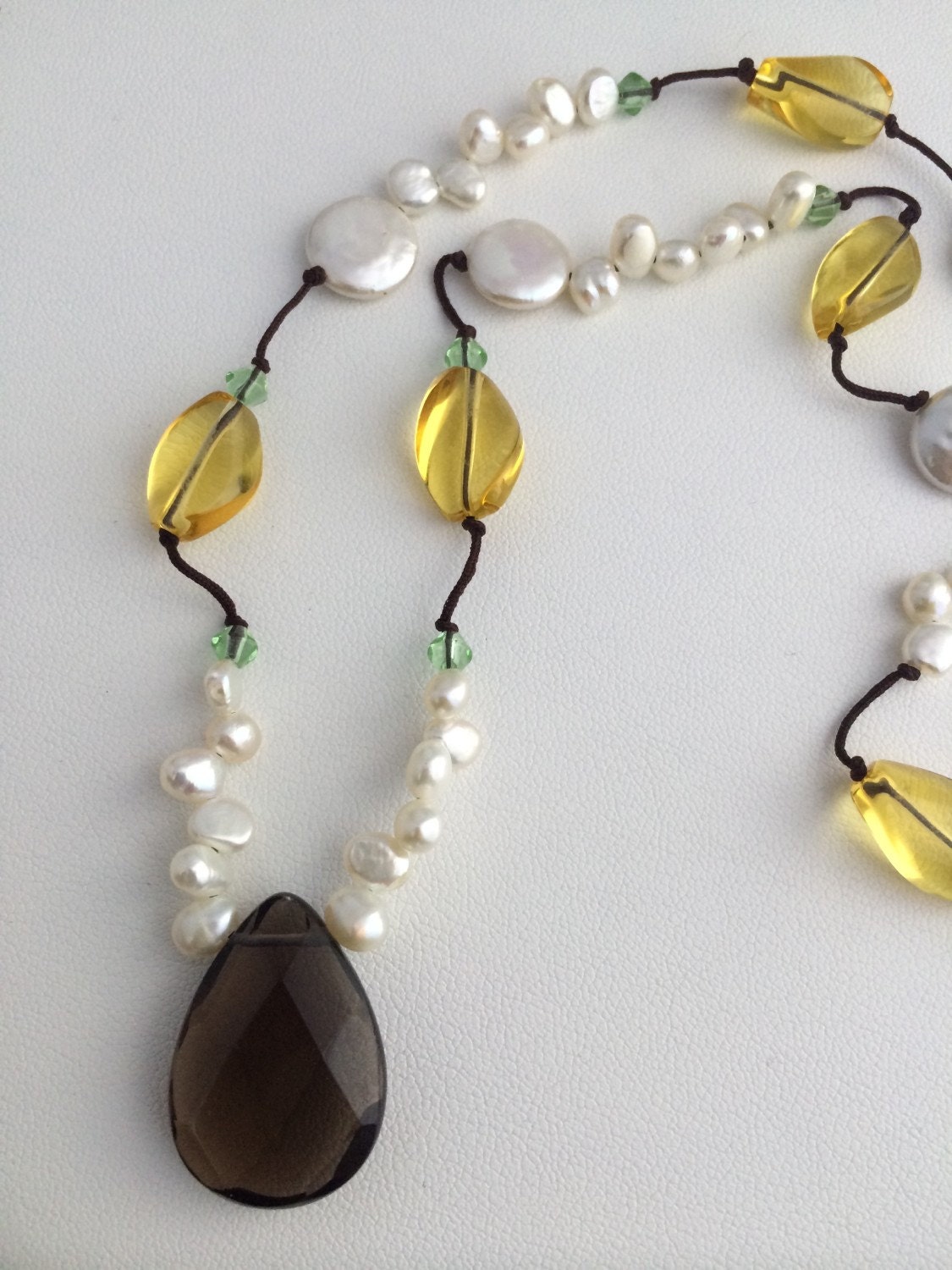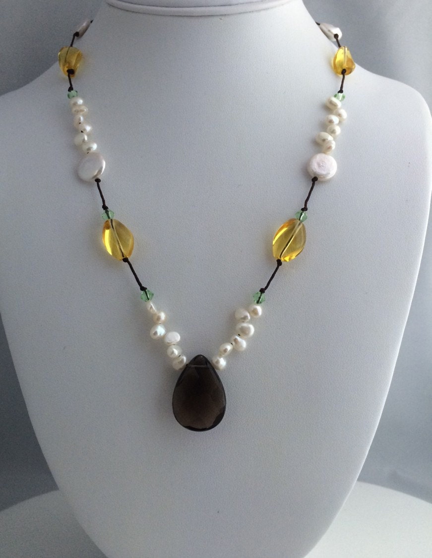 Made with white freshwater cultured pearl & coin beads, Yellow & Green crystal beads. faceted smokey quartz pendant