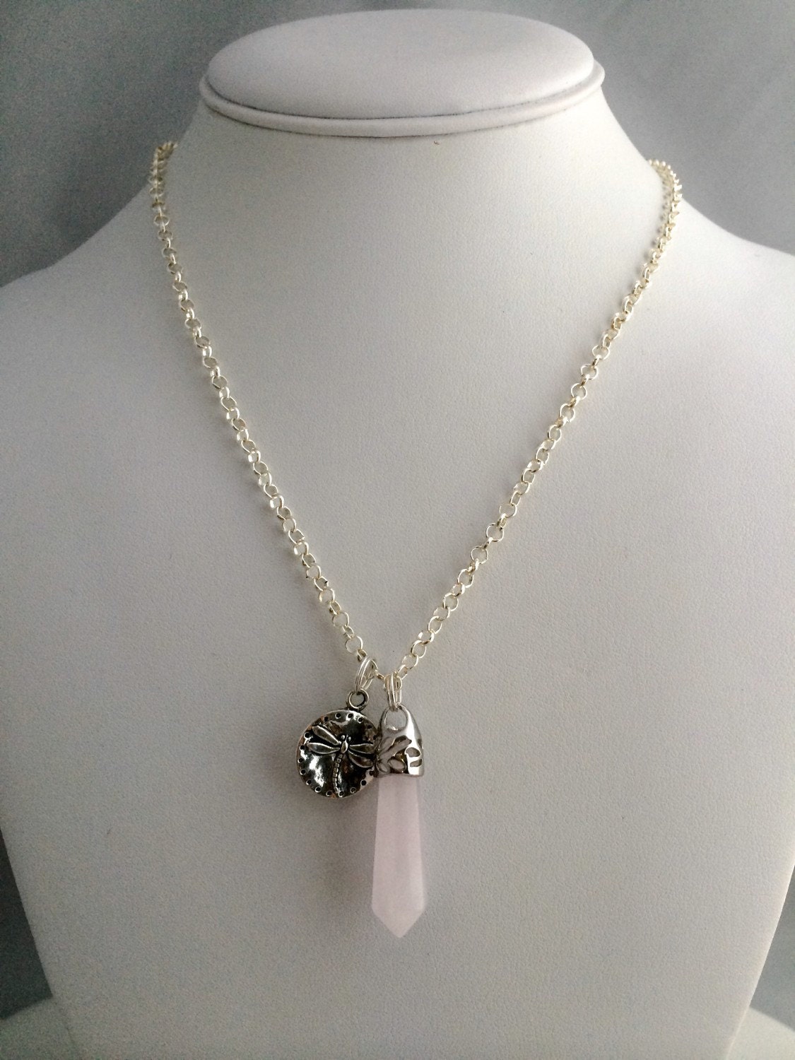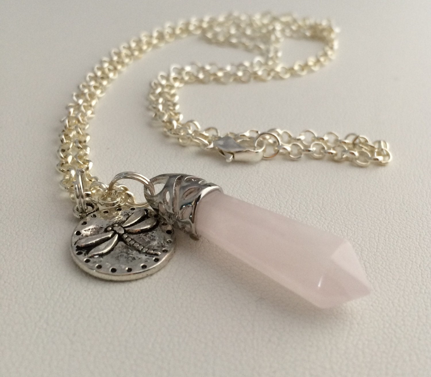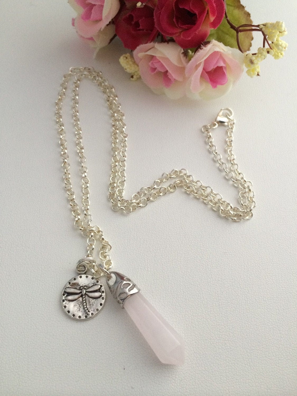 Rose Quartz Pendant Dragonfly Charm necklace, Reiki necklace, quartz pendant, Yoga jewelry, gemstone necklace, Chakra necklace, Full Moon