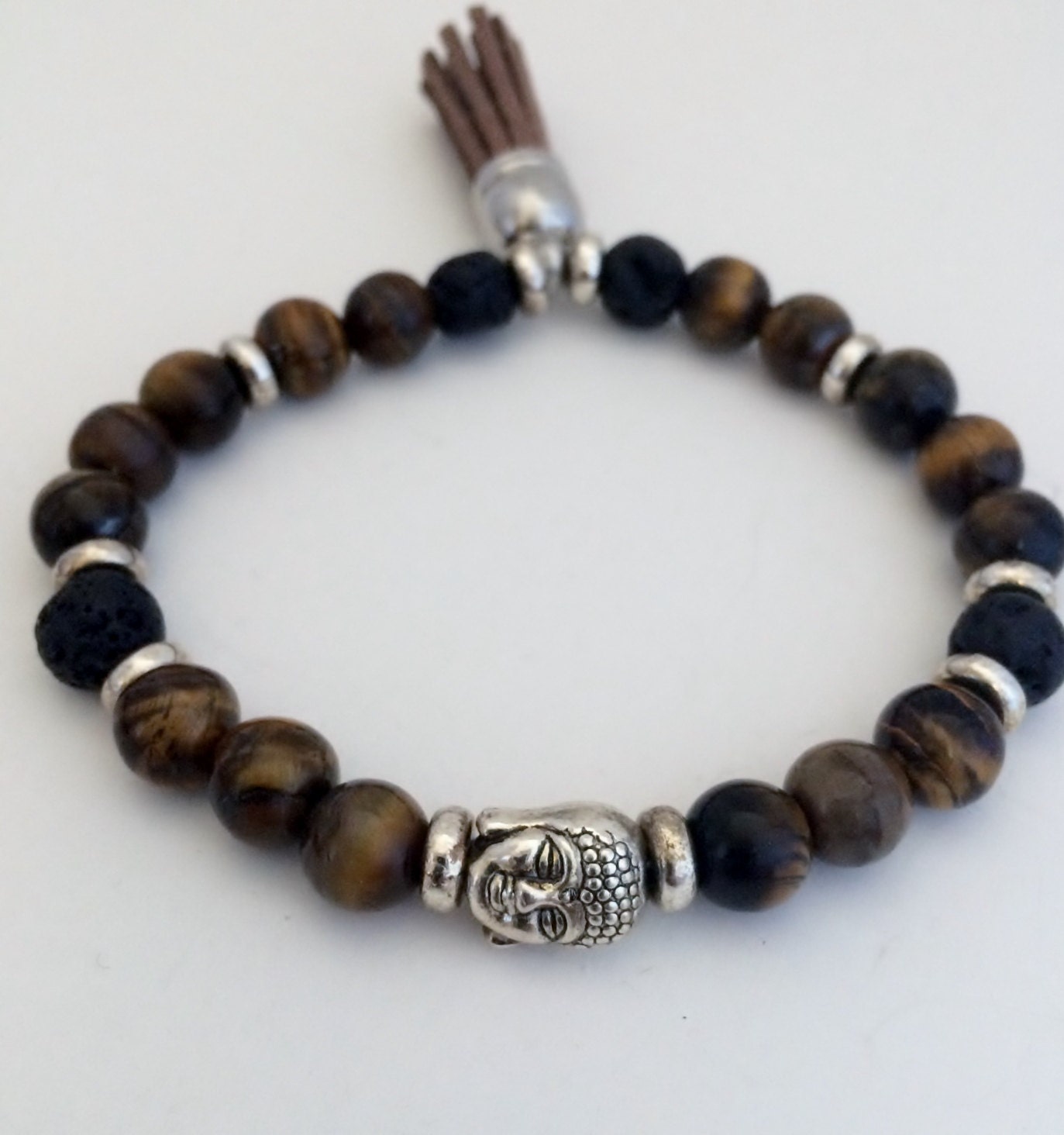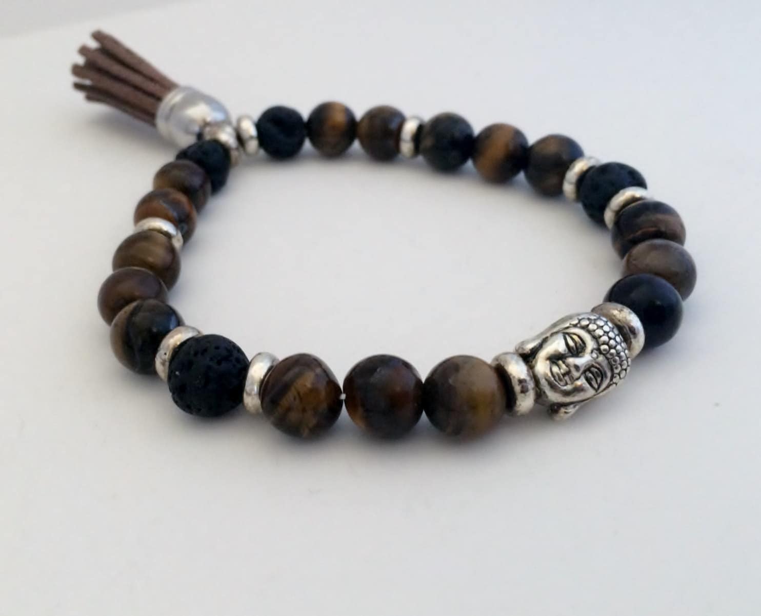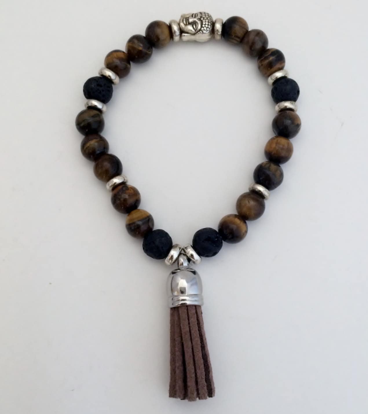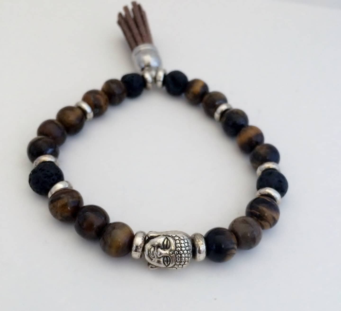 Buddha Charm Tiger Eye Gemstone Bead Stretch Bracelet: Essential Oil bracelet, Diffuser bracelet, yoga bracelet, Diffuser Jewelry