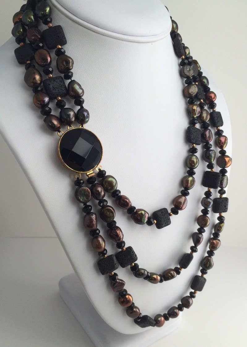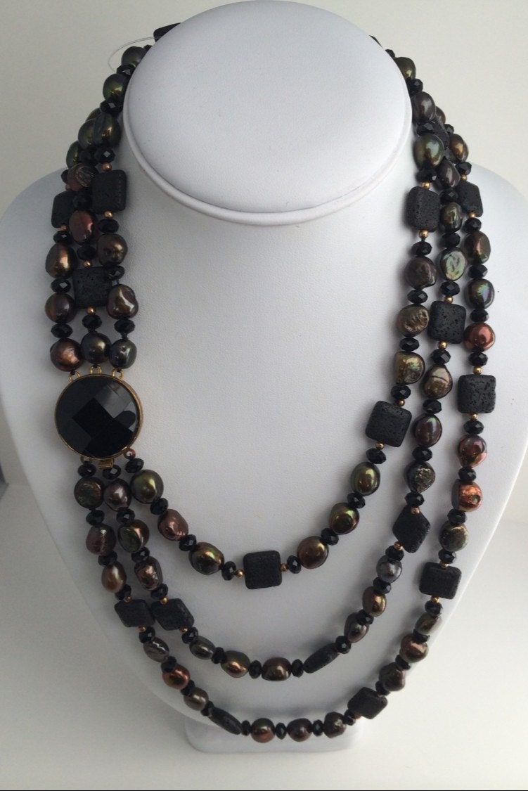 Multi Strand Cultured Freshwater Baroque Pearls & Square Lava Rock Beaded Layering Necklace