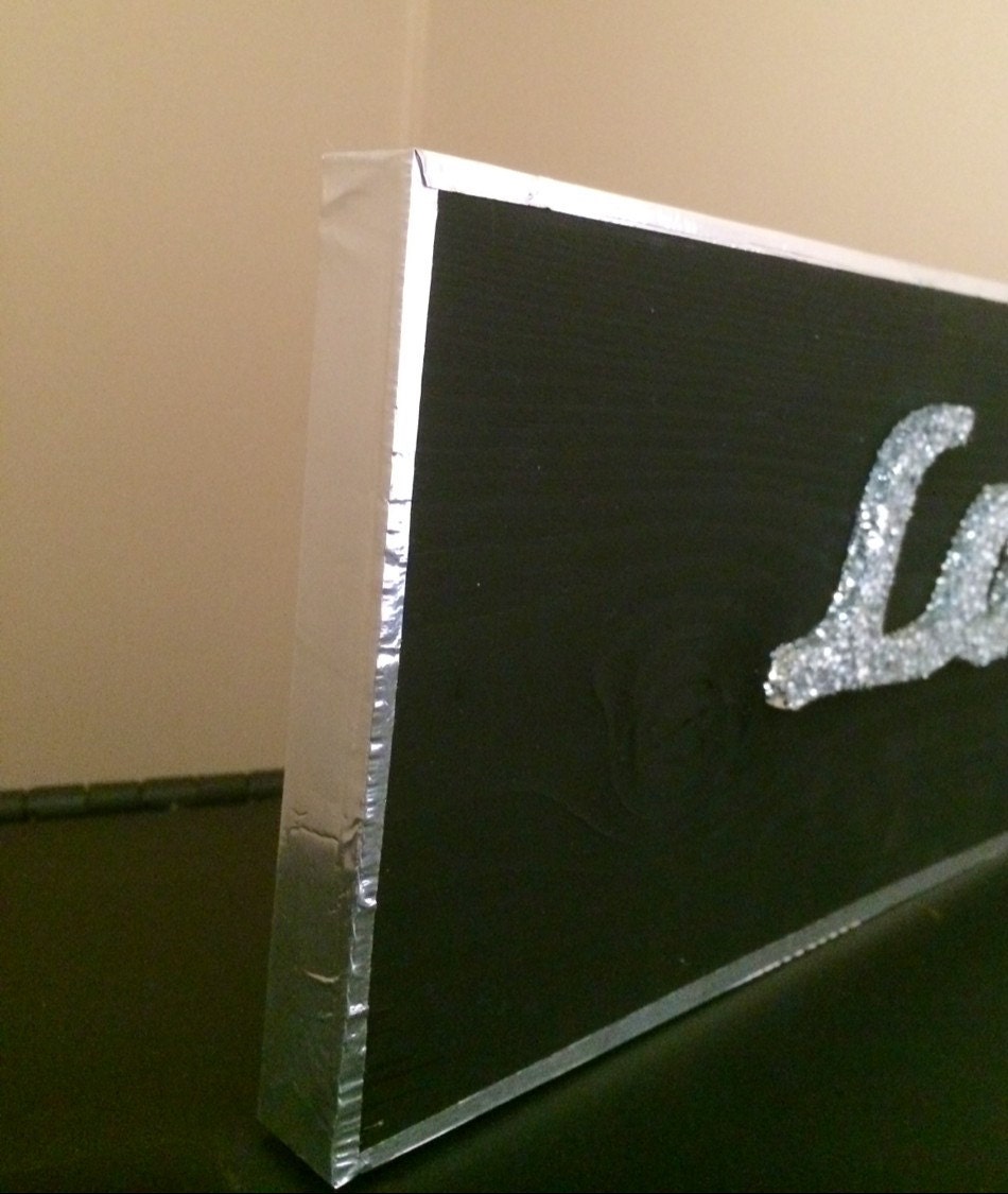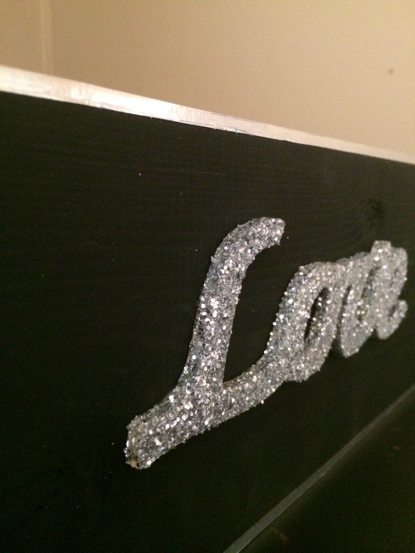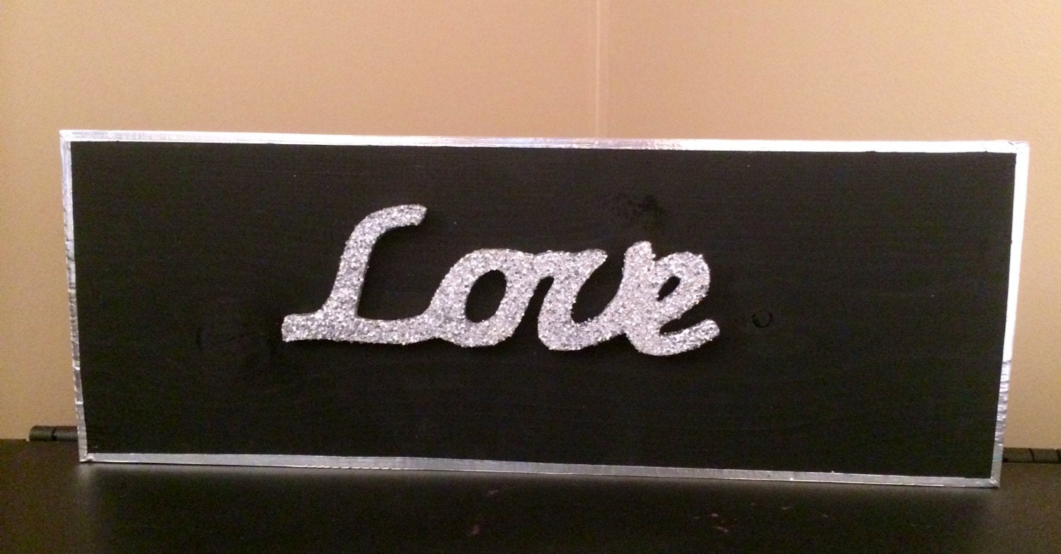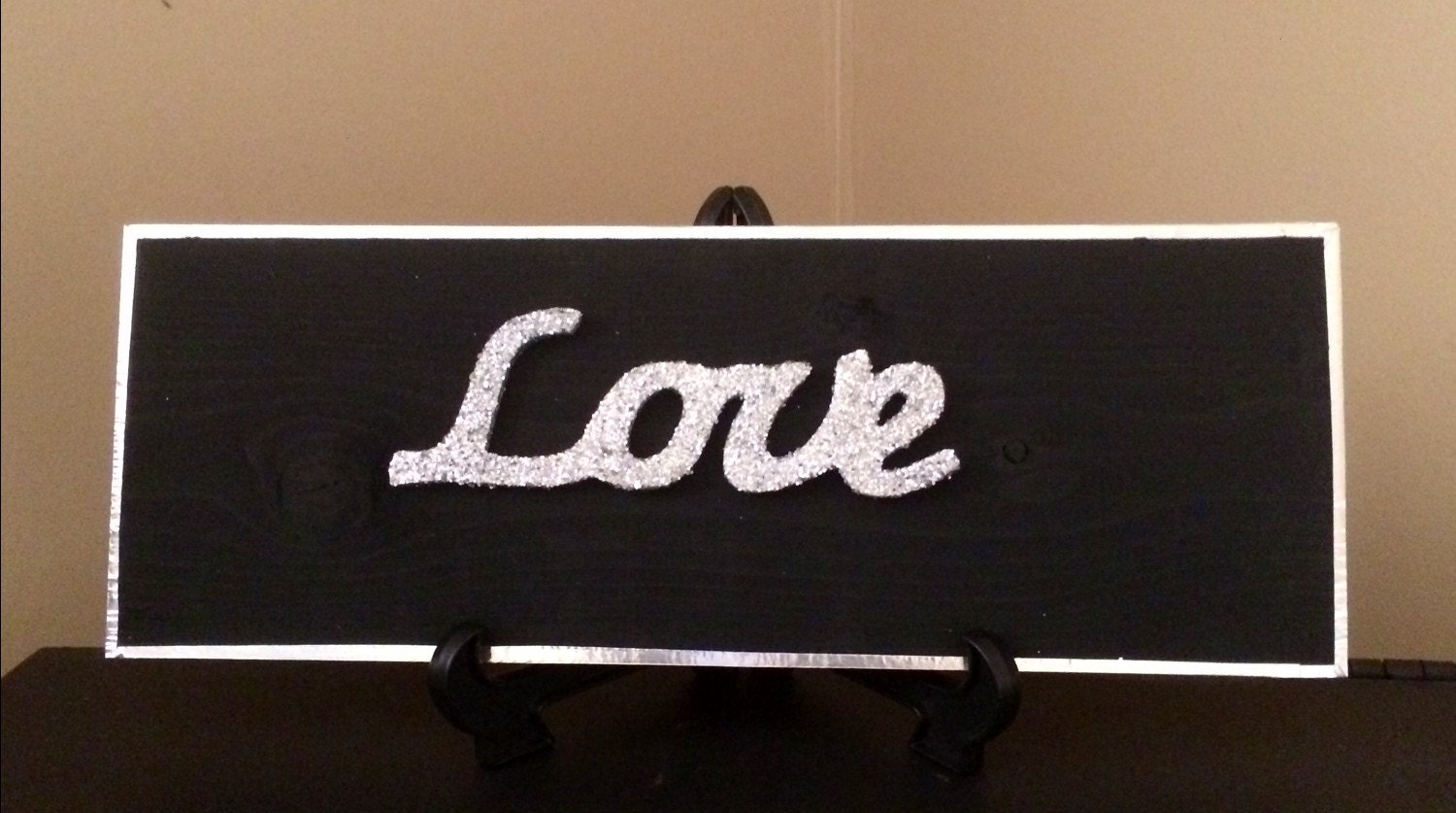 Painted with Black acrylic with silver glittered Love quote wrapped in Aluminum edging.