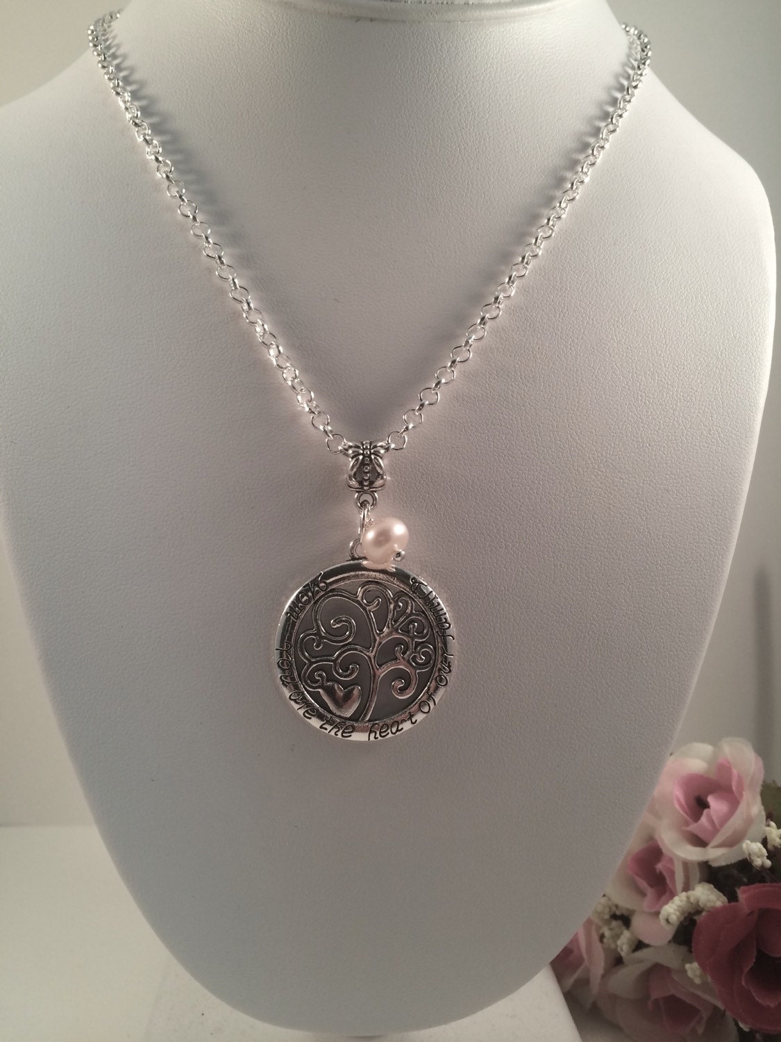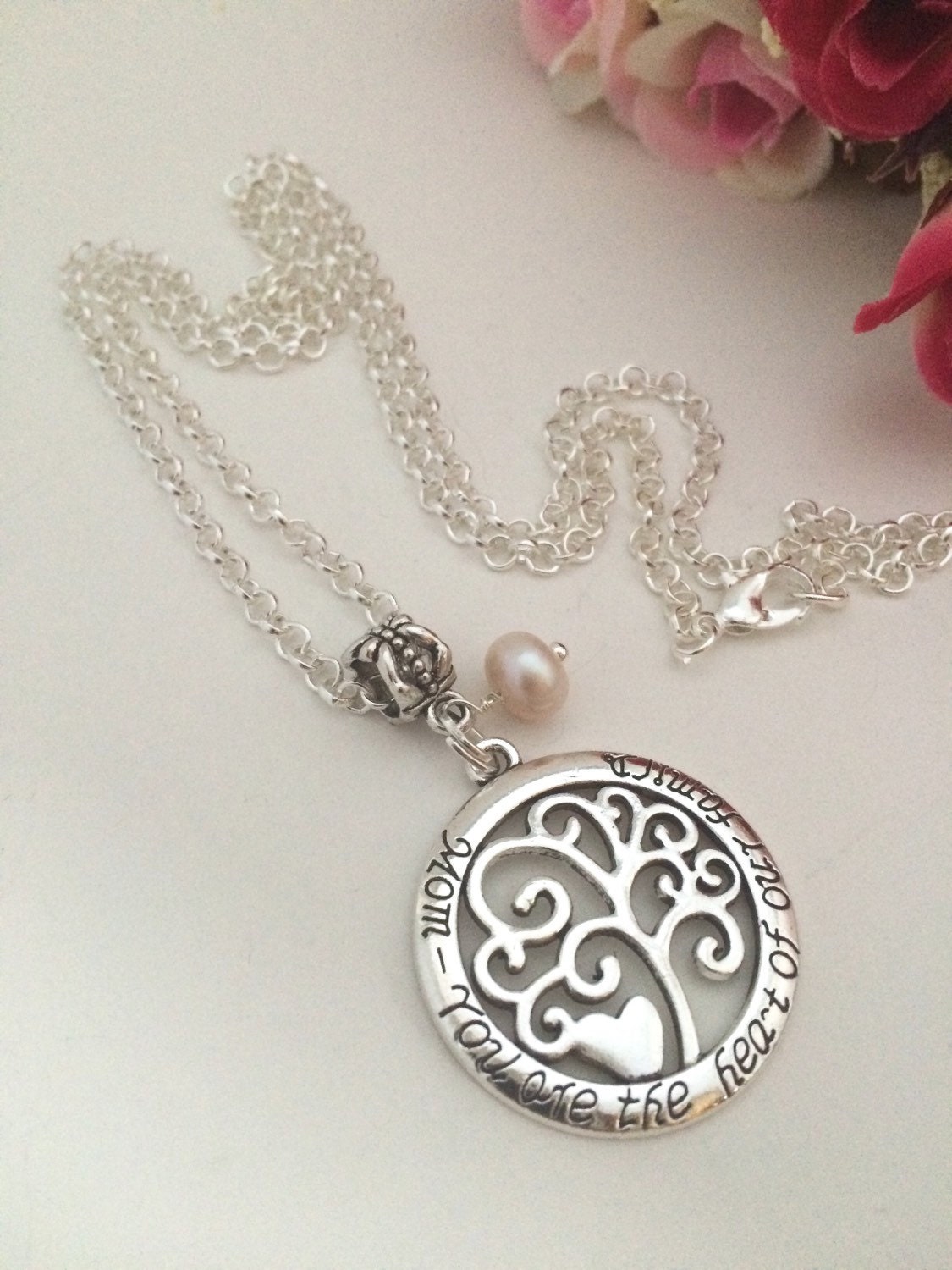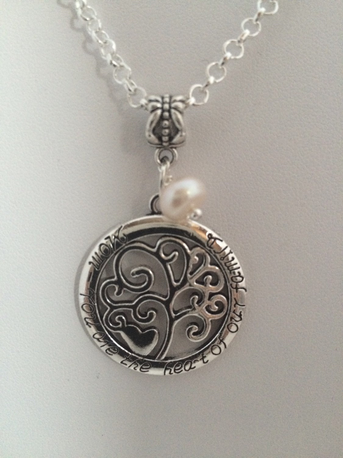 Mom Your are the Heart of our Family Stamped Pendant Necklace with Cultured Freshwater Pearl Bead